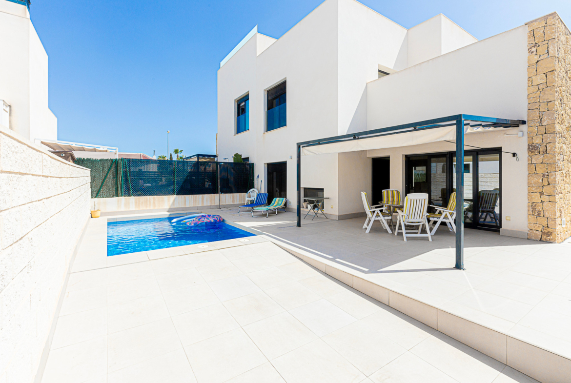 We are pleased to offer this stunning villa located in the prestigious Doña Pepa urbanization, in Ciudad Quesada, Rojales. With a spacious plot of 201 m², this property stands out for its excellent layout and numerous extras that ensure a comfortable and modern life.