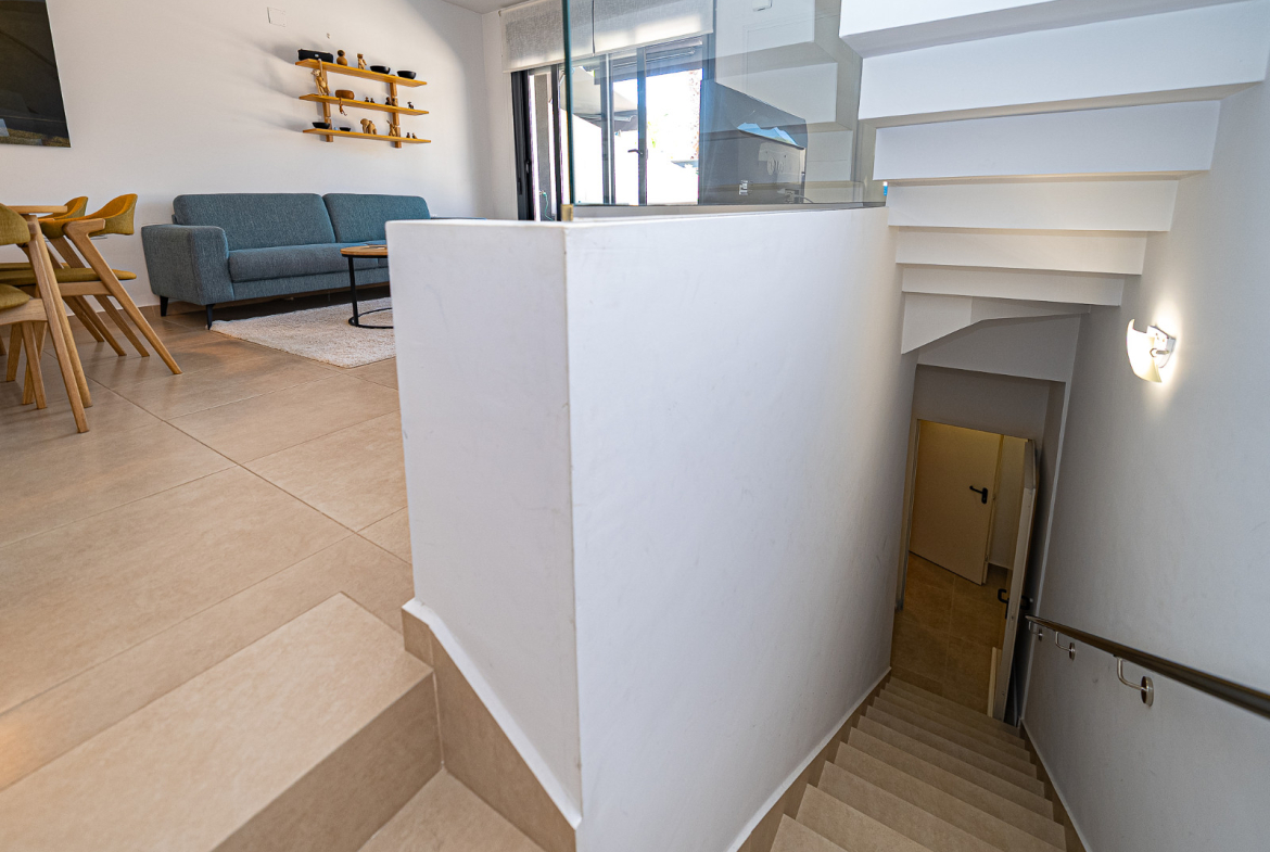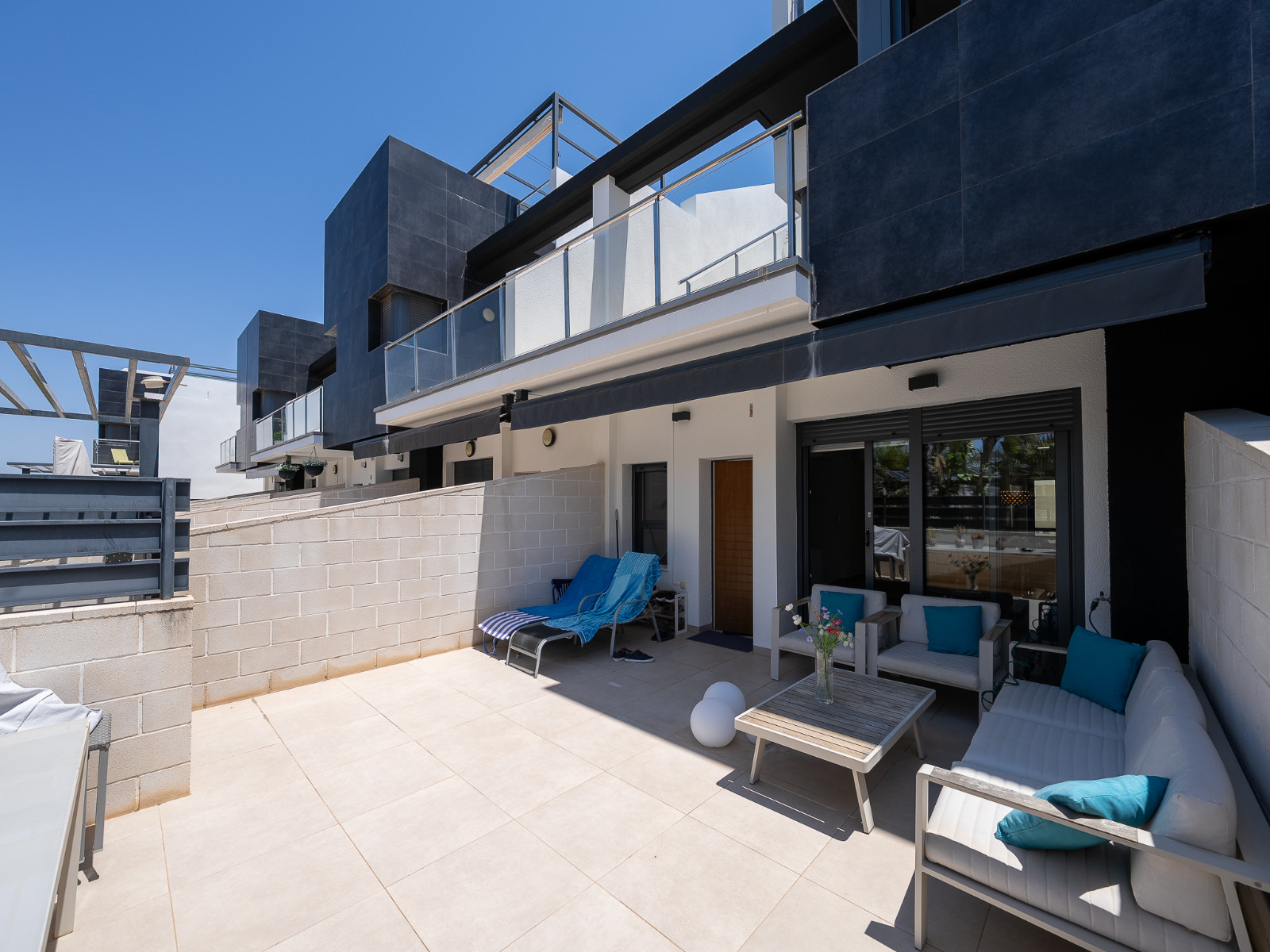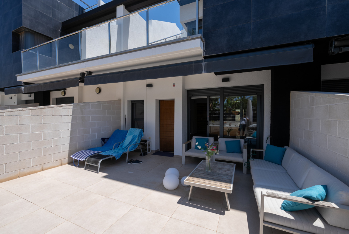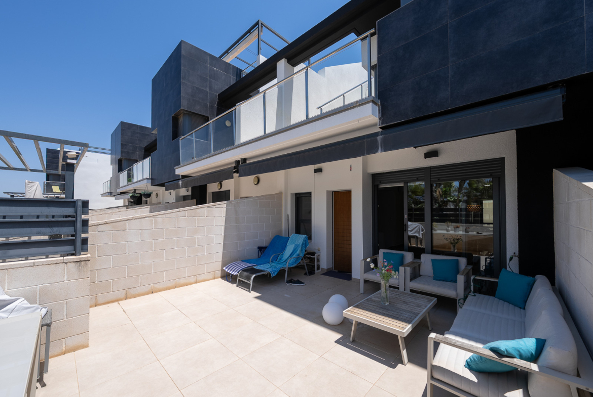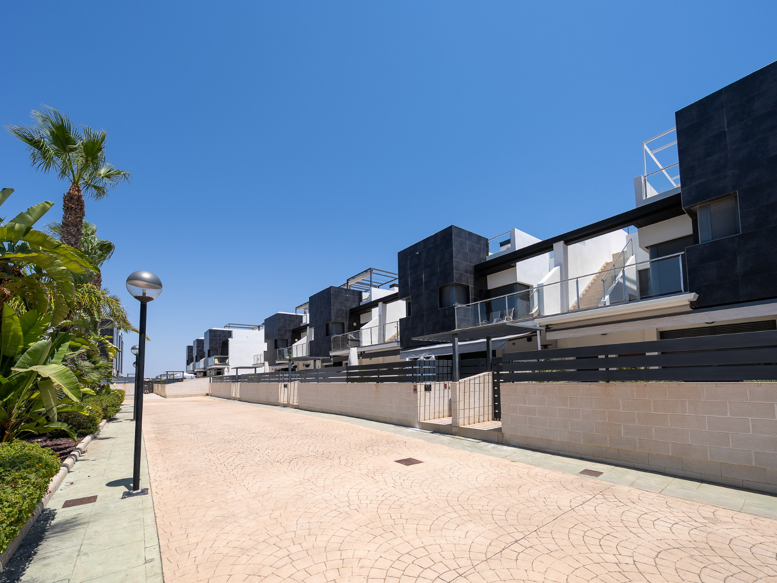 Located in the desirable area of Los Dolses, this well-presented townhouse is set across three levels and combines modern design with practical living. The main floor offers a bright open-plan living and dining area with a contemporary kitchen, an adjoining utility room with a fitted roof, and direct access from the living room to a terrace with an electric awning. The home comprises three double bedrooms and three bathrooms. The spacious underbuild, with heating cables, extra air conditioning, and direct access to the garage, is currently used as an additional living room and bedroom, adding valuable versatility. Steel railings have been fitted along the stairs for added safety. Outdoor living is equally inviting, with a private solarium, terraces overlooking the communal pool, and landscaped green areas within the community. The property is conveniently located within walking distance of local supermarkets, cafés, and restaurants. La Zenia Boulevard shopping centre is only a short bike ride away, while the Blue Flag beaches of the Orihuela Costa can be reached in just a few minutes by car or a pleasant walk.