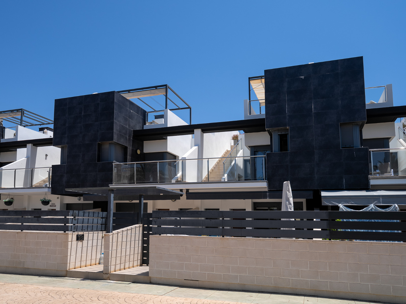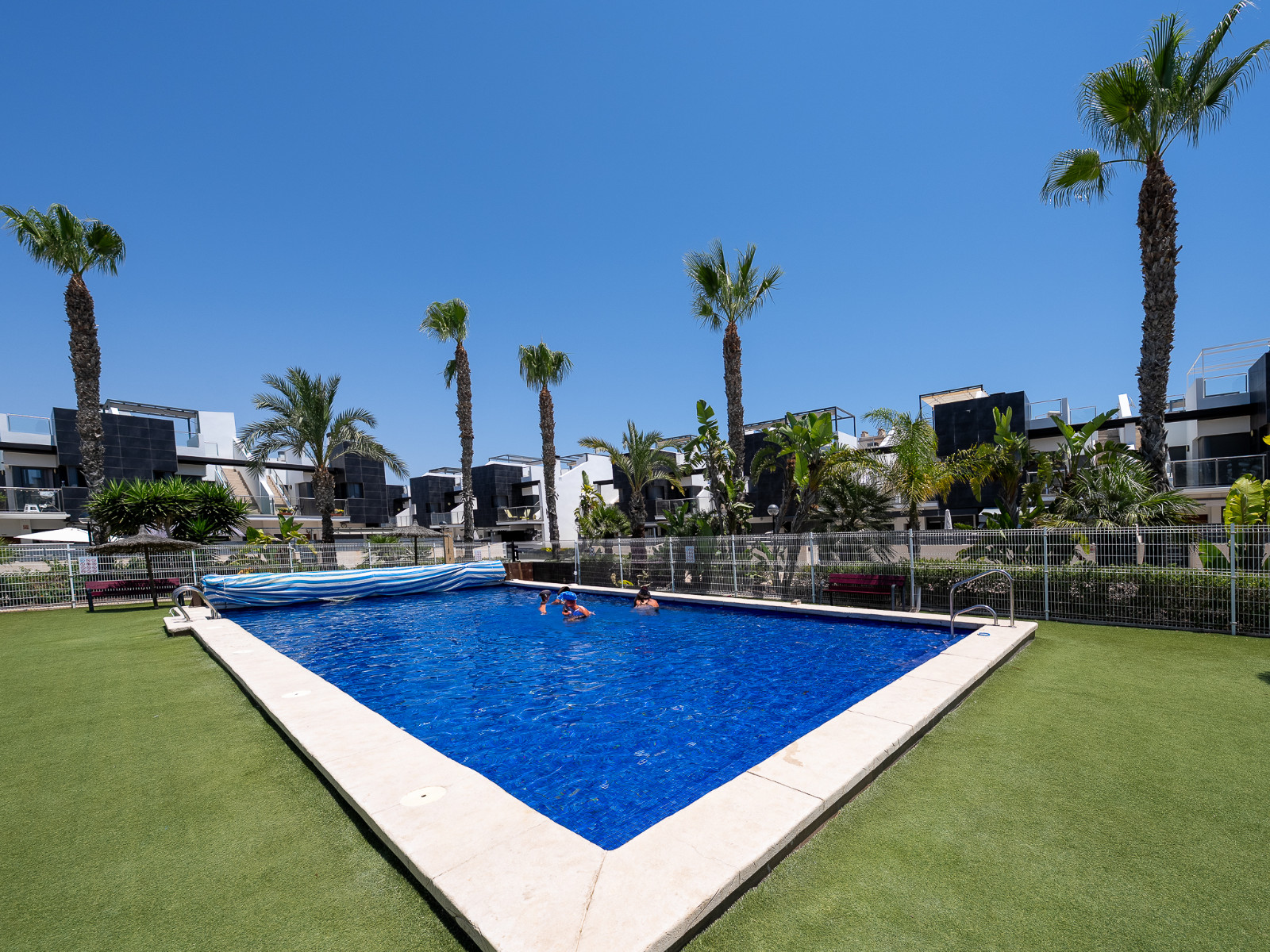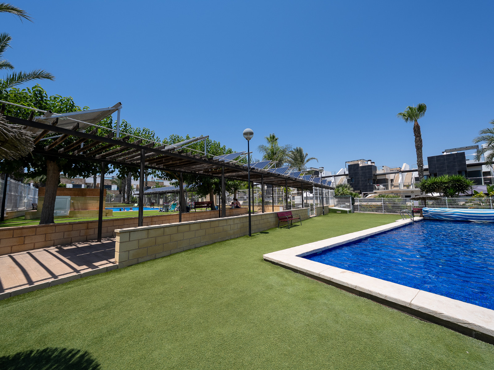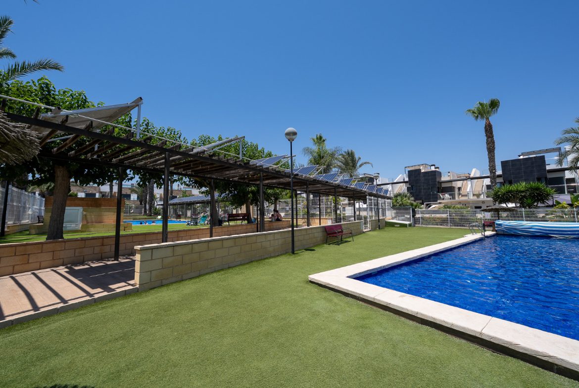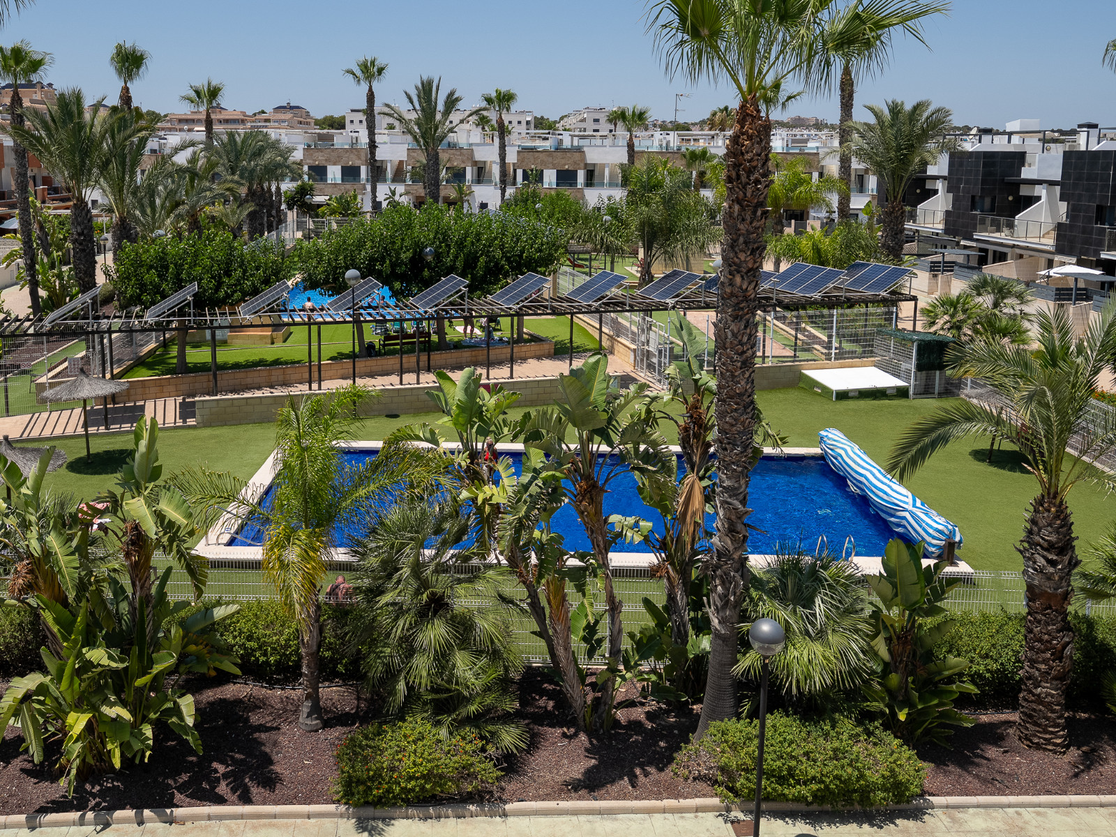 Located in the desirable area of Los Dolses, this well-presented townhouse is set across three levels and combines modern design with practical living. The main floor offers a bright open-plan living and dining area with a contemporary kitchen, an adjoining utility room with a fitted roof, and direct access from the living room to a terrace with an electric awning. The home comprises three double bedrooms and three bathrooms. The spacious underbuild, with heating cables, extra air conditioning, and direct access to the garage, is currently used as an additional living room and bedroom, adding valuable versatility. Steel railings have been fitted along the stairs for added safety. Outdoor living is equally inviting, with a private solarium, terraces overlooking the communal pool, and landscaped green areas within the community. The property is conveniently located within walking distance of local supermarkets, cafés, and restaurants. La Zenia Boulevard shopping centre is only a short bike ride away, while the Blue Flag beaches of the Orihuela Costa can be reached in just a few minutes by car or a pleasant walk.