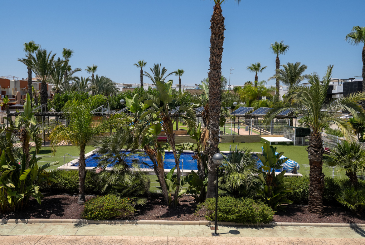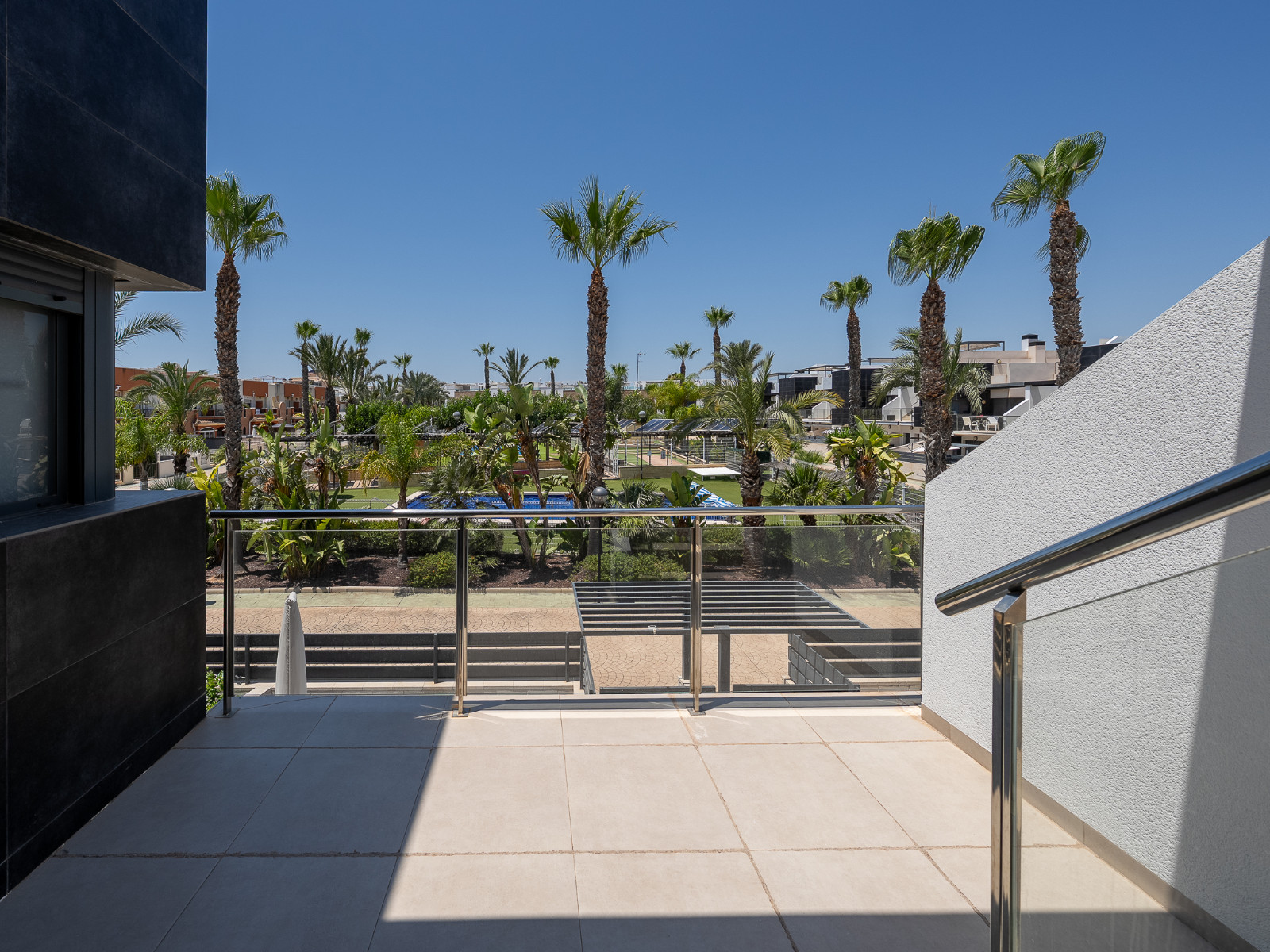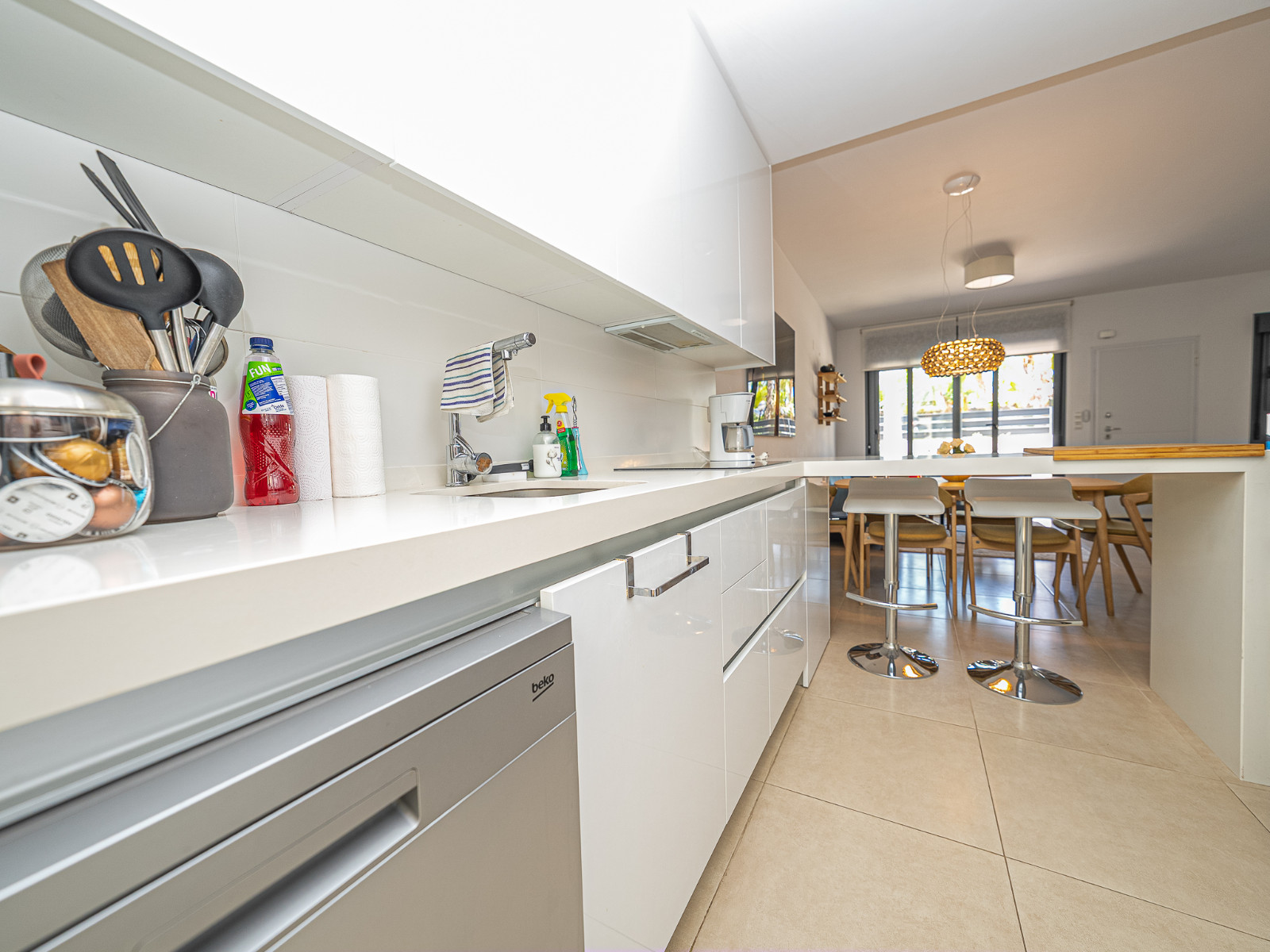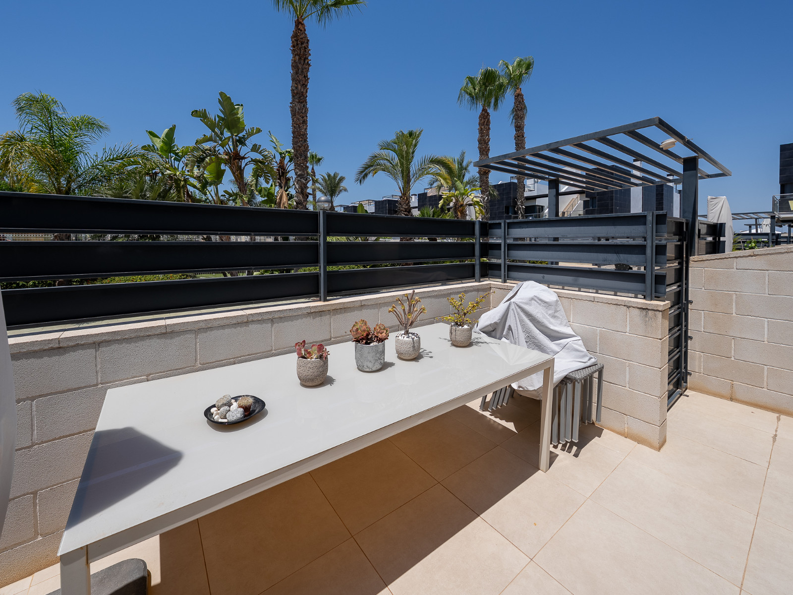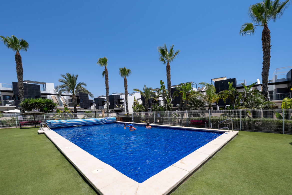 Located in the desirable area of Los Dolses, this well-presented townhouse is set across three levels and combines modern design with practical living. The main floor offers a bright open-plan living and dining area with a contemporary kitchen, an adjoining utility room with a fitted roof, and direct access from the living room to a terrace with an electric awning. The home comprises three double bedrooms and three bathrooms. The spacious underbuild, with heating cables, extra air conditioning, and direct access to the garage, is currently used as an additional living room and bedroom, adding valuable versatility. Steel railings have been fitted along the stairs for added safety. Outdoor living is equally inviting, with a private solarium, terraces overlooking the communal pool, and landscaped green areas within the community. The property is conveniently located within walking distance of local supermarkets, cafés, and restaurants. La Zenia Boulevard shopping centre is only a short bike ride away, while the Blue Flag beaches of the Orihuela Costa can be reached in just a few minutes by car or a pleasant walk.