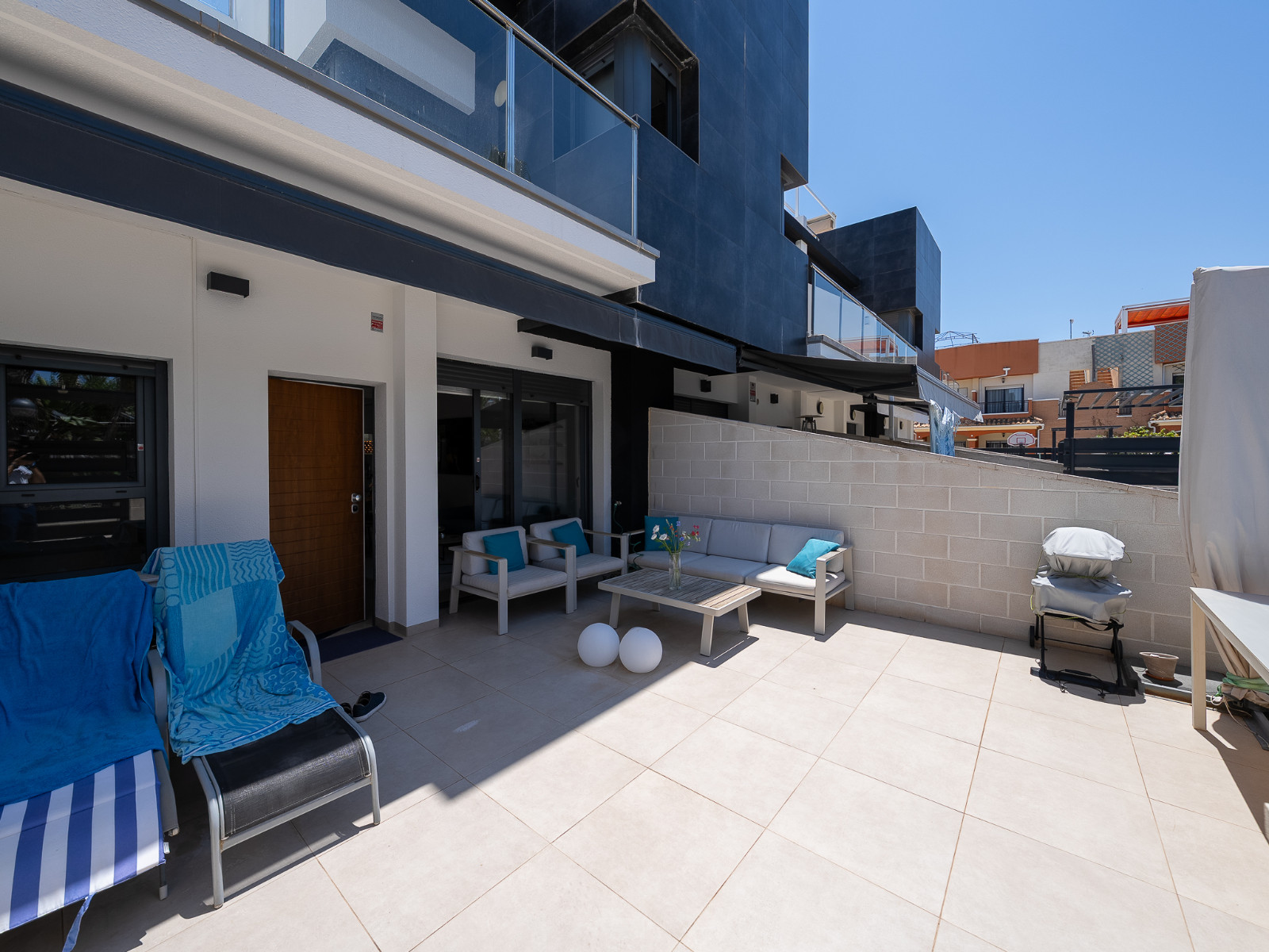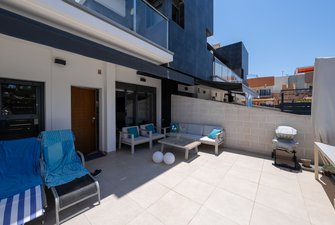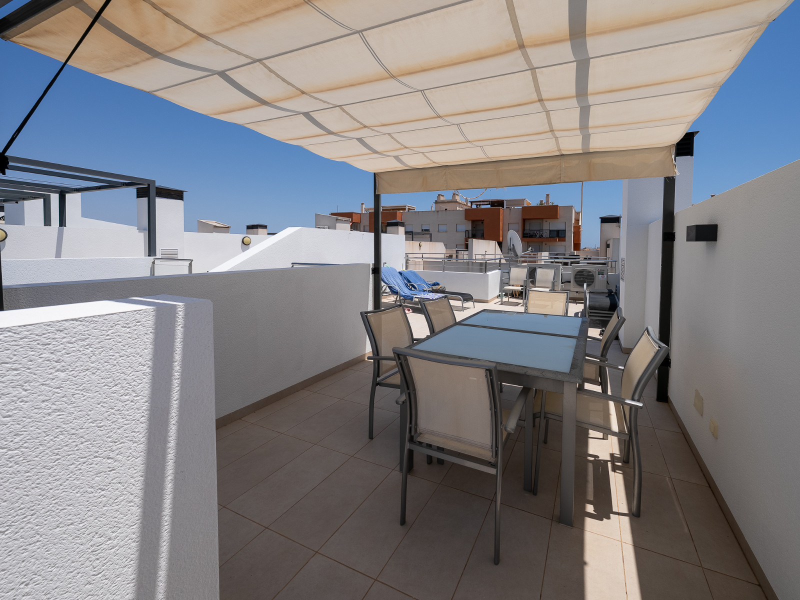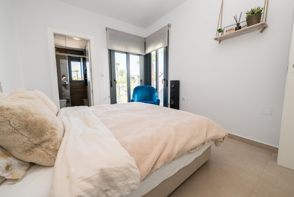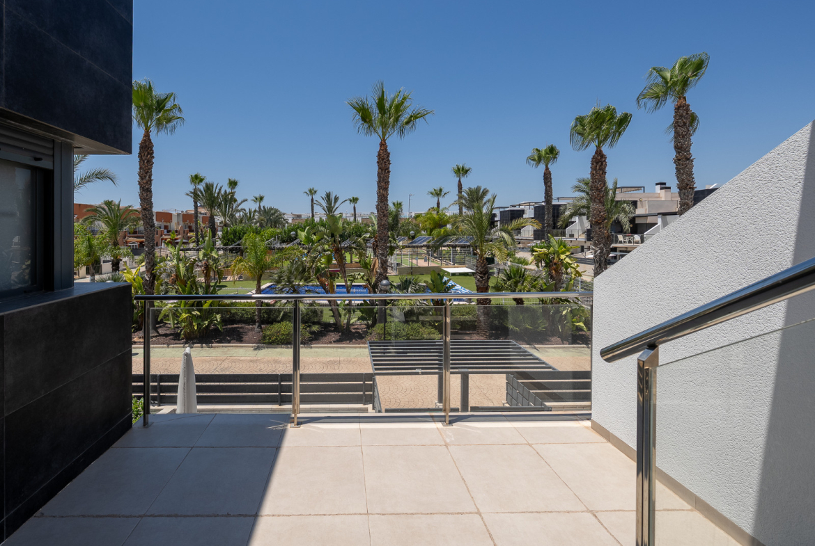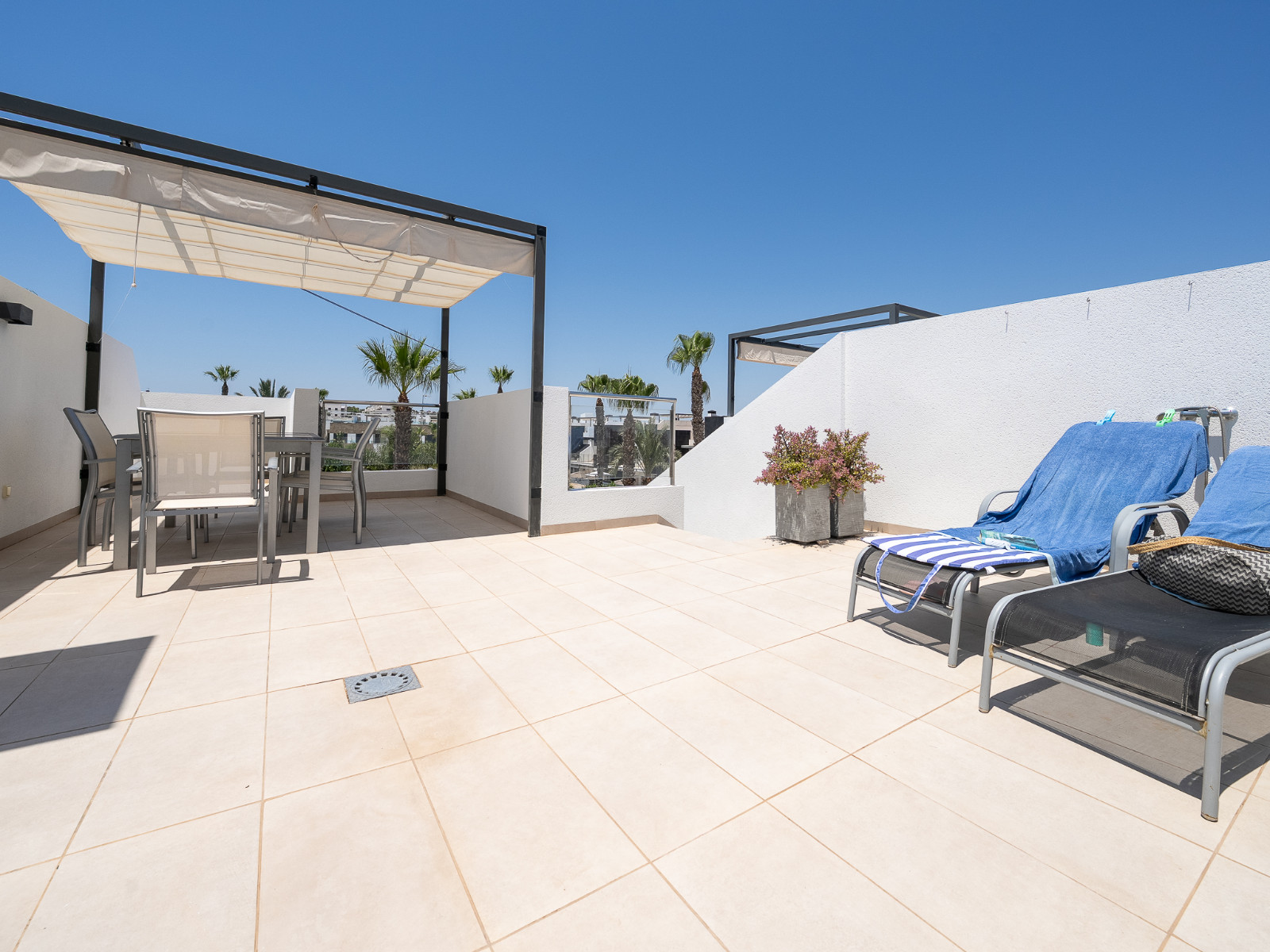 Located in the desirable area of Los Dolses, this well-presented townhouse is set across three levels and combines modern design with practical living. The main floor offers a bright open-plan living and dining area with a contemporary kitchen, an adjoining utility room with a fitted roof, and direct access from the living room to a terrace with an electric awning. The home comprises three double bedrooms and three bathrooms. The spacious underbuild, with heating cables, extra air conditioning, and direct access to the garage, is currently used as an additional living room and bedroom, adding valuable versatility. Steel railings have been fitted along the stairs for added safety. Outdoor living is equally inviting, with a private solarium, terraces overlooking the communal pool, and landscaped green areas within the community. The property is conveniently located within walking distance of local supermarkets, cafés, and restaurants. La Zenia Boulevard shopping centre is only a short bike ride away, while the Blue Flag beaches of the Orihuela Costa can be reached in just a few minutes by car or a pleasant walk.
