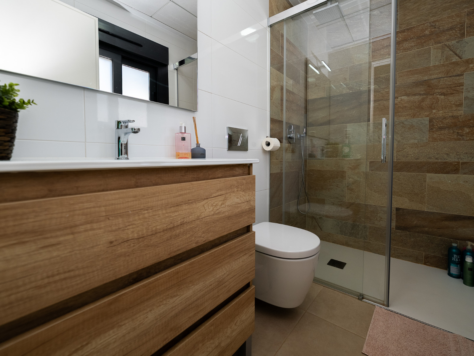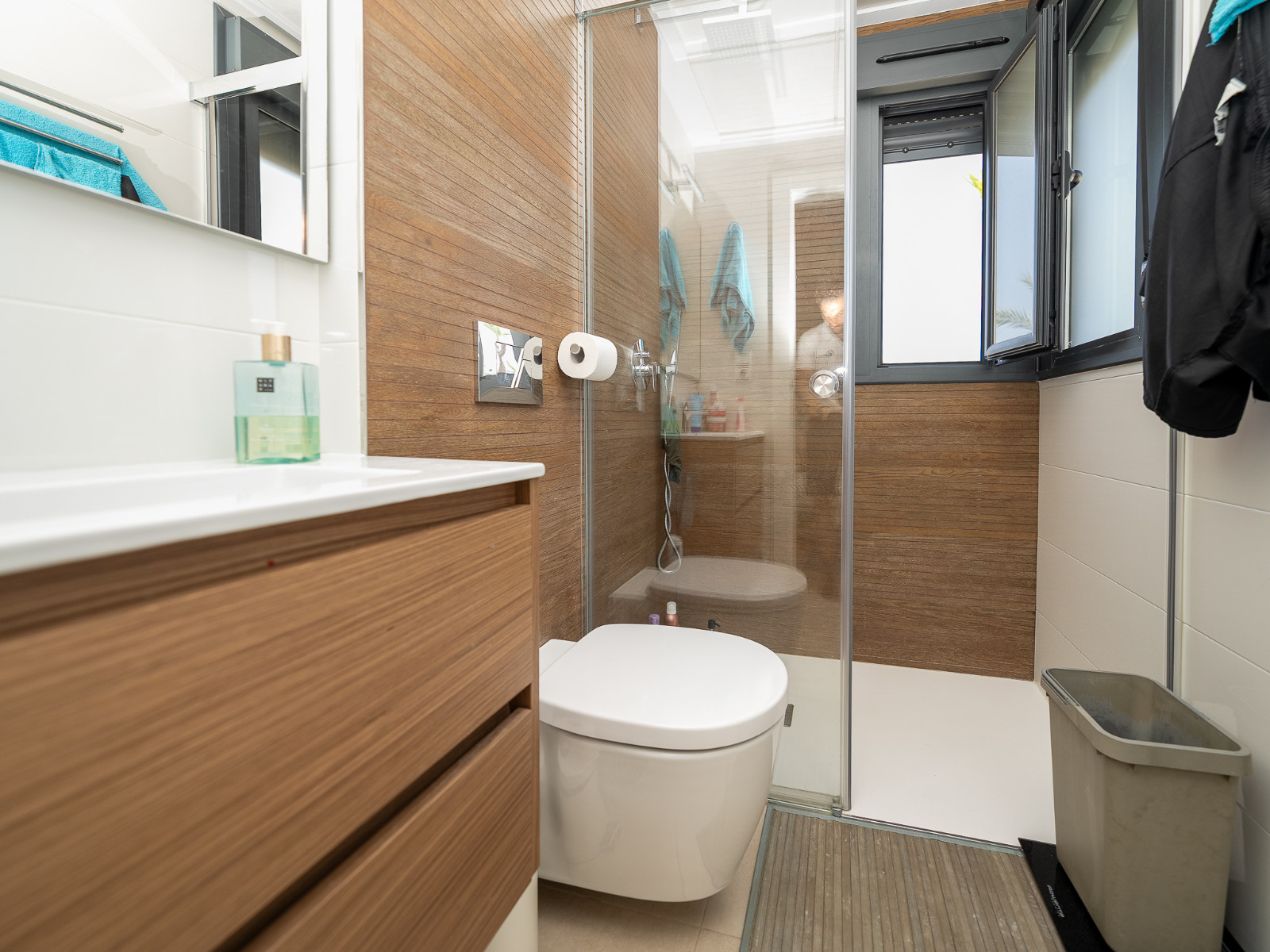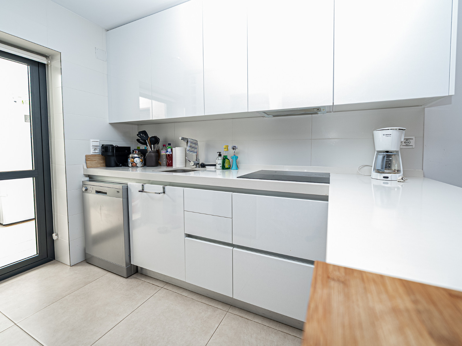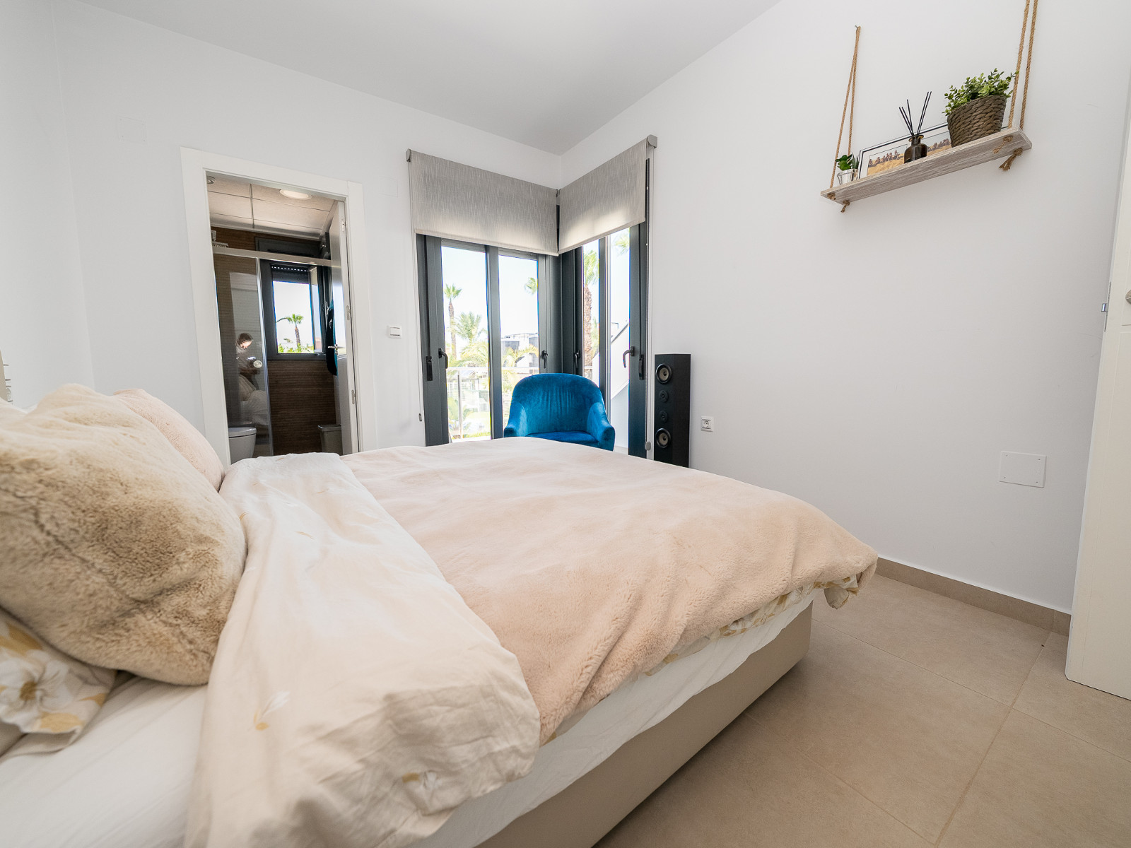 Located in the desirable area of Los Dolses, this well-presented townhouse is set across three levels and combines modern design with practical living. The main floor offers a bright open-plan living and dining area with a contemporary kitchen, an adjoining utility room with a fitted roof, and direct access from the living room to a terrace with an electric awning. The home comprises three double bedrooms and three bathrooms. The spacious underbuild, with heating cables, extra air conditioning, and direct access to the garage, is currently used as an additional living room and bedroom, adding valuable versatility. Steel railings have been fitted along the stairs for added safety. Outdoor living is equally inviting, with a private solarium, terraces overlooking the communal pool, and landscaped green areas within the community. The property is conveniently located within walking distance of local supermarkets, cafés, and restaurants. La Zenia Boulevard shopping centre is only a short bike ride away, while the Blue Flag beaches of the Orihuela Costa can be reached in just a few minutes by car or a pleasant walk.