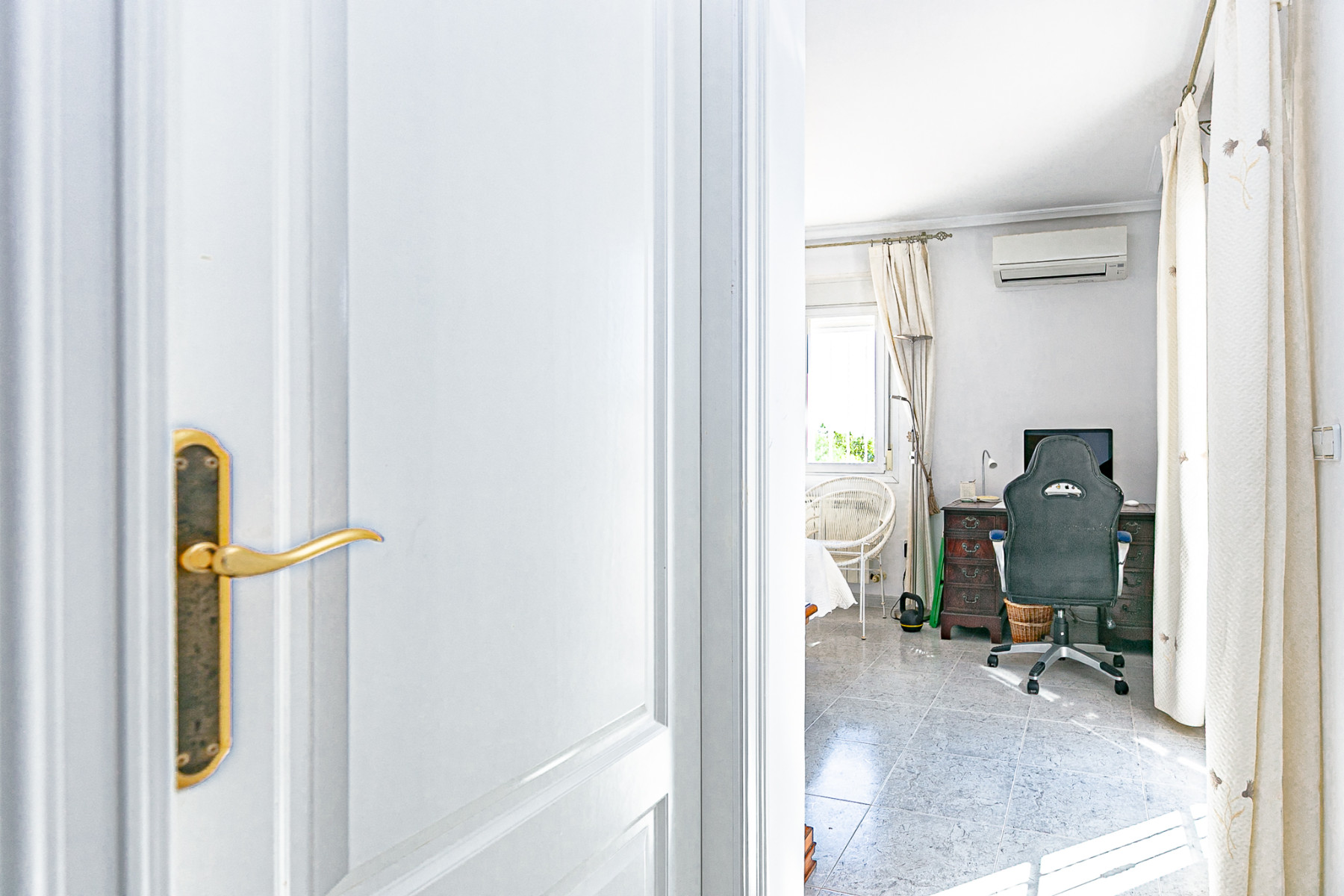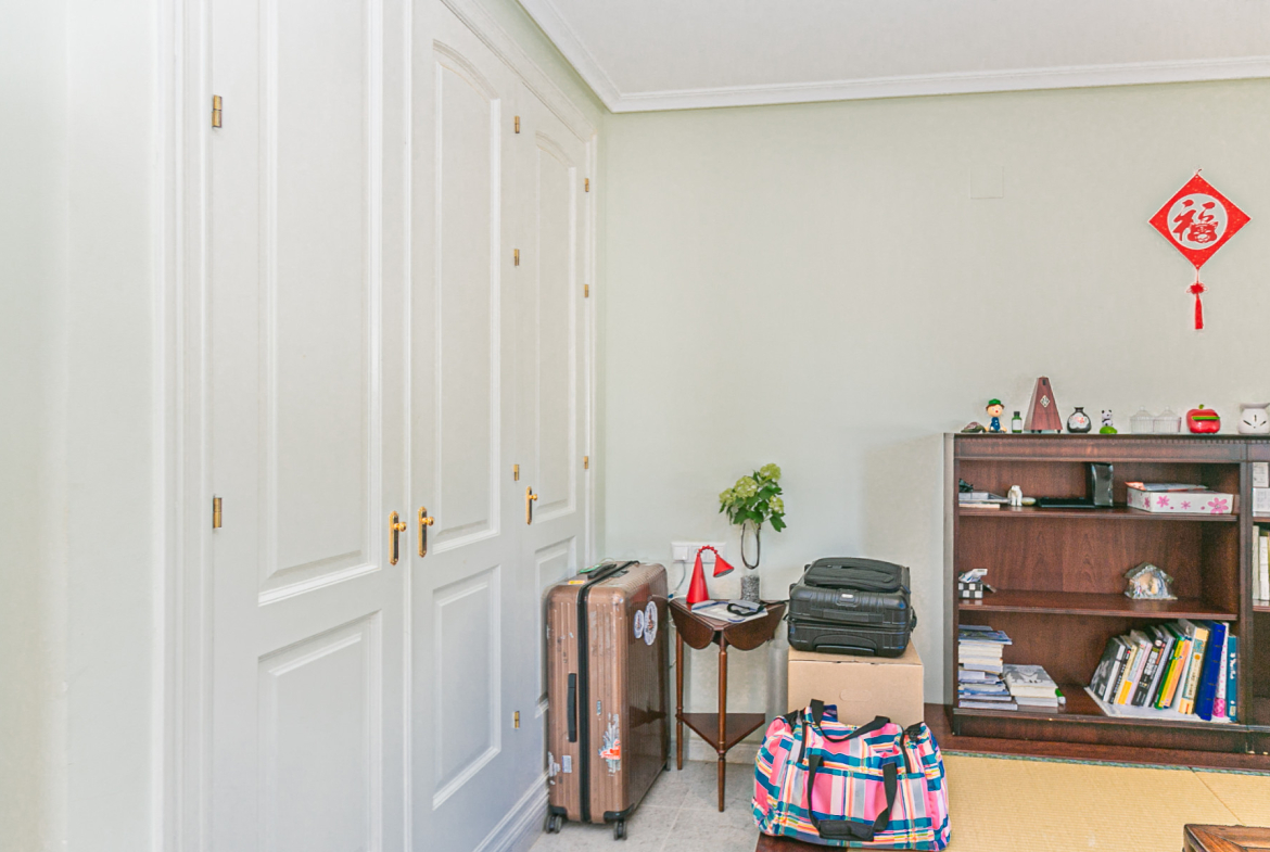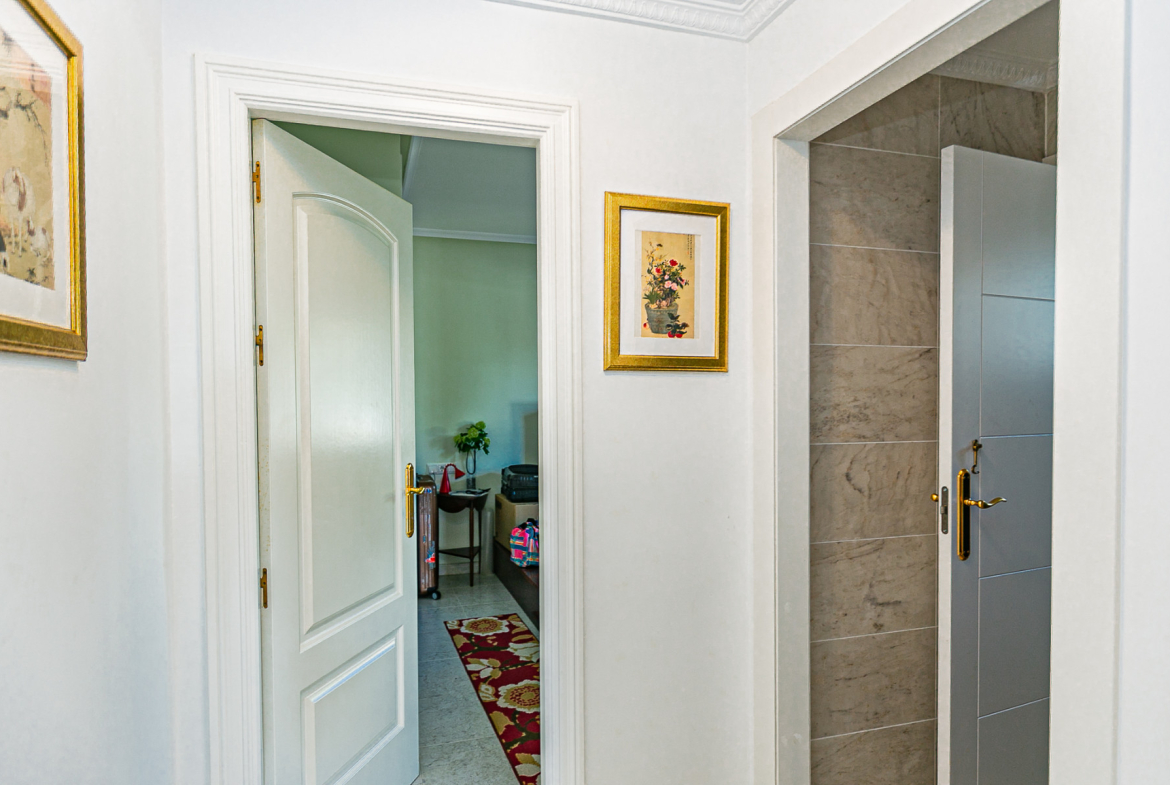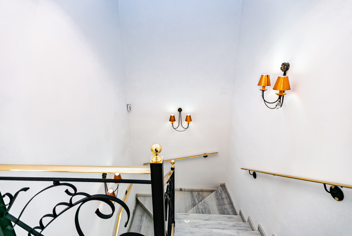 On the ground floor, there is a spacious and elegant entrance hall from the covered front terrace, a fully fitted independent kitchen with high-quality appliances (including some by Miele), laundry room and pantry. The recently renovated living-dining room features a wood-burning fireplace, a partially marble-clad wall, and large windows that flood the space with light. This floor also includes a modernised guest toilet and a double bedroom currently used as a traditional tea room.