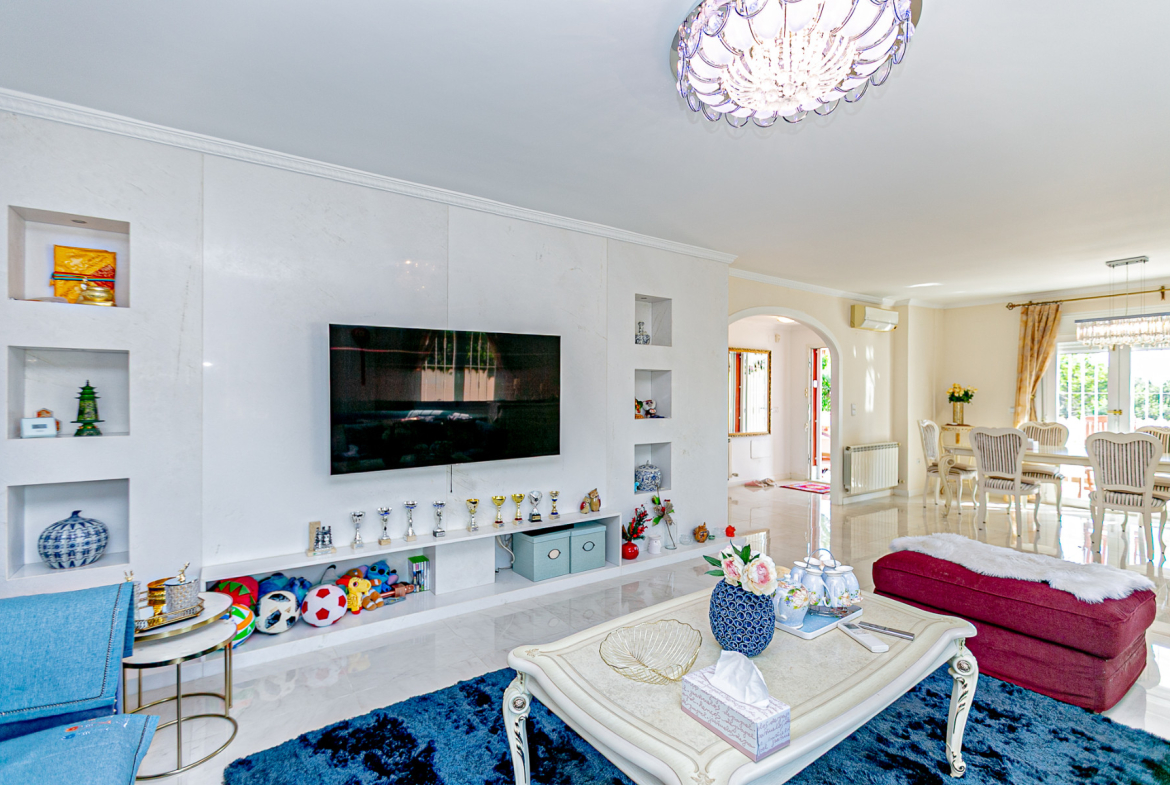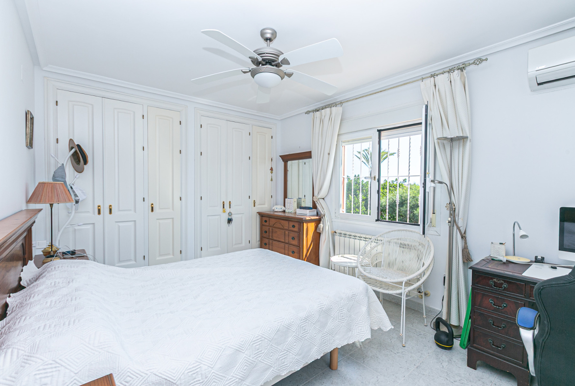 We are delighted to present this magnificent 4-bedroom, 2.5-bathroom villa, located on the frontline of the prestigious Campoamor Golf Course. This unique property, originally with 5 bedrooms, has been carefully modified: one bedroom was sacrificed to enlarge the living-dining area, creating a brighter, more spacious, and welcoming environment.
