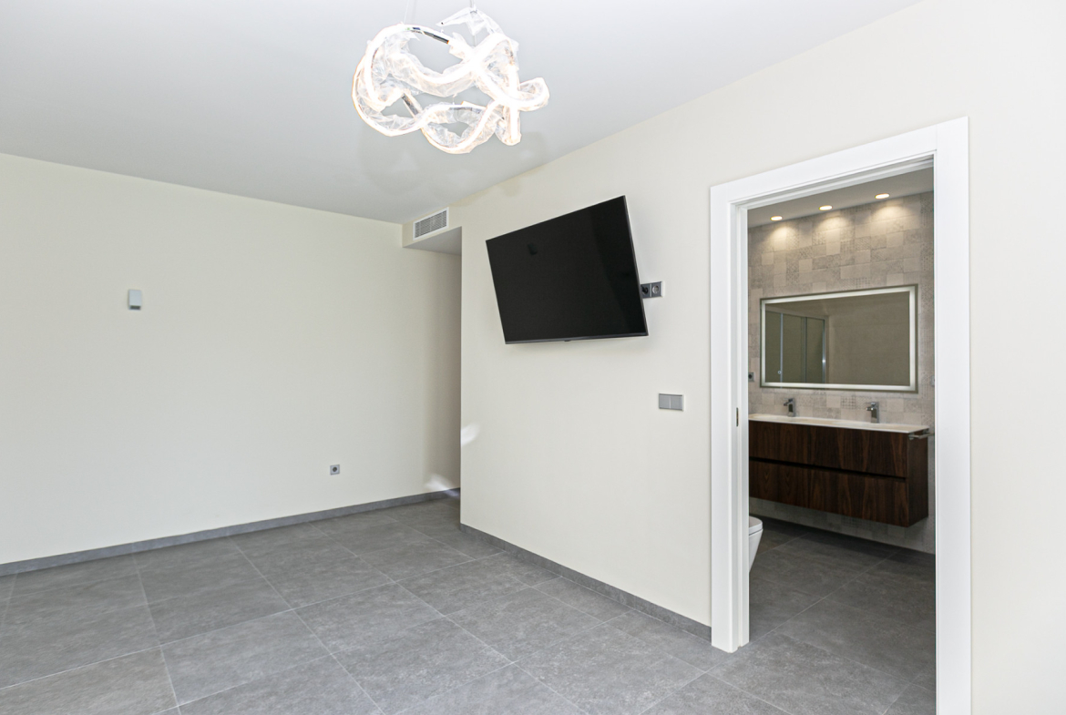 Five spacious bedrooms: a master suite with walk-in closet and premium bathroom, a junior suite with walk-in closet and bathroom, one bedroom with en-suite bathroom, and two additional double bedrooms.