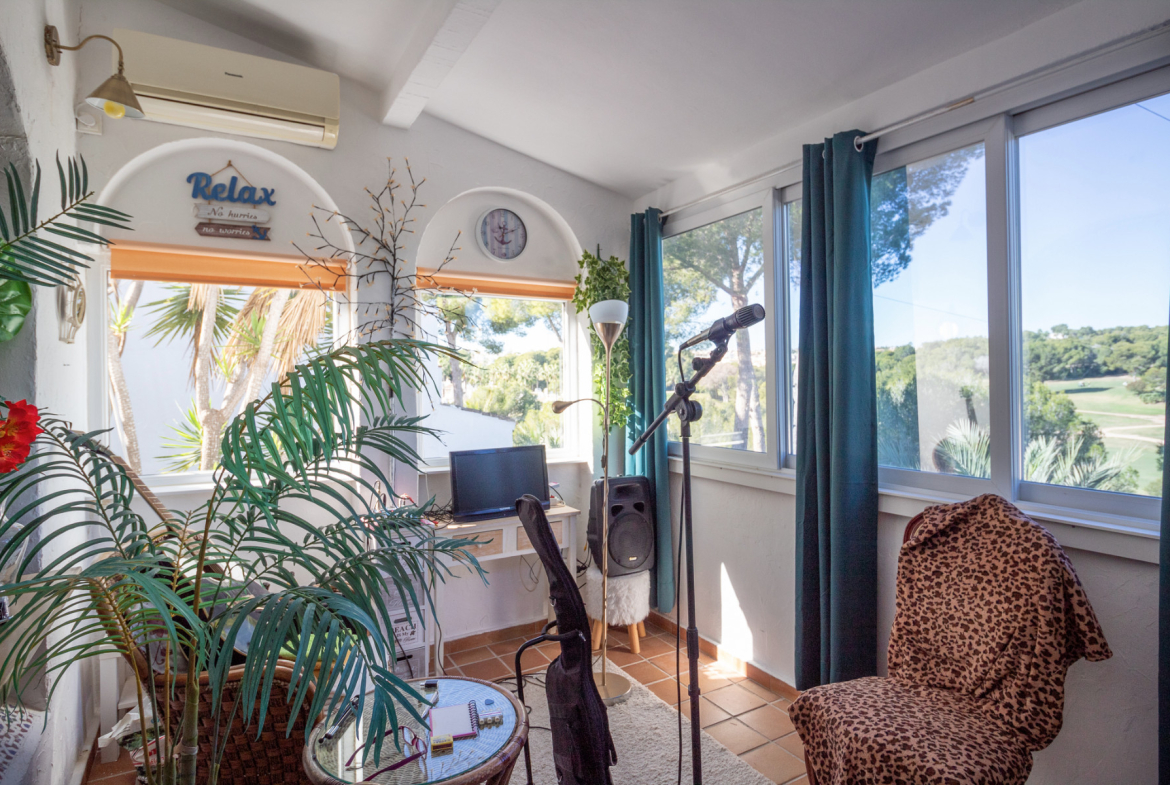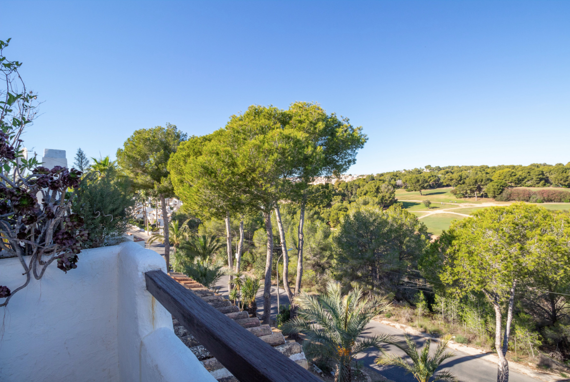These homes offer an uncommon layout, with the bedrooms located on the ground floor together with two double rooms, two bathrooms, a utility room with a sauna, and access to a conservatory. The main living area is situated upstairs, providing excellent views over the surroundings. The first floor includes a bright living and dining area, an American-style kitchen with a breakfast bar, and a separate guest WC. From this level, you also have access to the balcony and the private solarium, both offering stunning views over the Villamartin golf course.