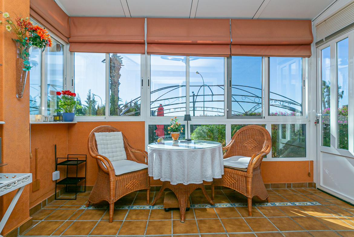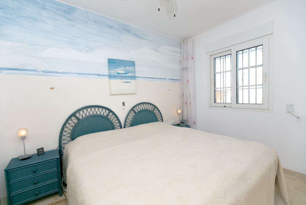 Discover this charming ground floor bungalow style apartment located in one of the most beautiful and characterful residential complexes in Playa Flamenca. A typically Mediterranean community, built in the traditional style that is no longer constructed today, with spacious green areas, palm trees and three magnificent communal swimming pools surrounded by natural grass, creating a peaceful and welcoming environment.
