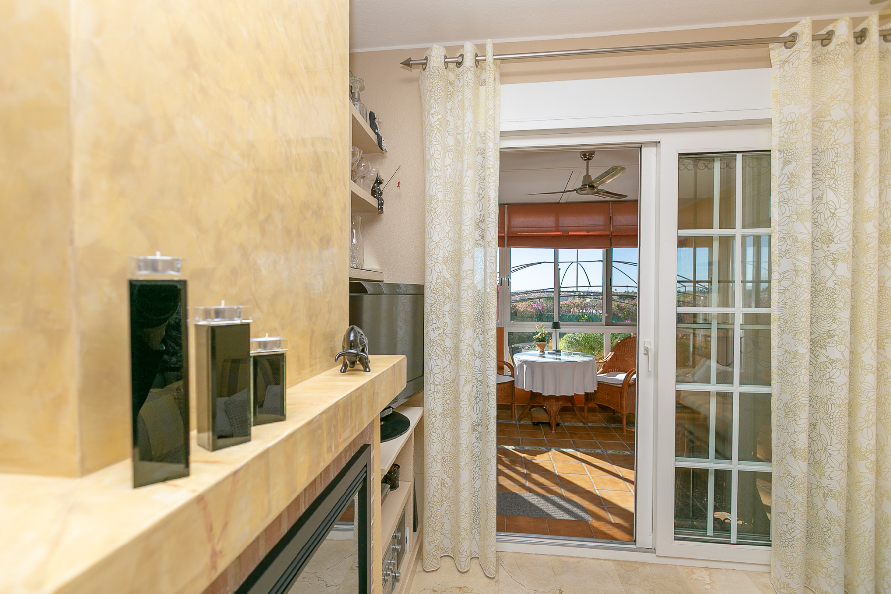 From the living room, we access a covered terrace, ideal for the colder winter days as, thanks to its south orientation, it becomes a warm and very pleasant space. In summer, the windows can be opened to allow fresh air to flow through, making it a versatile area all year round. From here, there is also direct access to the garden.