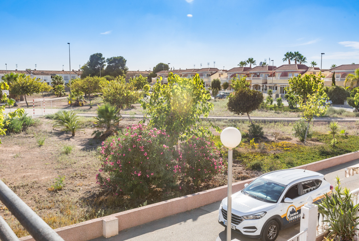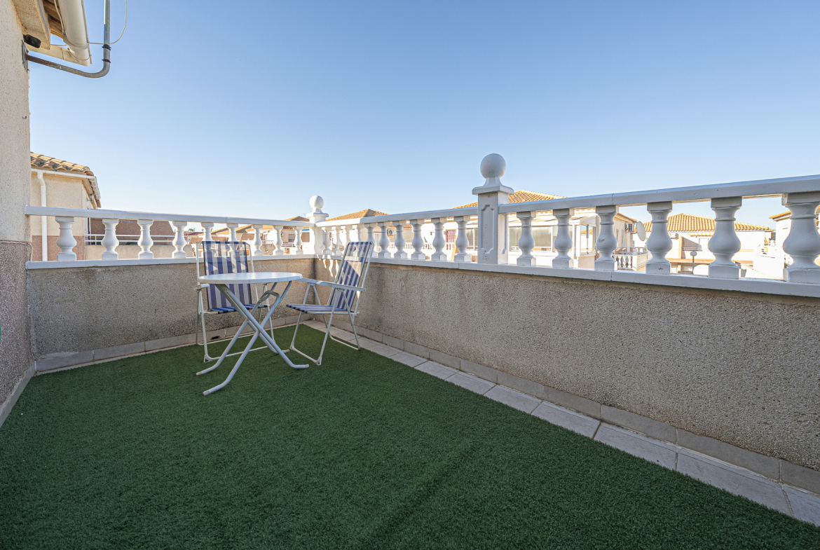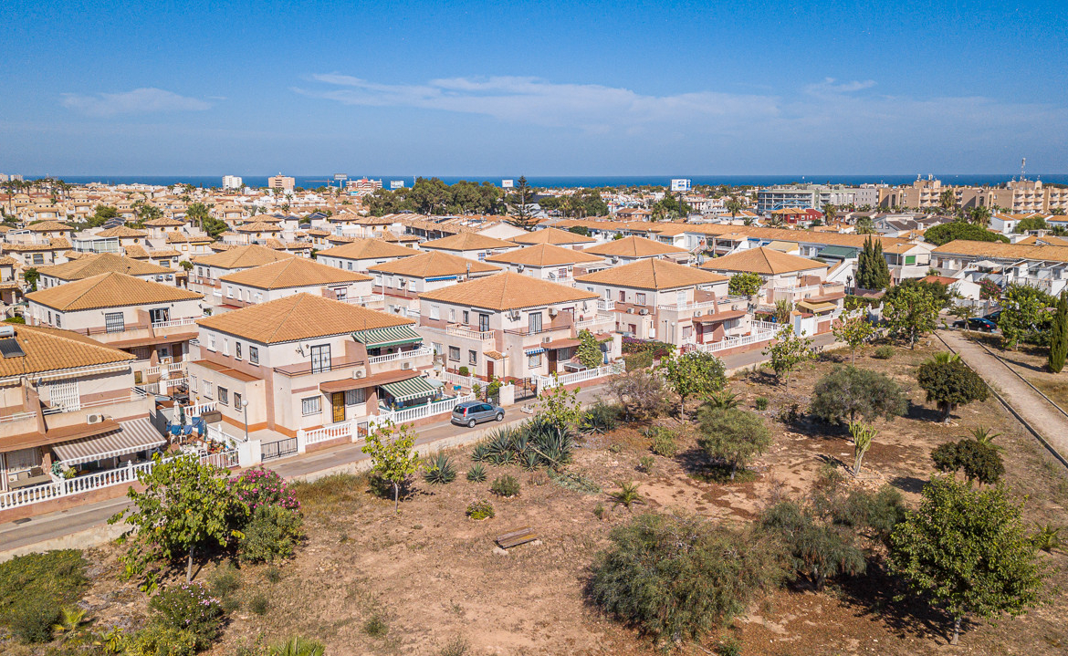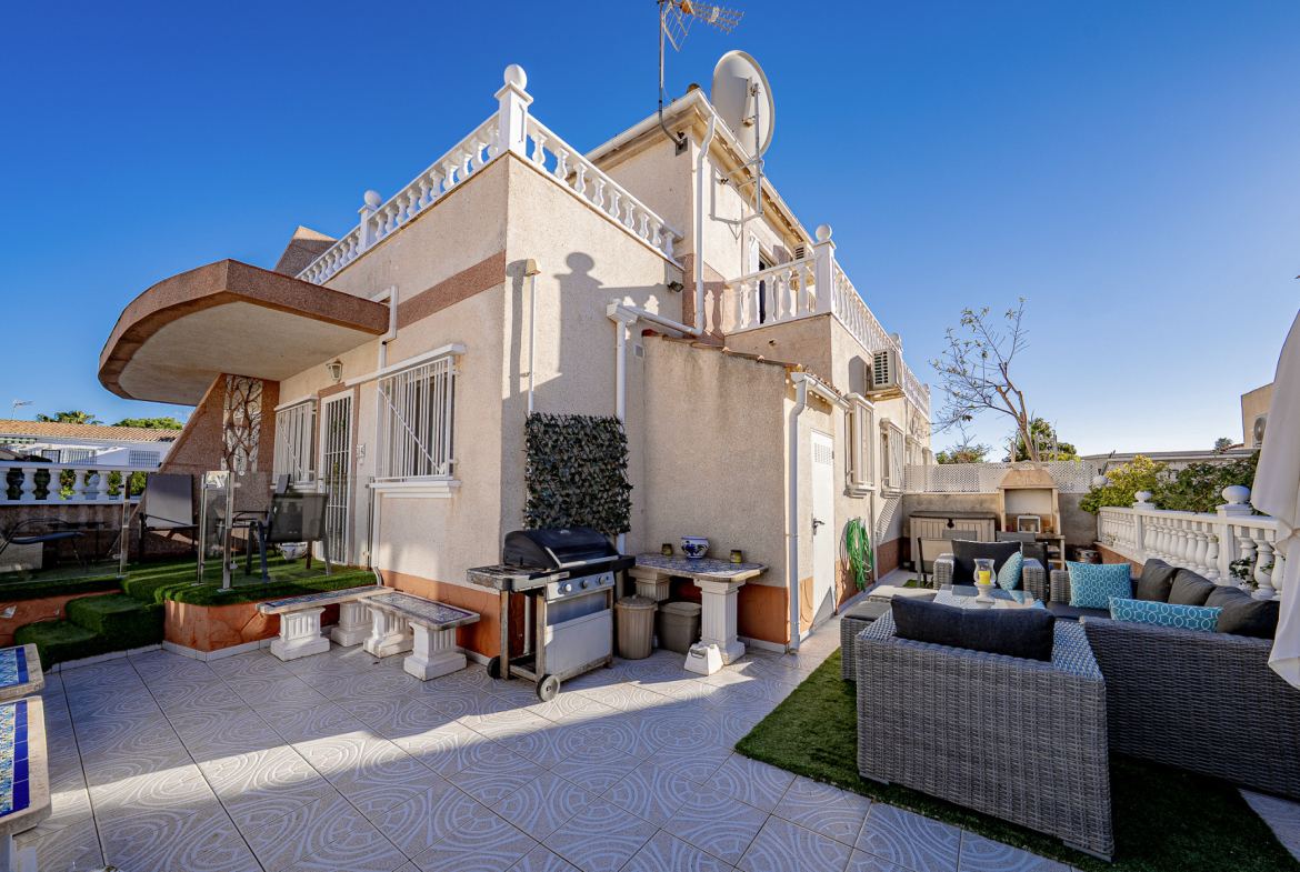 Well presented 3 bedroom 2 bathroom quad villa in the La Regia area of Cabo Roig. This charming home is in excellent condition and  ideal for holidays or permanent living. The living room/dining room is open plan with ample space and renovated, built in wall display unit, semi open modern fitted kitchen with American breakfast bar, spacious under-stairs storage room, plus for added convenience a  ground floor bathroom, with walk in shower, double bedroom, The second floor offers a further 2 double bedrooms  both with access to private balcony terraces and  a fully renovated bathroom with walk in shower,  Outside space offers ample terraces, patio garden laid to artificial grass  and tiles with newly installed glass panels and on site parking. The property benefits from air conditioning, infrared panel heaters, ceiling fans, pvc guttering, white goods, part renovated and fully furnished and is totally key ready. Charming community with communal swimming pool, gardens, football pitch, and children´s park, Quiet location walking distance to the renowned Cabo Roig strip (Under a 10 minute walk)  which hosts many shops, cafe- bars restaurants and supermarkets, the sandy blue flag beach of La Caleta, Cabo Roig is under a 15 minutes walk, and only a short drive to the La Zenia boulevard shopping centre and many first-class golf courses. Contact us today for a viewing.
