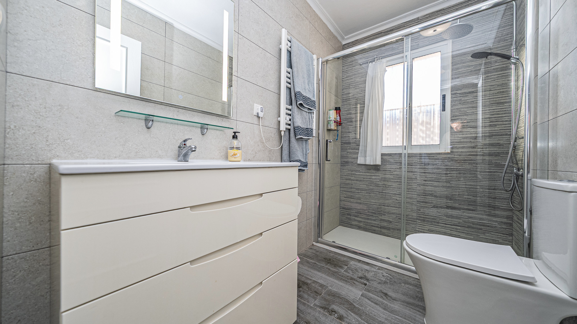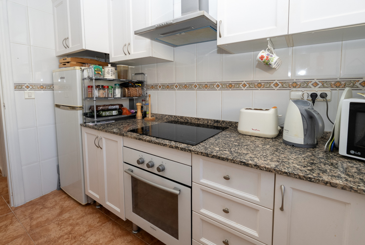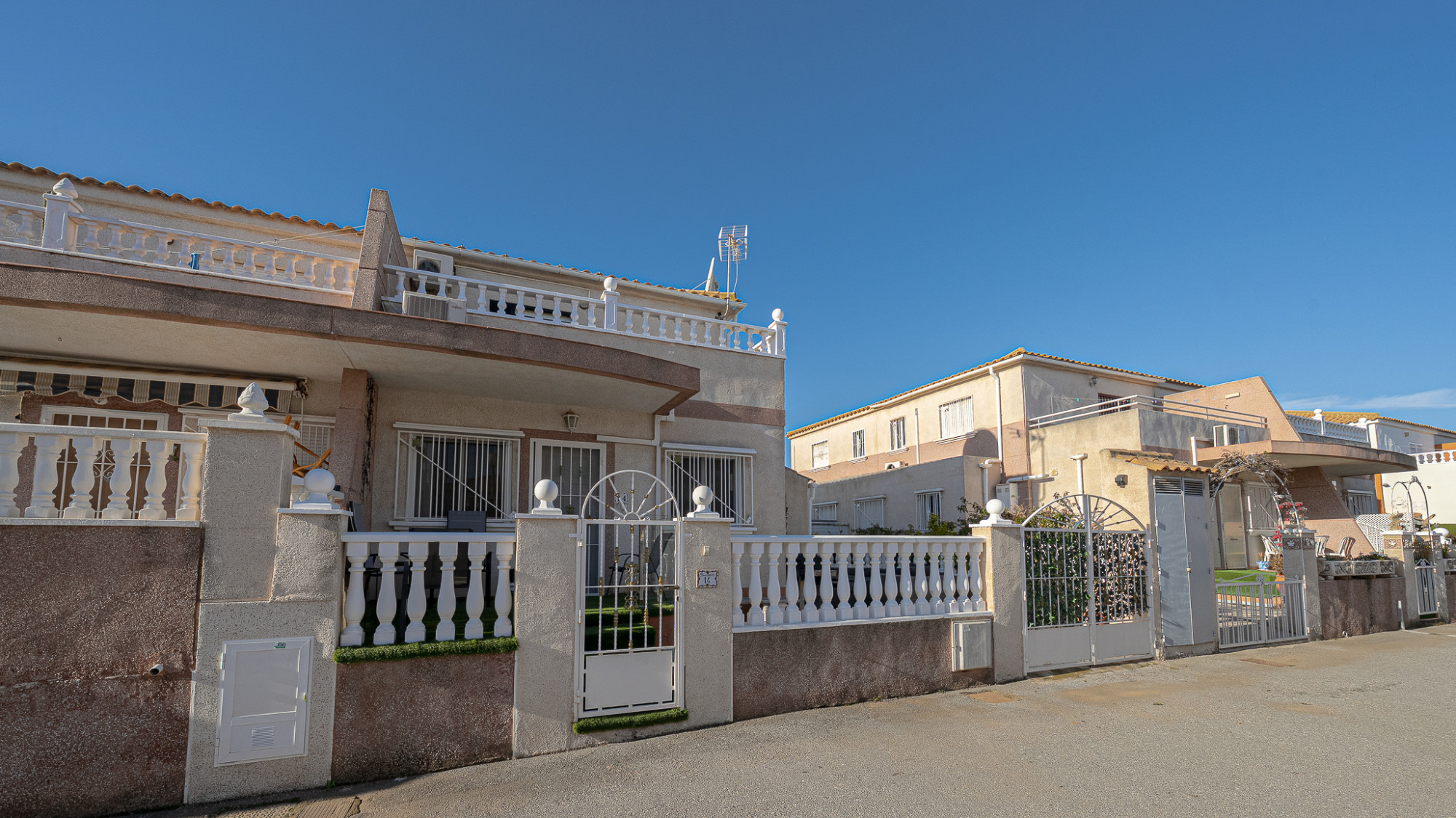 Well presented 3 bedroom 2 bathroom quad villa in the La Regia area of Cabo Roig. This charming home is in excellent condition and  ideal for holidays or permanent living. The living room/dining room is open plan with ample space and renovated, built in wall display unit, semi open modern fitted kitchen with American breakfast bar, spacious under-stairs storage room, plus for added convenience a  ground floor bathroom, with walk in shower, double bedroom, The second floor offers a further 2 double bedrooms  both with access to private balcony terraces and  a fully renovated bathroom with walk in shower,  Outside space offers ample terraces, patio garden laid to artificial grass  and tiles with newly installed glass panels and on site parking. The property benefits from air conditioning, infrared panel heaters, ceiling fans, pvc guttering, white goods, part renovated and fully furnished and is totally key ready. Charming community with communal swimming pool, gardens, football pitch, and children´s park, Quiet location walking distance to the renowned Cabo Roig strip (Under a 10 minute walk)  which hosts many shops, cafe- bars restaurants and supermarkets, the sandy blue flag beach of La Caleta, Cabo Roig is under a 15 minutes walk, and only a short drive to the La Zenia boulevard shopping centre and many first-class golf courses. Contact us today for a viewing.