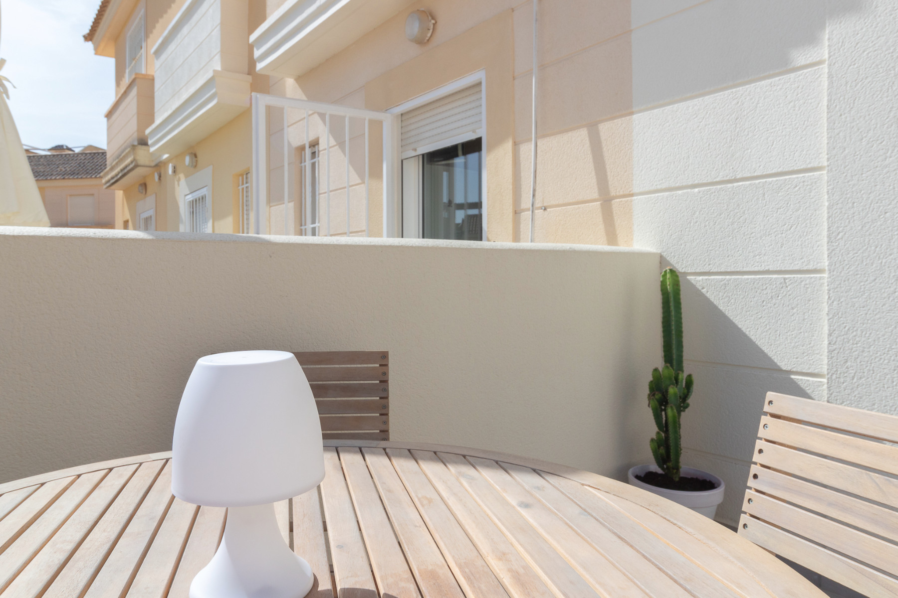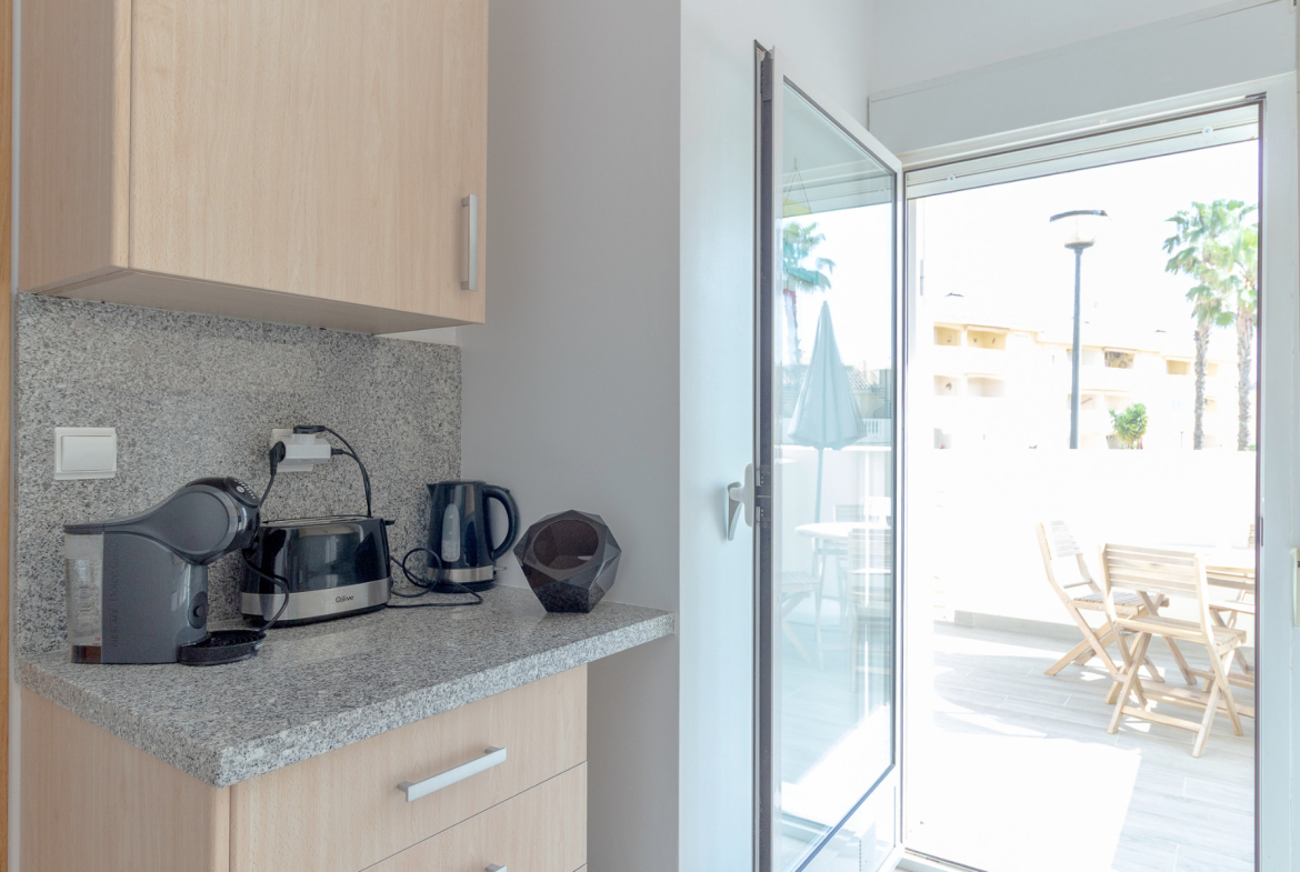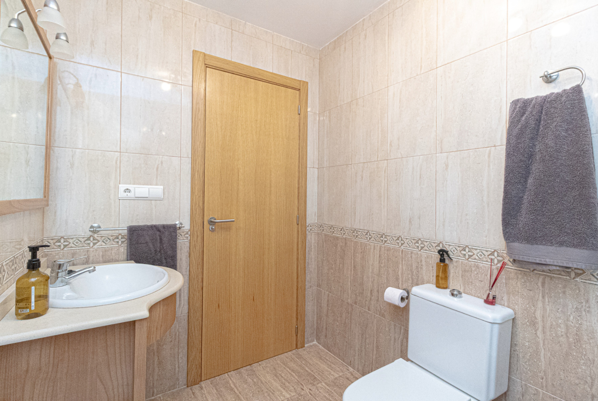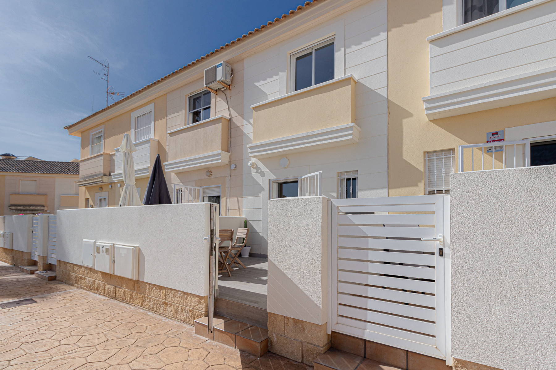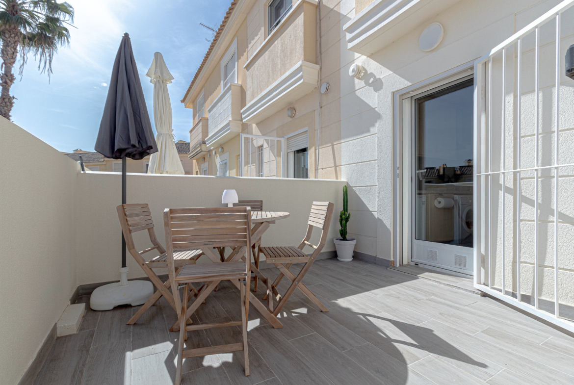 Super sunny dual aspect town house situated in a quiet and peaceful residence in Lomas de Cabo Roig. The property comprises 2 double bedrooms with fitted wardrobes, both on the first floor; the master bedroom boasts a South West facing balcony terrace, with access from here to the extensive solarium which hosts a brick built BBQ and views from the front out to the Mediterranean sea and to the rear over the communal pool and gardens; an ideal place for privacy, sunbathing, relaxing or entertaining, a full family bathroom completes the upper floor . Downstairs offers a spacious lounge/dining room with under stairs storage , a renovated WC and modern shower room and an independent kitchen which has direct access to the rear sun terrace and on to the central communal pool and gardens, which is a stunning feature of this urbanisation. In terms of outside space, this sunny home offers the best of both worlds where you can follow the sun all day with patio gardens/ terraces front and rear plus the extensive solarium as previously mentioned. The home has been renovated in part (inside and out) and has been maintained to an exceptional standard and cared for by the owners (from new) and is sold fully furnished (minus personal items) along with many extras . Along with the communal gardens and swimming pool the community offers parking and the house is sold with it´s own private allocated parking spot. This quiet and friendly community hosts a mix of nationalities with permanent residents and holiday makers alike and is located a 10 minute walk to the local commercial centre, with bistros, restaurants, local shops and supermarkets and a short drive to the beaches of the Orihuela Costa, plus numerous golf courses, including Campoamor, Las Ramblas and Villamartin. The La Zenia Boulevard shopping mall is under 10 minutes by car and has easy access to the N332 Coastal Road and the AP7 for Alicante airport. Contact us today to view this immaculate home in Spain