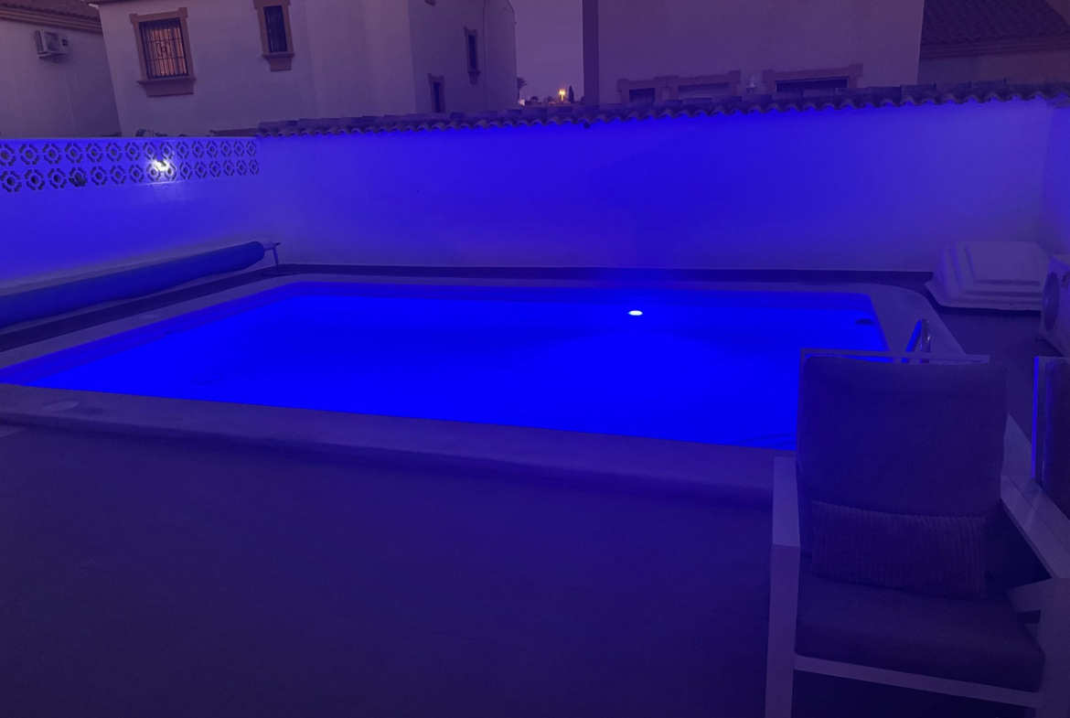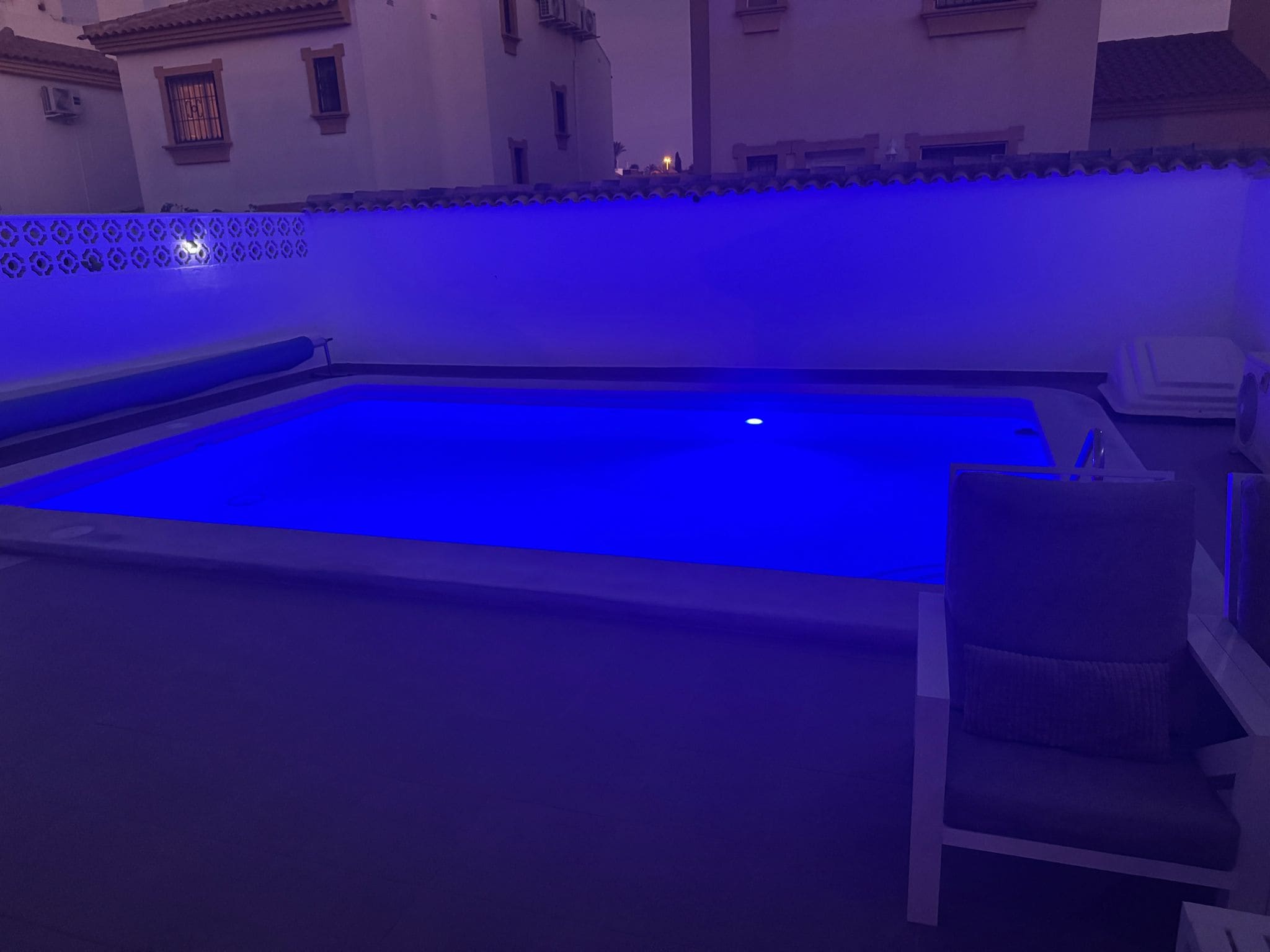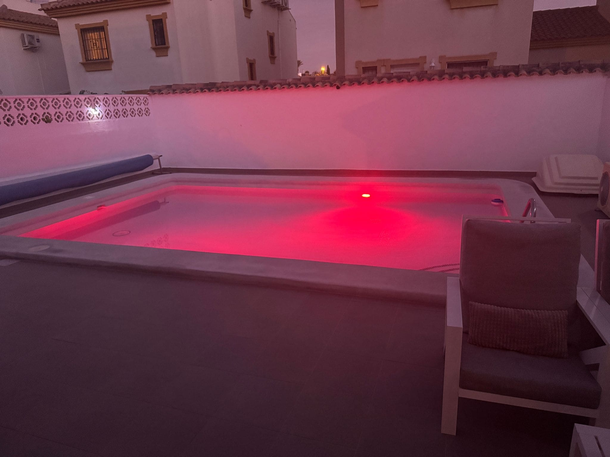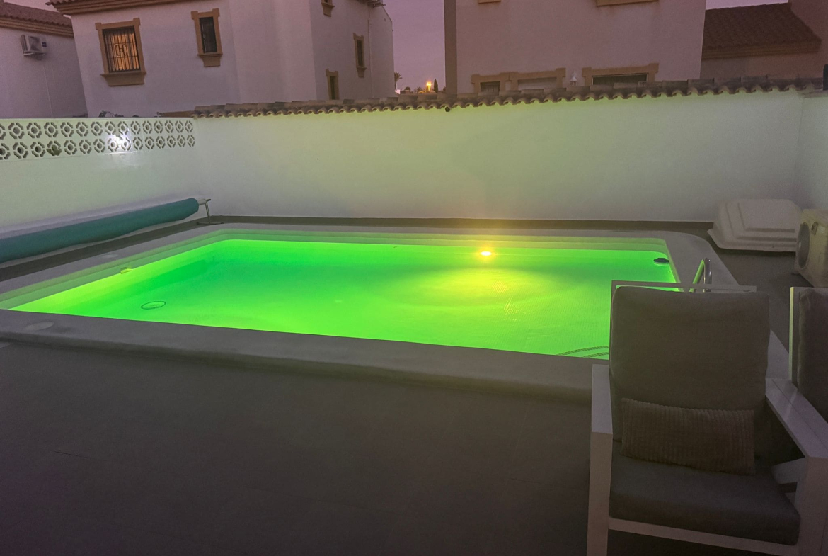 This stunning semi detached Villa is set only 400 meters from the popular La Zenia blue flag award winning beach. The Villa has been totally reformed from the minute you set foot in the garden to the gorgeous heated swimming pool which has been totally reformed. The Villa has a lovely private driveway which has been resurfced and has enough room for 3 cars and this leads down to the front door, on entry to the villa you will appreciate the finish to the project and how the owners have put their heart and sole into the refurbishment of this older semi detached in one of the most popular areas of La Zenia. Downstairs is an open plan lounge and american kitchen style with an open aspect out to the pool through glass curtains, the access direct to the private pool and garden area is south facing with sun on the pool all day and has lots of space for lounging by the pool, plus an out building for storage and a full shower room for the kids coming off the beach. There are 2 bedrooms on the ground level one with an en suite and also another with a full shower room between both bedrooms. The top floor has a large double bedroom with another en suite and direct access to a private balcony over looking the gorgeous privte pool. This property is a must to see and will not be on the market long.