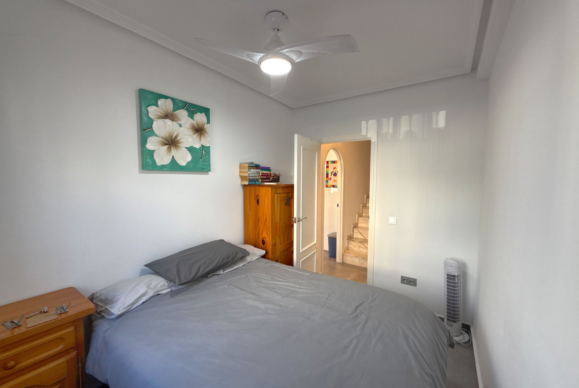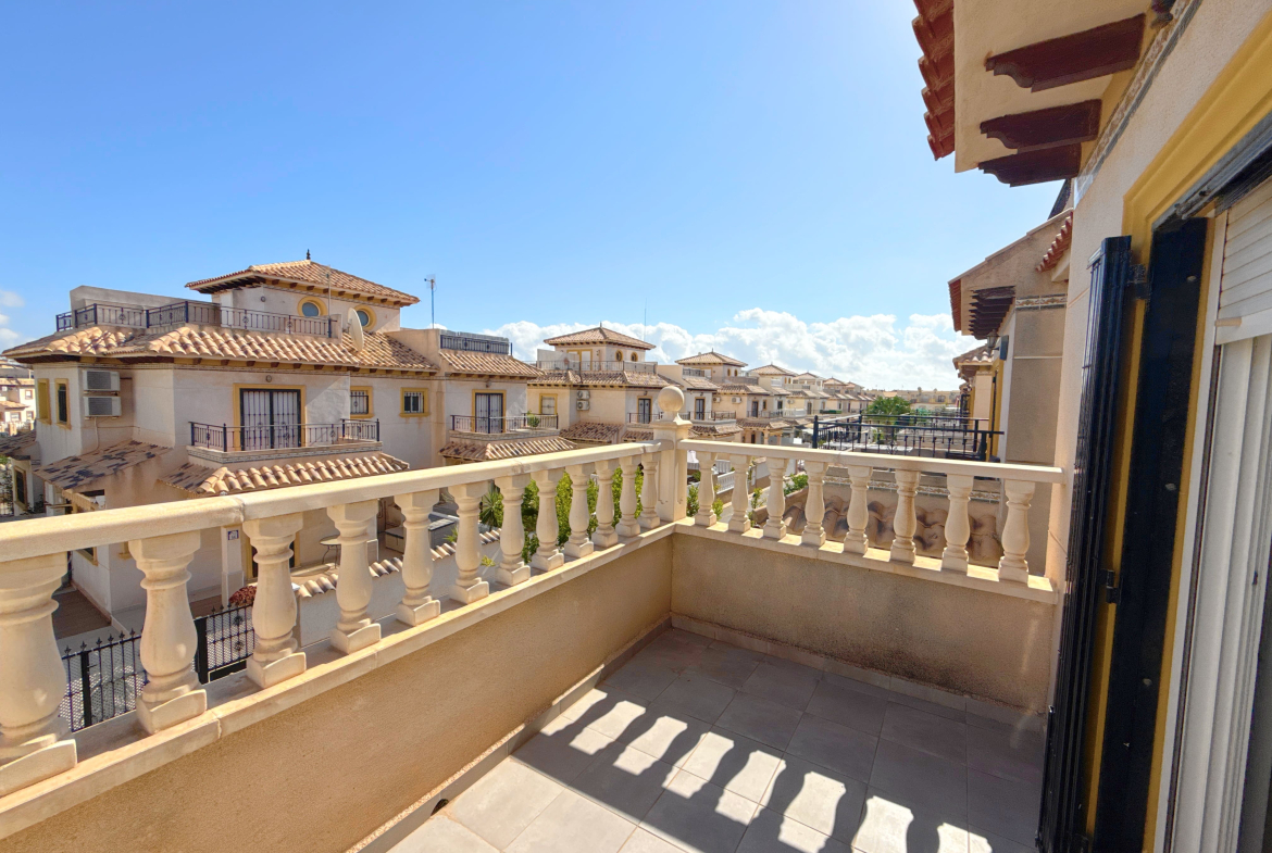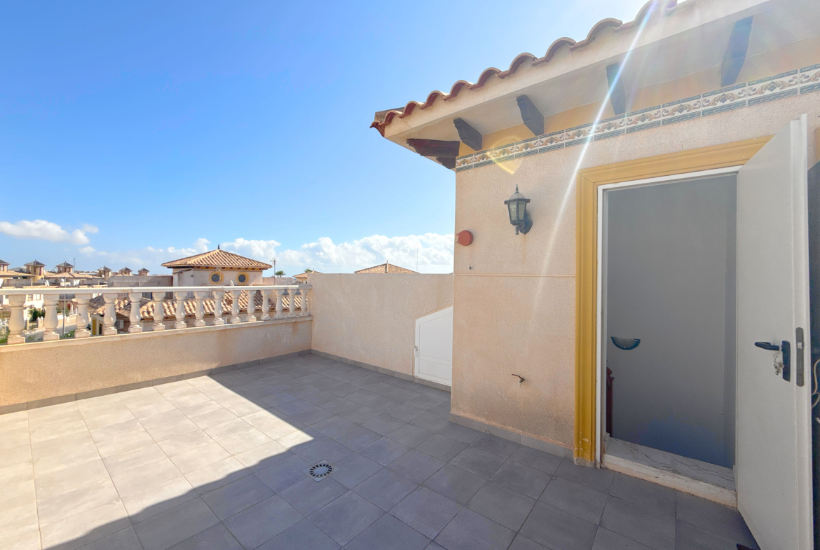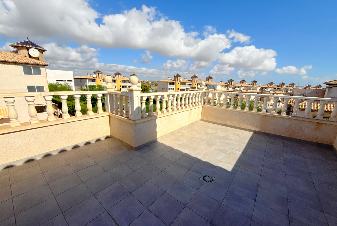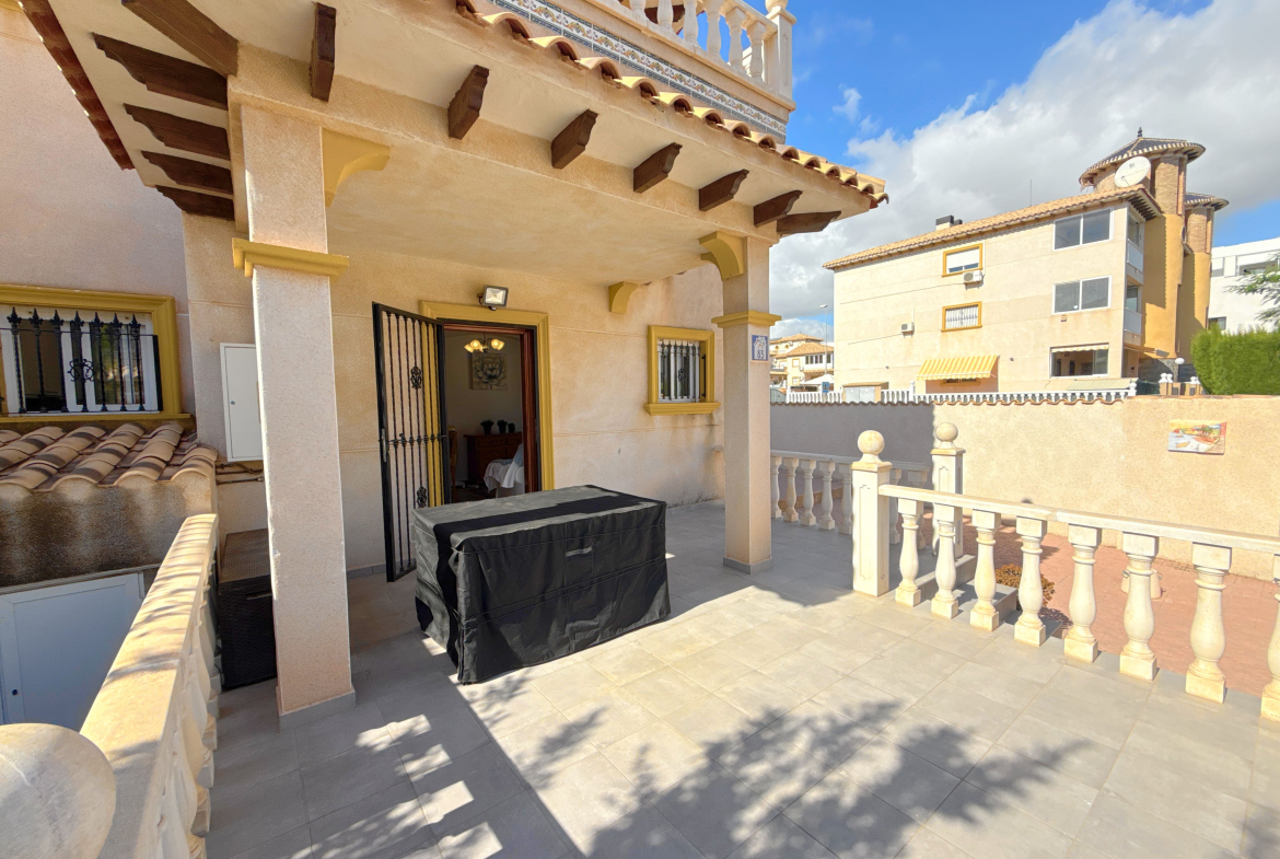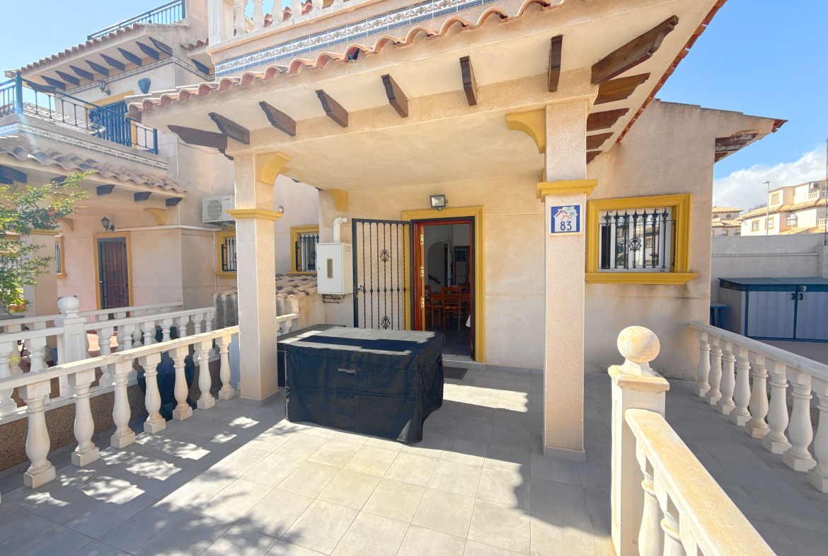 This new to the market La Zenia Quad house is set in the fantastic San Jose 4 complex and is walking distance to La Zenia, Cabo Roig and the Zenia Boulevard. This quad house is on a larger plot as its an end terrace house, the vendor has also extended the terrace out so you have lots of extra room for your out side furniture, although you do also have lots of room on the side of the house as well. The vendor has added a new kitchen and has re tiled the property on the inside and outside down stairs, on entry there is a an open lounge and kitchen area with a double bedroom and a w/c, with a marble staircase leading to another 2 double bedrooms and a full family bathroom plus off the main bedroom you have a fantastic balcony. The top level has a large solarium with panoramic views and also a sea view. The complex comes with a gorgeous commmunity swimming pool and gardens to relax in all day and is only a 15 min walk to the blue flag award winning beach.