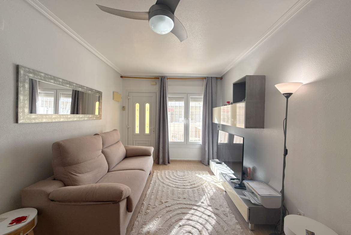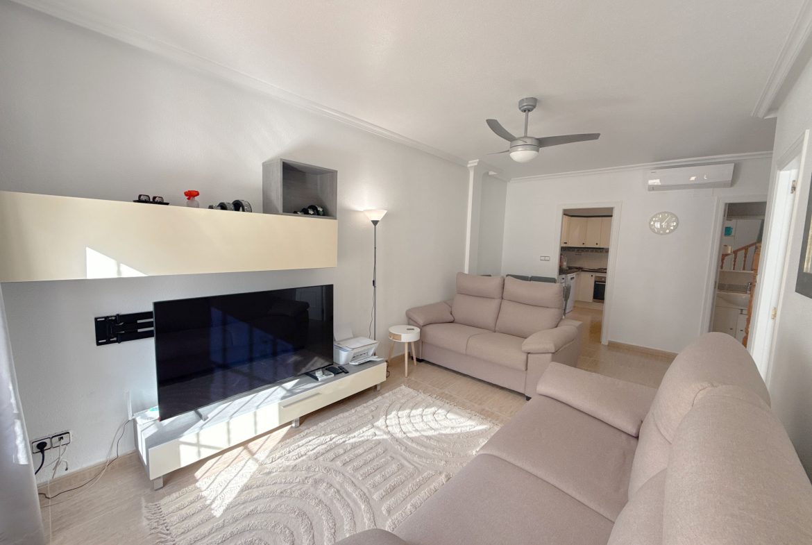 This new Townhouse in Vista Mar Cabo Roig beachside is set inside a lovley complex with a fantastic communal pool and garden area. The property is only 400 meters from the promenade of Cabo Roig and is a short stroll to the blue flag award winning beach and marina of Cabo Roig, and is only a short stroll to all the bars and restaurants and local facilities. This lovely townhouse has all been recently painted and has all new ac units through out the house and has a new modern double galzing installed, The property is south facing so has all the winter sun you need especially if you will be using your house in the winter time. The house has a lovely sunny front terrace and has a nice lounge and seperate kitchen with a double bedroom and walk in shower plus wc downstairs with 2 double bedrooms with 2 terraces and also another full family bathroom with walk in shower. This property must be seen due to price and beach side location.