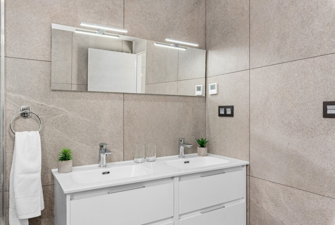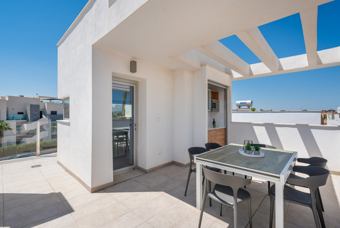 An exceptional contemporary style detached villa built over three floors and just 3 years old is immaculately presented.  You enter the west facing garden onto a large tiled terrace surrounding the private heated pool with Roman steps, with ample space for sun loungers plus off road parking. It is a private space with a dining/seating area complete with sun awnings and patio doors leading into the lounge.  On entering the villa itself you are met with a very spacious and open plan living area with high ceilings and lots of natural sunlight. There is a lounge with patio doors out to the swimming pool, a dining area and fully fitted kitchen. Also on this floor there is a guest cloakroom, and the master bedroom with an en-suite shower and dressing room area with large fitted wardrobes. Stairs lead to the first floor and 2 further double bedrooms, each with fitted wardrobes and a family bathroom. From the landing you can also access a large two level terrace with water and electric supply, perfect for a jacuzzi maybe! A further staircase leads to the fantastic solarium with lovely views of the surrounding area, plenty of dining and relaxing space and a superb summer kitchen with an electric shutter to protect from the sun/rain, with water and electric supply, a sink, fridge, microwave, cupboards, drawers and work surface. This simply stunning property is being sold fully furnished to a high standard and is an absolute gem not to be missed!