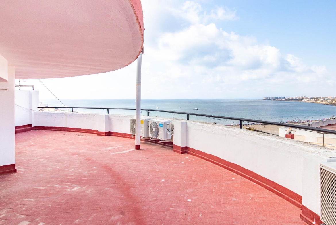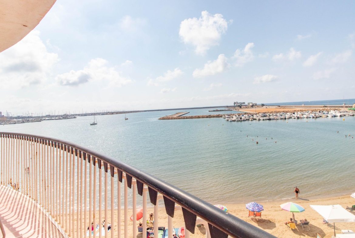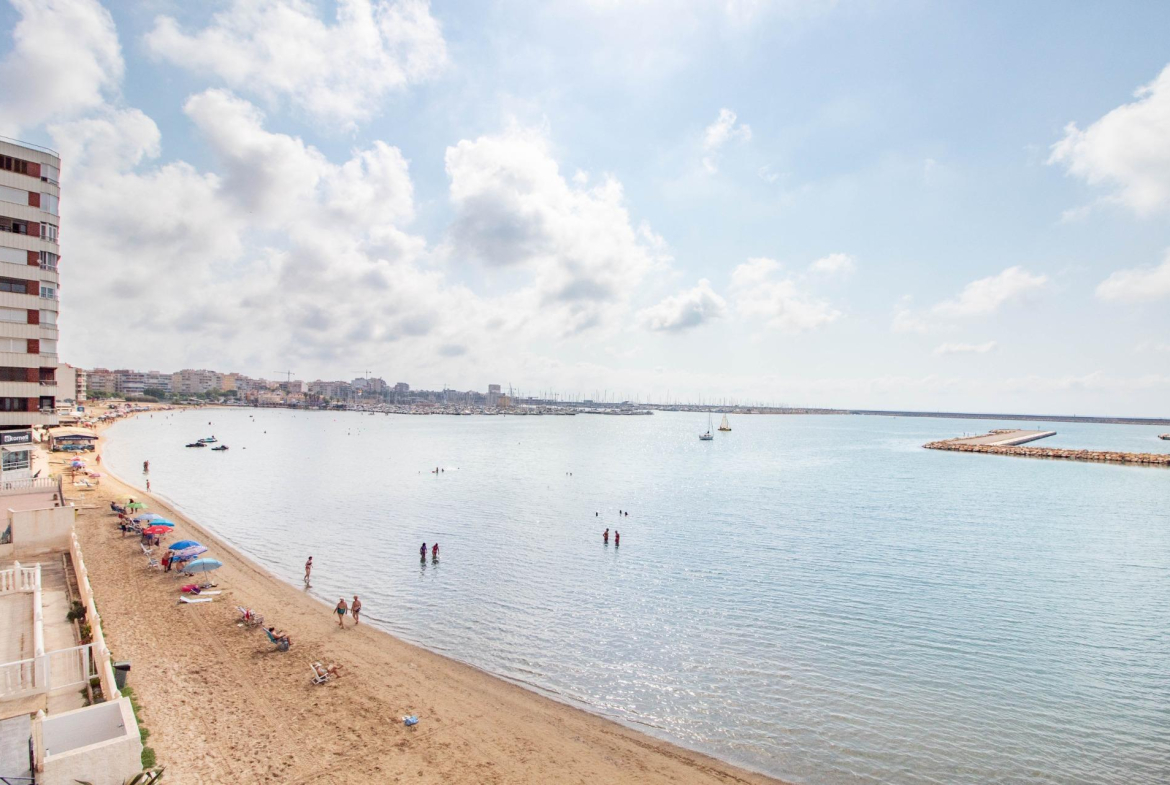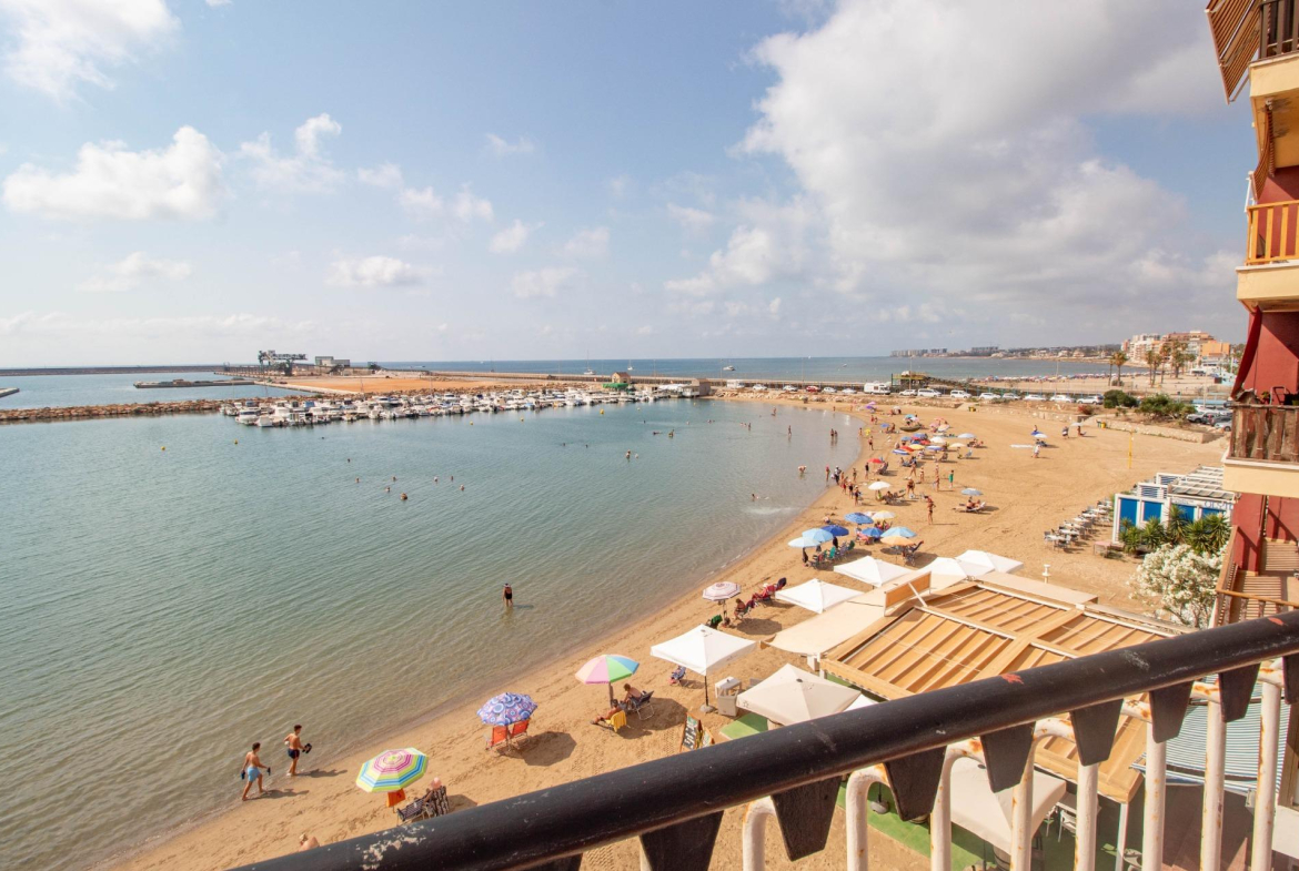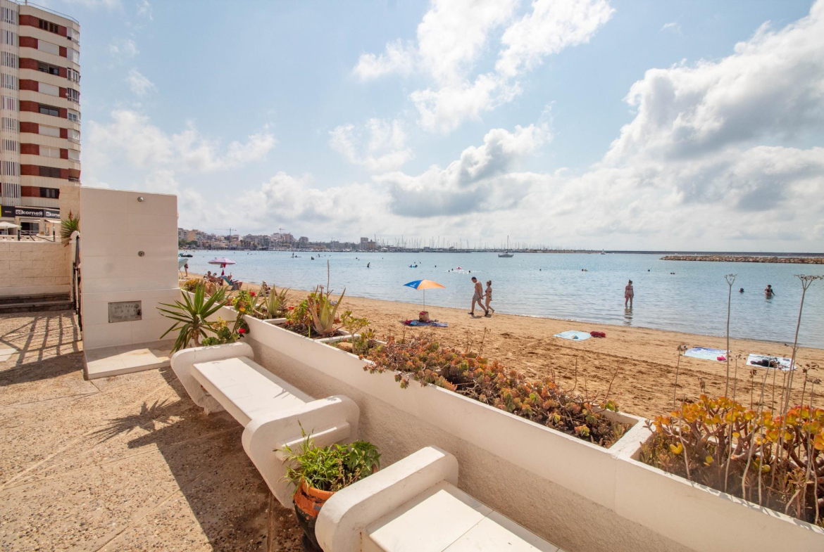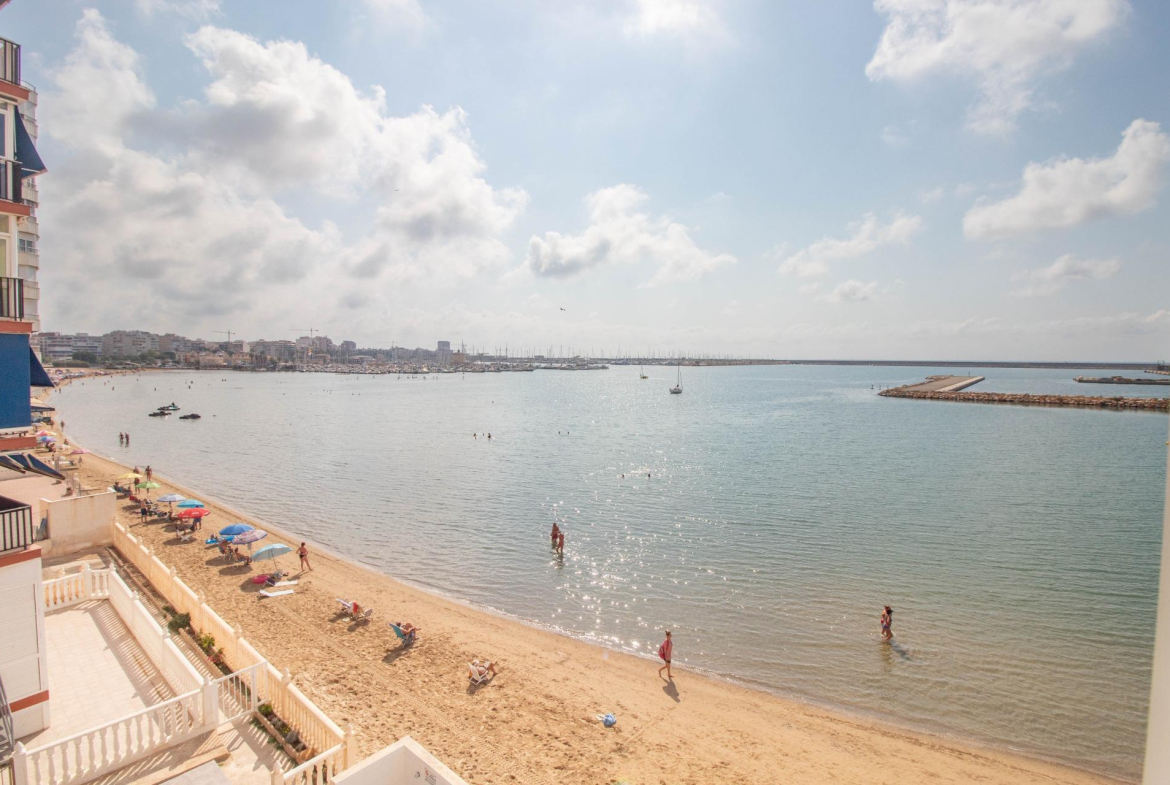 Ubicado en uno de los edificios más característicos de Torrevieja por su singular estructura, esta luminosa vivienda se sitúa en primera línea de la playa del Acequión, ofreciendo una experiencia de vida única junto al mar.~La propiedad cuenta con 3 dormitorios, salón y cocina independiente, todos con impresionantes vistas frontales al mar. Dispone además de un baño completo, lavadero y un agradable balcón orientado al sur, ideal para disfrutar del sol mediterráneo durante todo el año.~El edificio está equipado con ascensor y ofrece acceso a una terraza comunitaria en la última planta, desde donde se aprecian espectaculares vistas panorámicas de la bahía de Torrevieja.~Además, dispone de acceso directo a la playa, con una zona comunitaria equipada con ducha y bancos, perfecta para relajarse después de un baño en el mar. Zona de aparcamiento comunitario para carga y descarga. ~~Una oportunidad ideal tanto como residencia habitual como inversión vacacional, en una de las zonas más deseadas de la costa alicantina. Ubicación excepcional en primera línea de la Playa del Acequión, una zona tranquila de aguas calmadas, ideal para familias y para vivir todo el año. A pocos pasos también de la Playa de Los Náufragos, con paseo marítimo, chiringuitos y todos los servicios necesarios. Una de las zonas más cómodas y valoradas de Torrevieja.