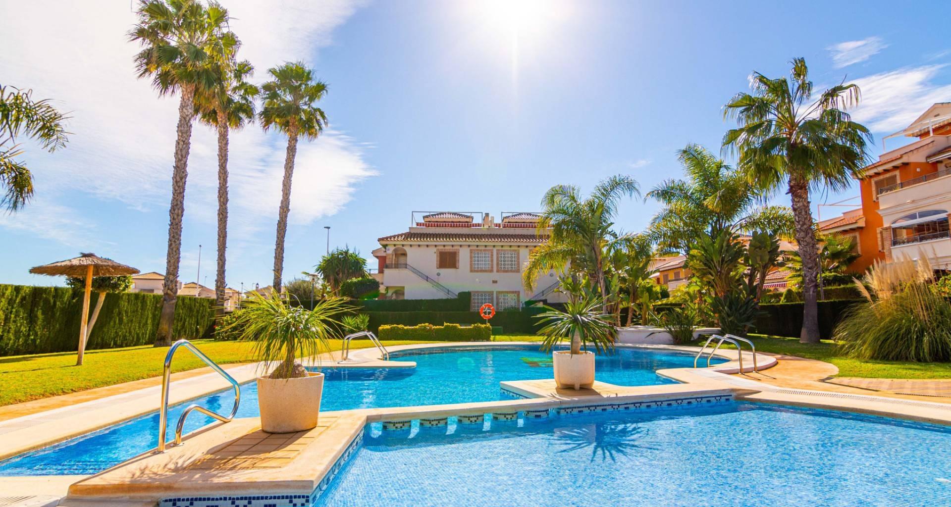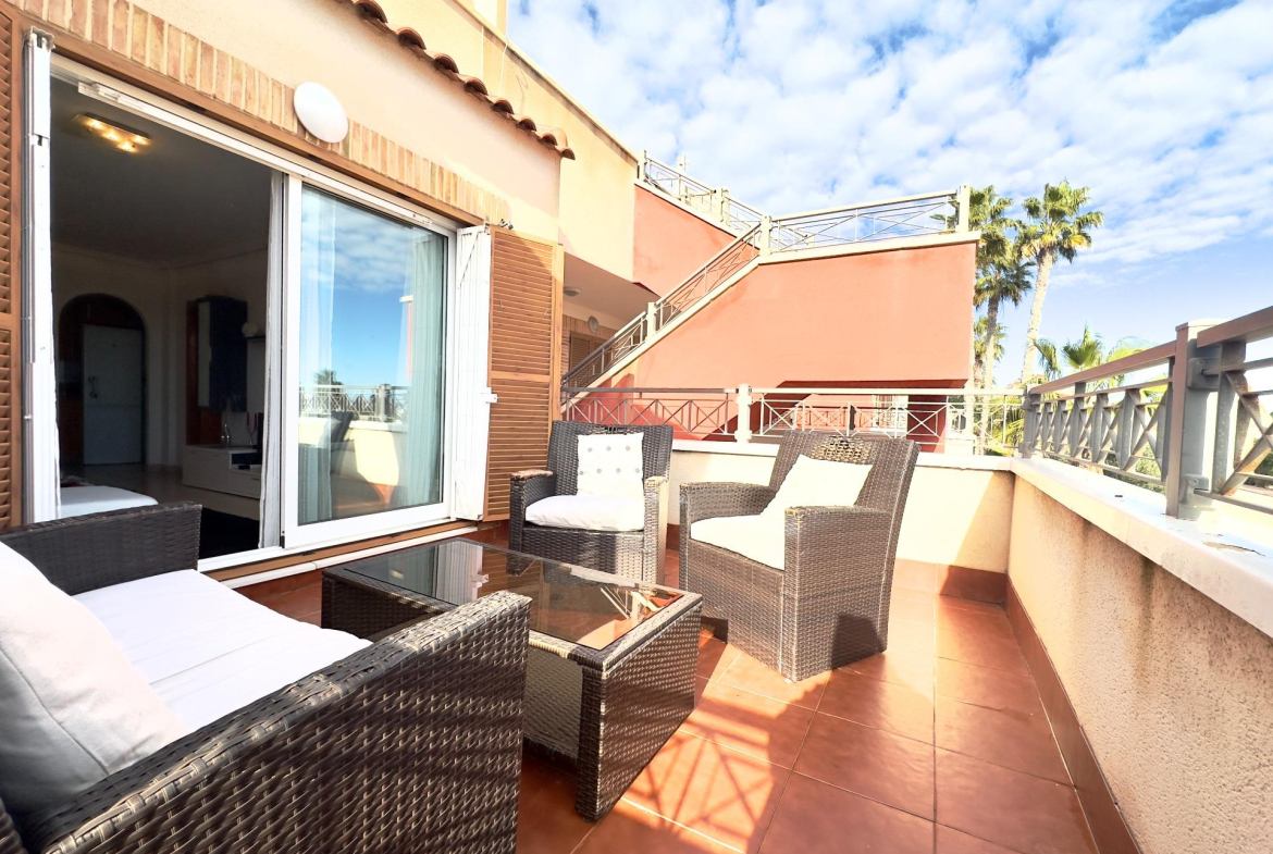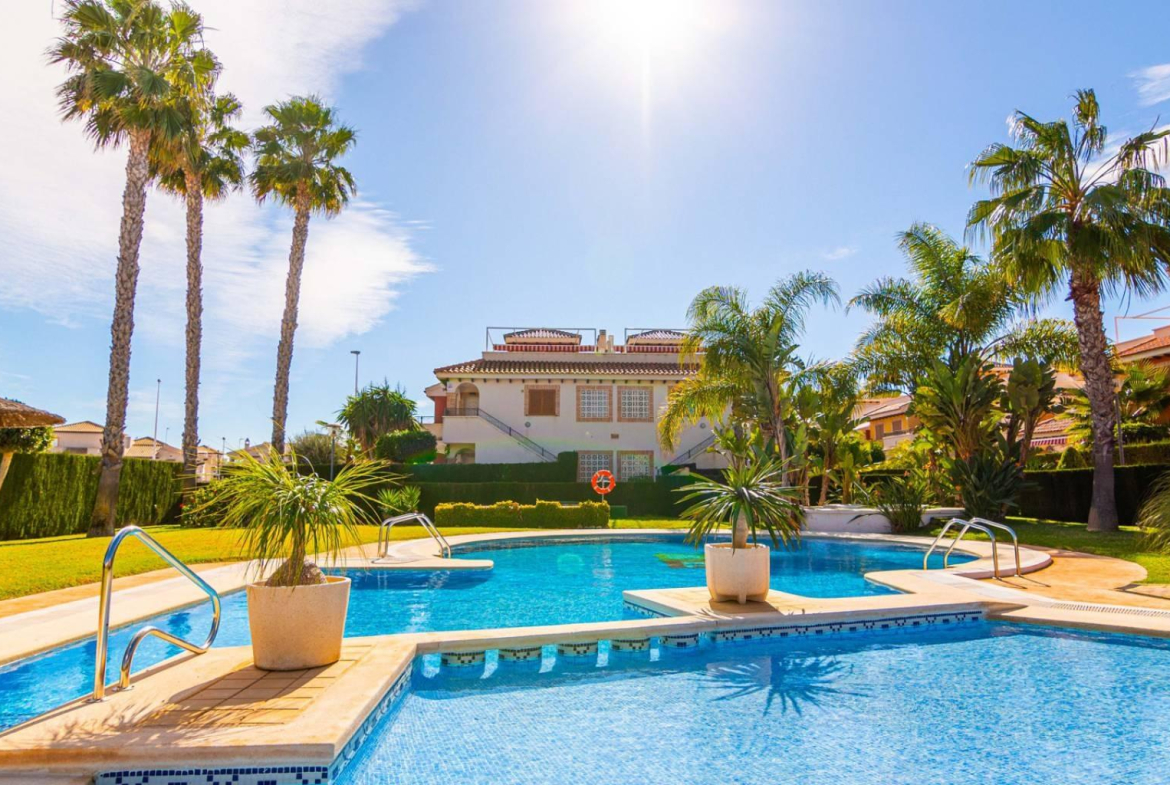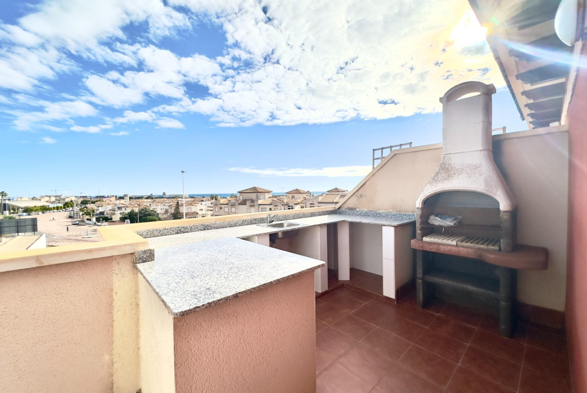 Bungalow en planta alta con solárium privado, piscina comunitaria con jacuzzi y vistas al mar.~Se vende acogedor bungalow en planta alta, ideal para disfrutar del clima mediterráneo durante todo el año. La vivienda cuenta con 2 dormitorios, 1 baño completo y una cocina americana integrada en un luminoso salón, creando un espacio cómodo y funcional. Dispone además de lavadero independiente y trastero, ofreciendo un práctico espacio de almacenaje.~~Desde el salón se accede a un balcón con vistas lejanas al mar, perfecto para relajarse al aire libre. En la parte superior, destaca su espectacular solárium privado de 39 m2, equipado con ducha, barbacoa y zona de fregado, ideal para disfrutar del sol y organizar reuniones con total privacidad.~~El residencial ofrece una cuidada piscina comunitaria con jacuzzi, rodeada de zona verde de césped y sombrillas, creando un entorno perfecto para el descanso y el ocio. Además, cuenta con club social, ideal para encuentros y actividades.~~Una vivienda ideal como residencia habitual, segunda vivienda o inversión, situada en un entorno tranquilo y con excelentes zonas comunes para disfrutar del estilo de vida mediterráneo.