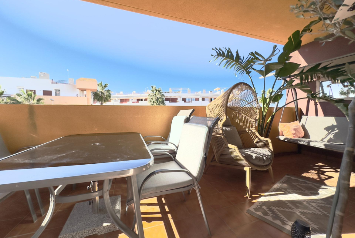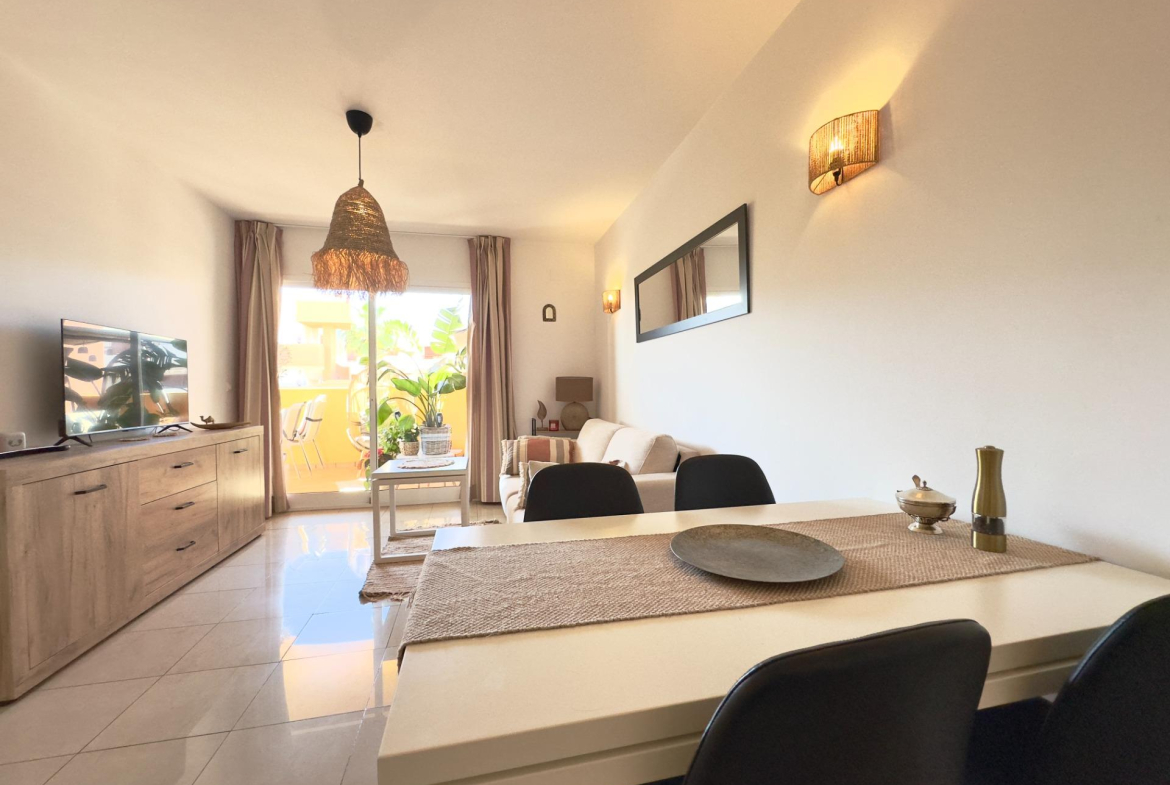 Este encantador apartamento, ubicado en la segunda planta de un moderno complejo residencial cerrado, ofrece un estilo de vida cómodo y tranquilo. Con una distribución bien pensada, la vivienda cuenta con dos dormitorios amplios. Ambos dormitorios comparten un baño espacioso y bien iluminado, con acceso directo desde cada habitación, lo que aporta una gran funcionalidad para su uso diario.~~El salón, amplio y luminoso, se conecta con una cocina americana completamente equipada, que incluye electrodomésticos, perfectos para quienes disfrutan de la cocina abierta. Este diseño de concepto abierto facilita la integración de los espacios, haciendo que el ambiente sea más amplio y acogedor. Además, desde el salón, se accede a un balcón de 15 metros, ideal para disfrutar de vistas despejadas y de un buen momento al aire libre, ya sea para tomar el sol, leer o compartir una comida al fresco.~~El apartamento también cuenta con un práctico lavadero, que aporta un toque de funcionalidad adicional al hogar, permitiendo organizar mejor el espacio y mantener todo en orden.~~El complejo residencial El Bosque es muy popular, con acceso restringido y zonas comunes muy cuidadas. Uno de los principales atractivos del lugar es su gran piscina, rodeada de césped natural, perfecta para disfrutar durante los cálidos días de verano. La piscina ofrece un espacio para relajarse, hacer ejercicio o pasar tiempo con la familia y amigos.~~Por último, el apartamento incluye una plaza de parking privada, lo que añade un plus de comodidad y seguridad al contar con espacio exclusivo para el estacionamiento de vehículos. Este apartamento es ideal para quienes buscan una vivienda tranquila, moderna y bien equipada en una ubicación residencial exclusiva.