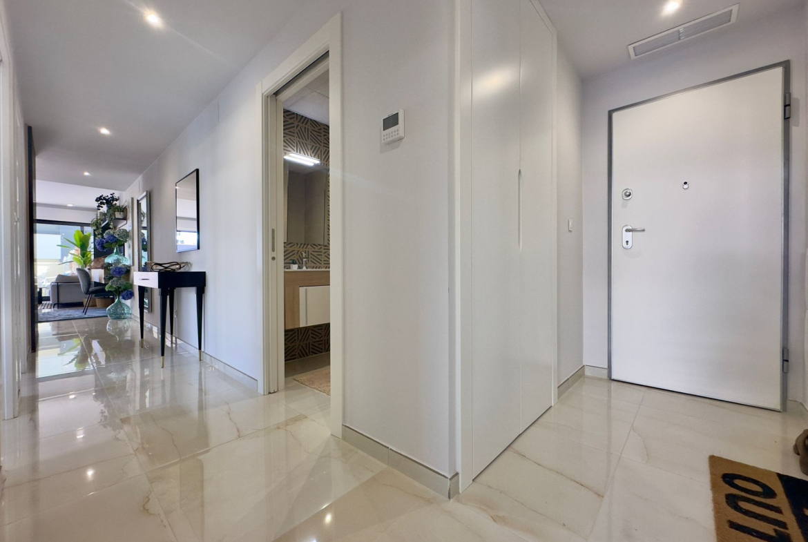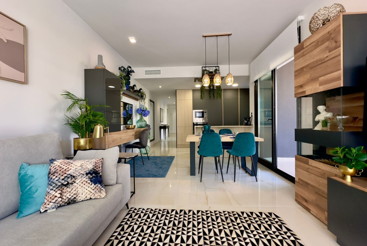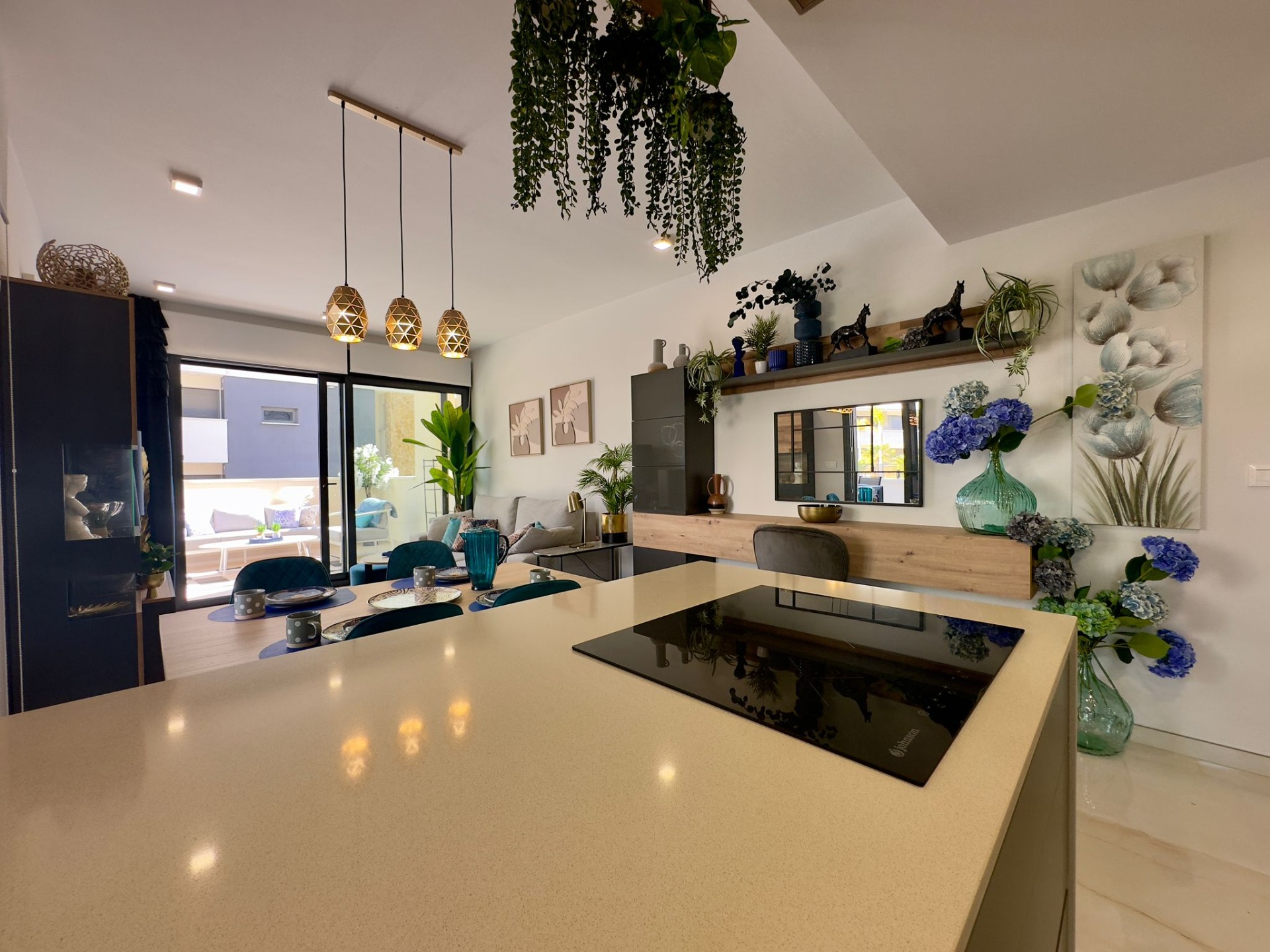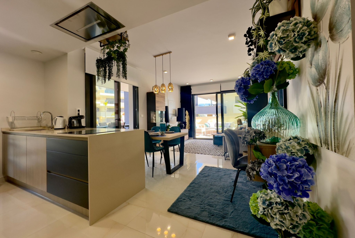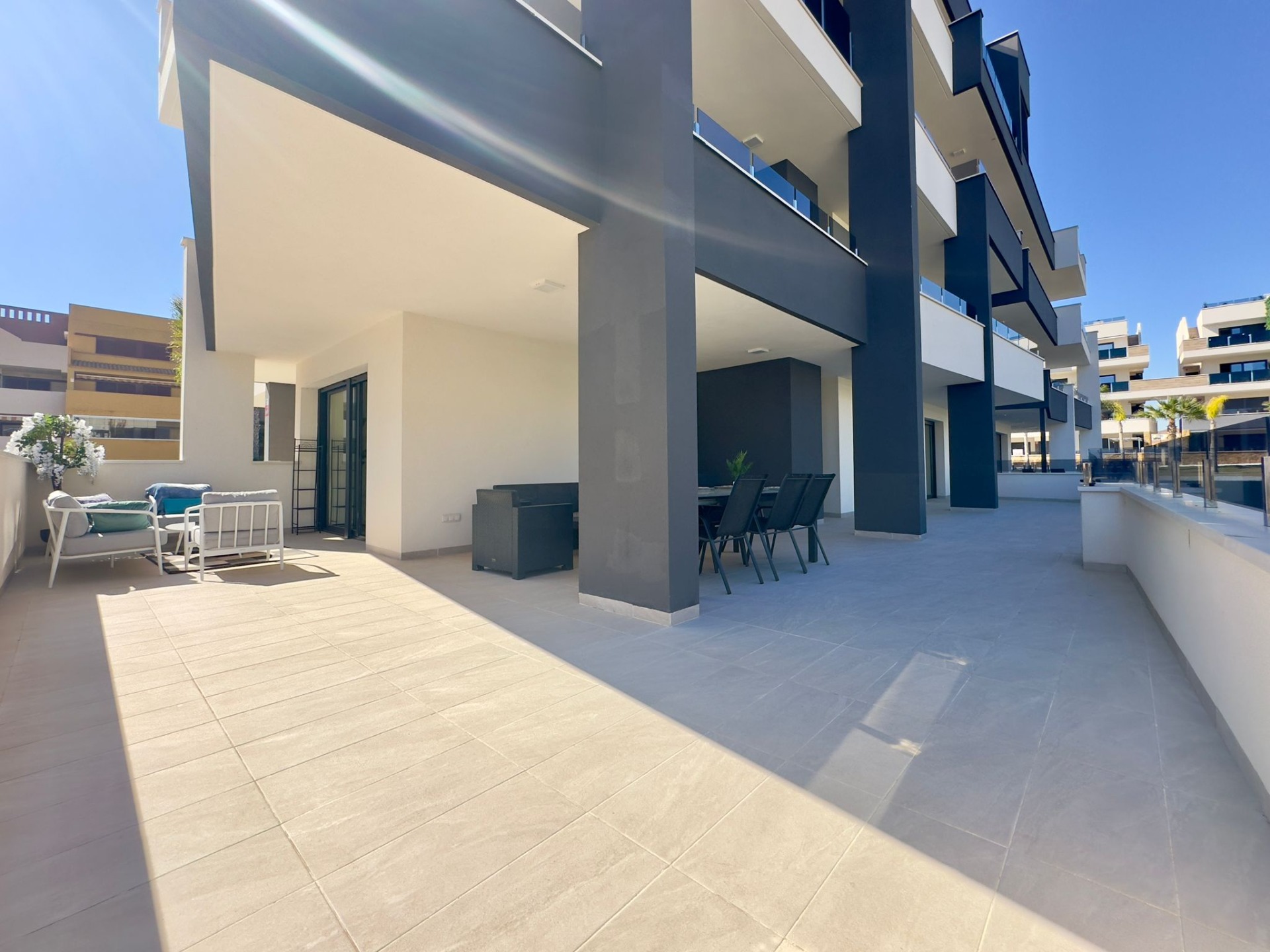 Descubre esta espectacular vivienda nueva a estrenar en el exclusivo residencial Amanecer Deluxe, ubicado en la codiciada zona de Playa Flamenca.~~Se trata de un amplio apartamento en planta baja que destaca por su impresionante terraza privada de aproximadamente 136 m2, ideal para disfrutar del clima mediterráneo todo el año, organizar reuniones al aire libre o simplemente relajarse con vistas despejadas al mar y a las zonas verdes.~~Características principales:~~3 dormitorios amplios, todos exteriores~~2 baños completos (uno de ellos en suite)~~Luminoso salón-comedor con acceso directo a la terraza~~Cocina moderna~~Vistas al mar y a jardines~~2 plazas de garaje incluidas~~Trastero incluido en el precio~~ Zonas comunes exclusivas:~~Amplias zonas verdes y ajardinadas~~Piscina comunitaria~~Parque infantil~~Gimnasio totalmente equipado~~Sauna~~Una vivienda perfecta tanto como residencia habitual, segunda vivienda o inversión, gracias a su amplitud, privacidad y excelentes prestaciones.