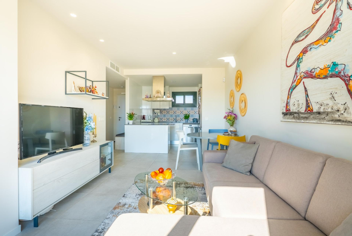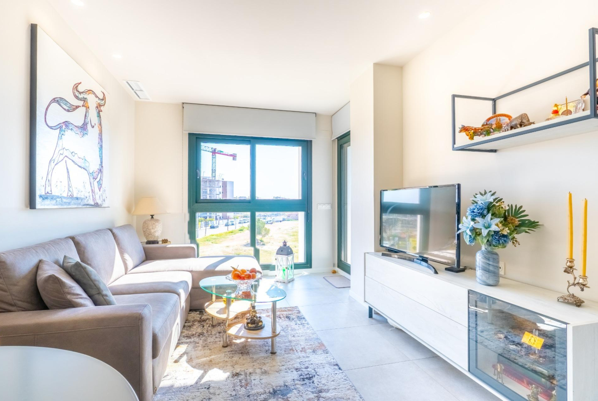 We present to you this modern apartment located in a gated residential complex with green areas and a swimming pool. This is a new-build resale property, in excellent condition and ready to move into.~~It is situated just 700 meters from one of the best beaches in Mil Palmeras, in the prestigious area of Orihuela Costa. This highly sought-after location is ideal for enjoying the Mediterranean climate, peace and quiet, and an active, healthy lifestyle.~~The apartment features a comfortable and functional layout, bright and inviting. A spacious south-facing terrace with large panoramic windows and views of the park and the sea makes it an excellent place to relax and enjoy the sunny weather. The modern living room is connected to the dining area and an open-plan renovated kitchen, fully equipped with furniture and appliances.~~The property includes 2 bedrooms with built-in wardrobes, 2 fully equipped bathrooms, and a private storage room—perfect for keeping the home organized. A private parking space is also included in the price.~~Excellent location, close to the sea, leisure options, and all essential services. Just 700 meters from the beach, with supermarkets, restaurants, and amenities nearby, and only a 10-minute drive to the Zenia Boulevard.~~Located in a quiet and safe area, it is perfect for comfortable living. With over 300 sunny days a year and a mild climate, you can enjoy outdoor living, seaside walks, water sports, golf, and social activities.~~An ideal option for those seeking a peaceful and exclusive seaside lifestyle. Your new home in Mil Palmeras awaits: comfort, sunshine, and tranquility just steps from the beach.~~The property price does not include notary fees, registration costs, or taxes, which may vary according to current legislation in the Valencian Community.