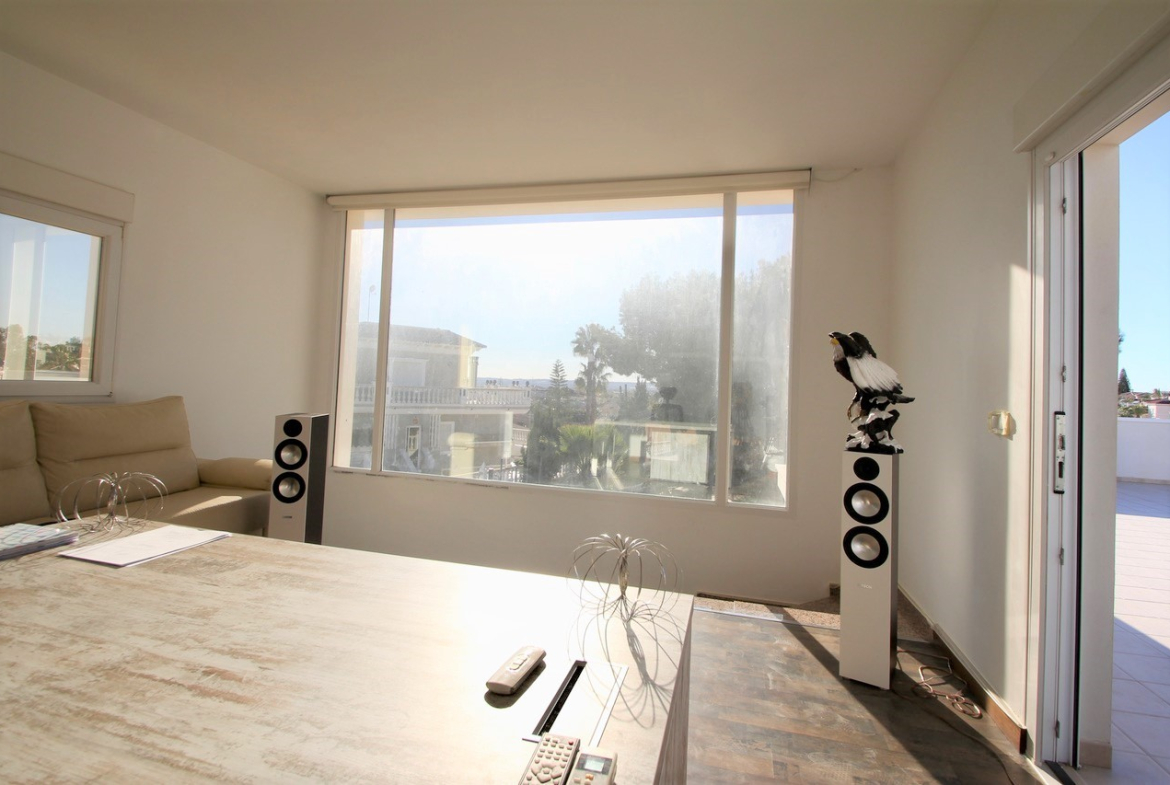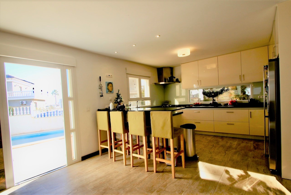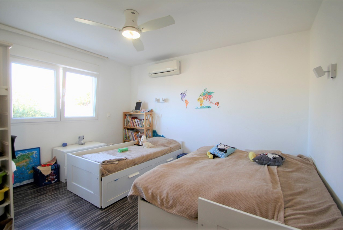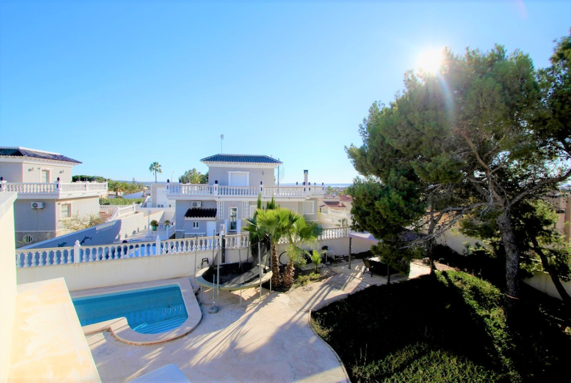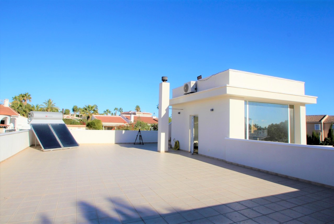 Renovated and well-maintained villa on a plot of 1.254 m2 with a large landscaped green garden, a large private pool (5×12) and outdoor dining areaThe property has a built surface area of 270 m2 which distributes over a living area, an open plan kitchen with dining area3 double bedrooms and a family bathroomA semi-basement which offers a laundry room, a games room, an office and a toiletOn the top floor level there is another office / lounge area with access to a large solarium overlooking the surrounding areasOff road parking on the plot for up to 3 cars, there are also solar panels for water located on the roof terrace and another storage room off the property with a boiler room.The property is sold partly furnished subject to inventory and with AC