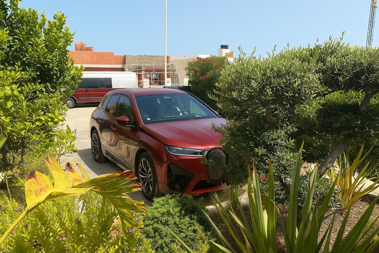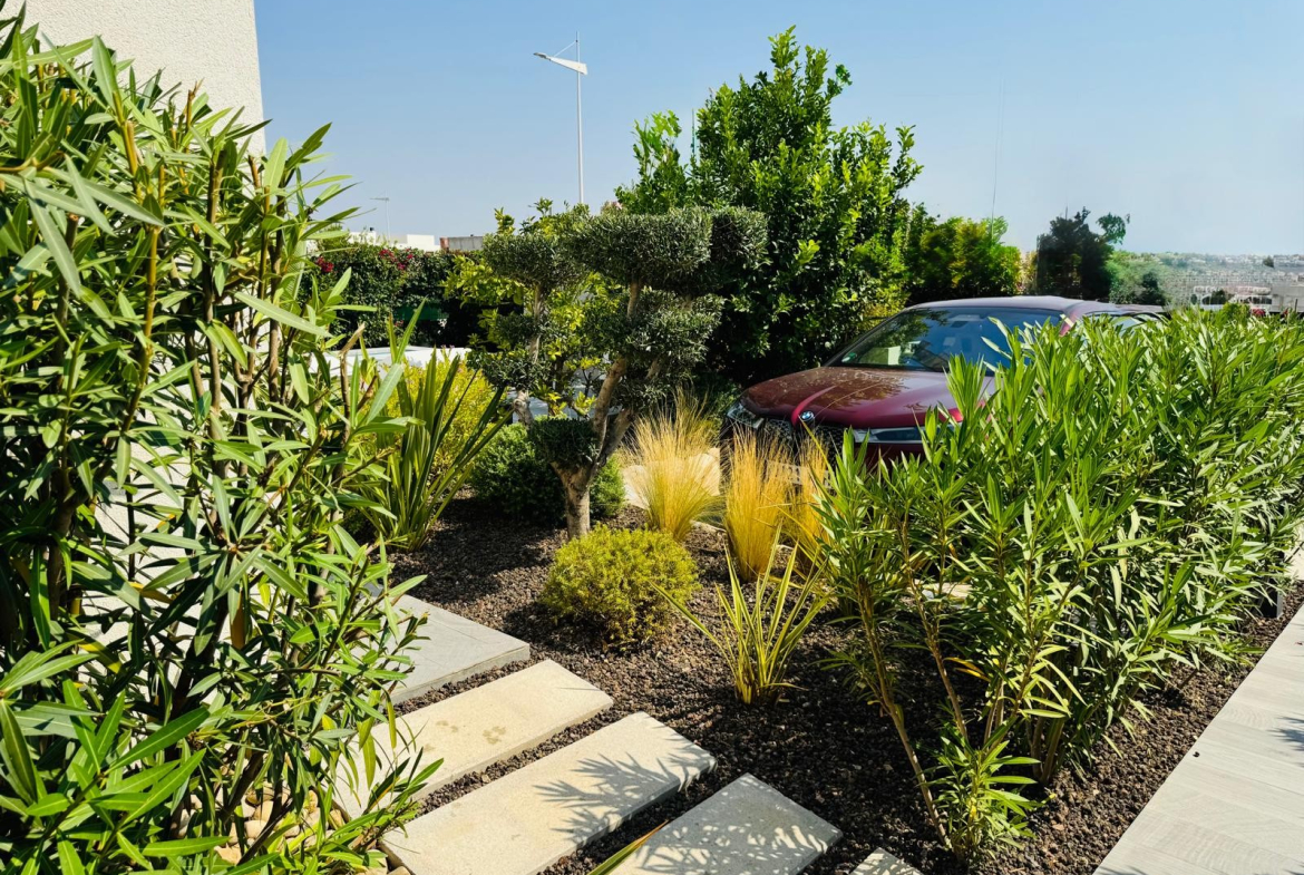 Enjoy Mediterranean living in the beautifully landscaped garden with palm trees, flowers, and fruit trees. The east-facing terrace with a built-in BBQ is ideal for relaxed outdoor dining, while the private pool with wide entry steps offers the perfect spot to unwind. Residents also have access to a shared pool within the community.