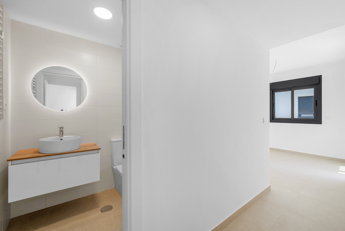 The master bedroom has its own en-suite bathroom, while the second bedroom connects to a stylish guest bathroom. Built with high-quality materials and equipped with air conditioning, the apartment ensures year-round comfort.