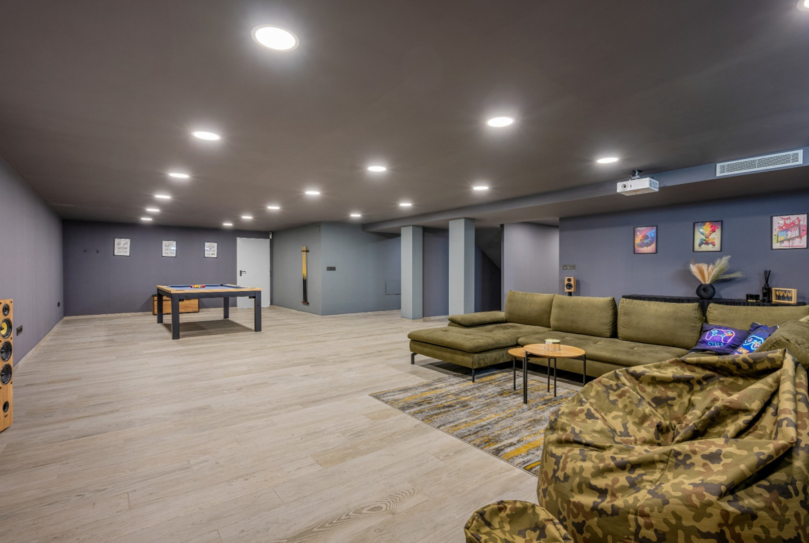 The huge basement is designed for leisure and convenience, boasting a cinema room, pool table area, and garage, along with an additional bedroom that comfortably accommodates up to four people — perfect for guests or family gatherings.