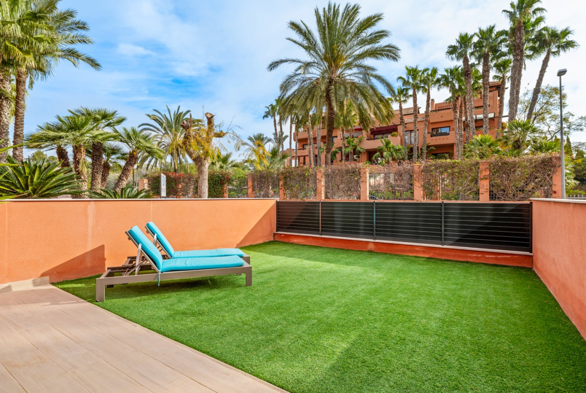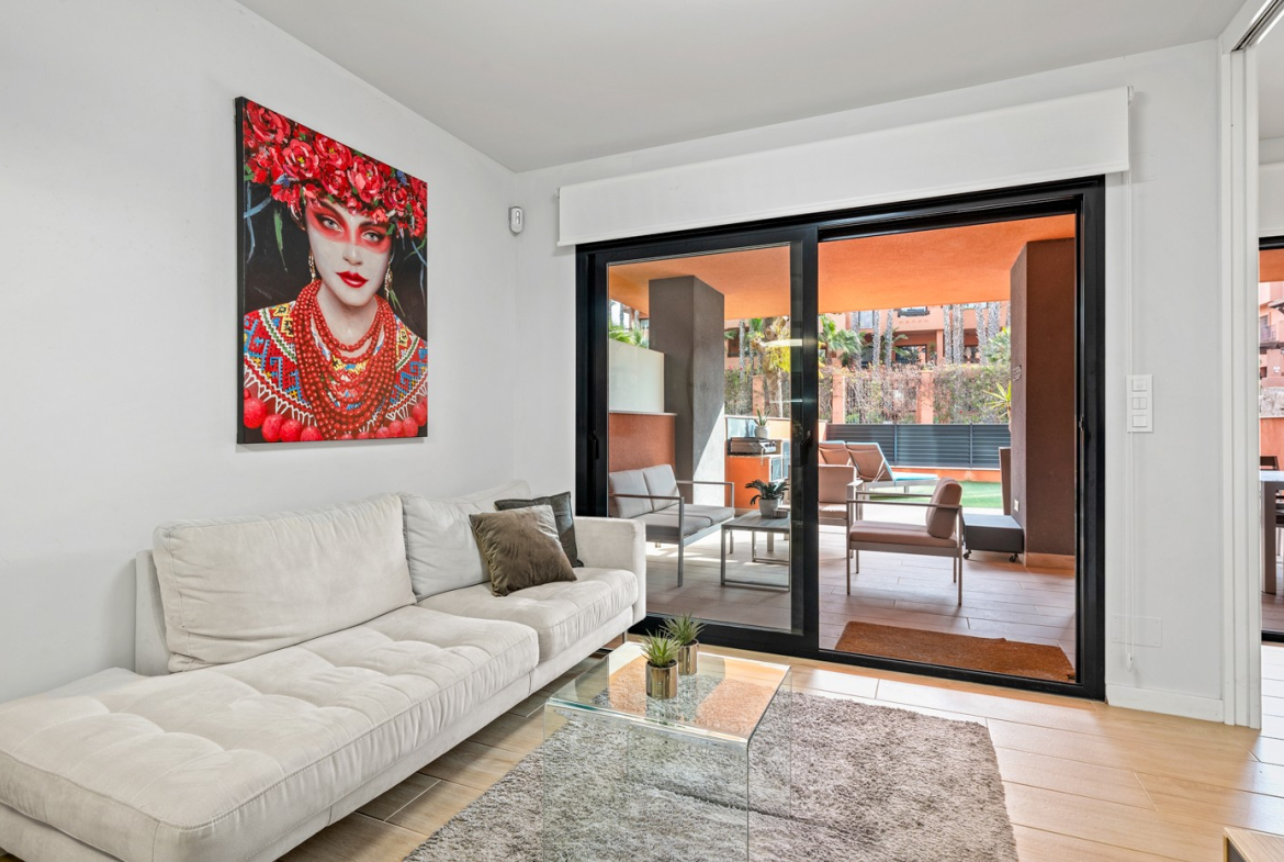 The property features two bedrooms and two bathrooms and offers a practical layout with an open living area and kitchen, creating a bright and comfortable atmosphere. The living room provides direct access to the terrace and garden, ensuring a smooth transition between indoor and outdoor living.
