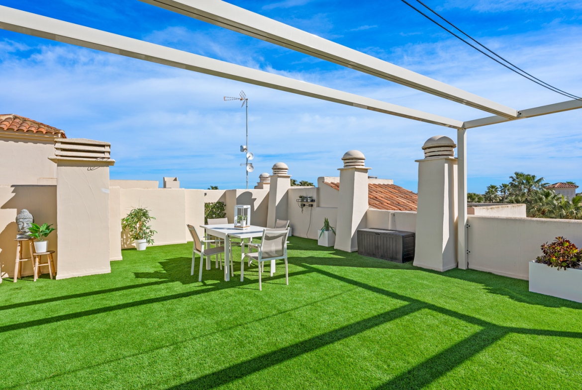 This stylish property is completely ready for immediate use. Thanks to its favorable south-facing orientation, you can enjoy sunshine on the terrace all day long, well into the evening, with beautiful views of the landscaped surroundings. A staircase on the terrace leads to the spacious private rooftop terrace, where you can enjoy stunning panoramic views.