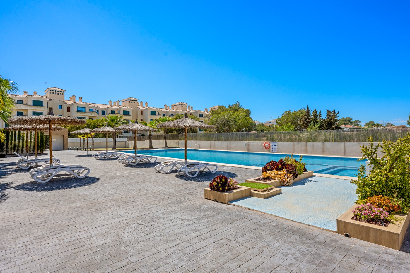 The residential complex offers a beautiful communal garden with palm trees and various plants, as well as a swimming pool and jacuzzi—perfect for relaxing in a pleasant and green environment.
