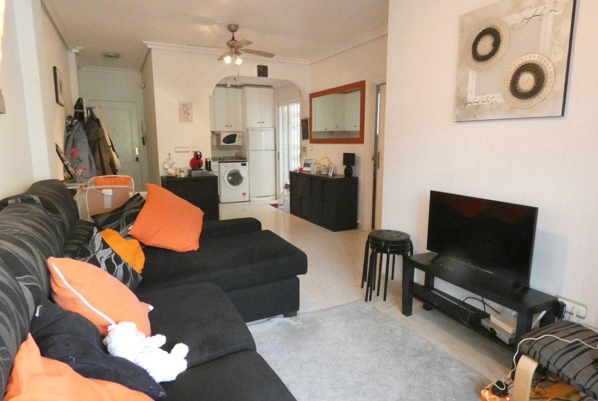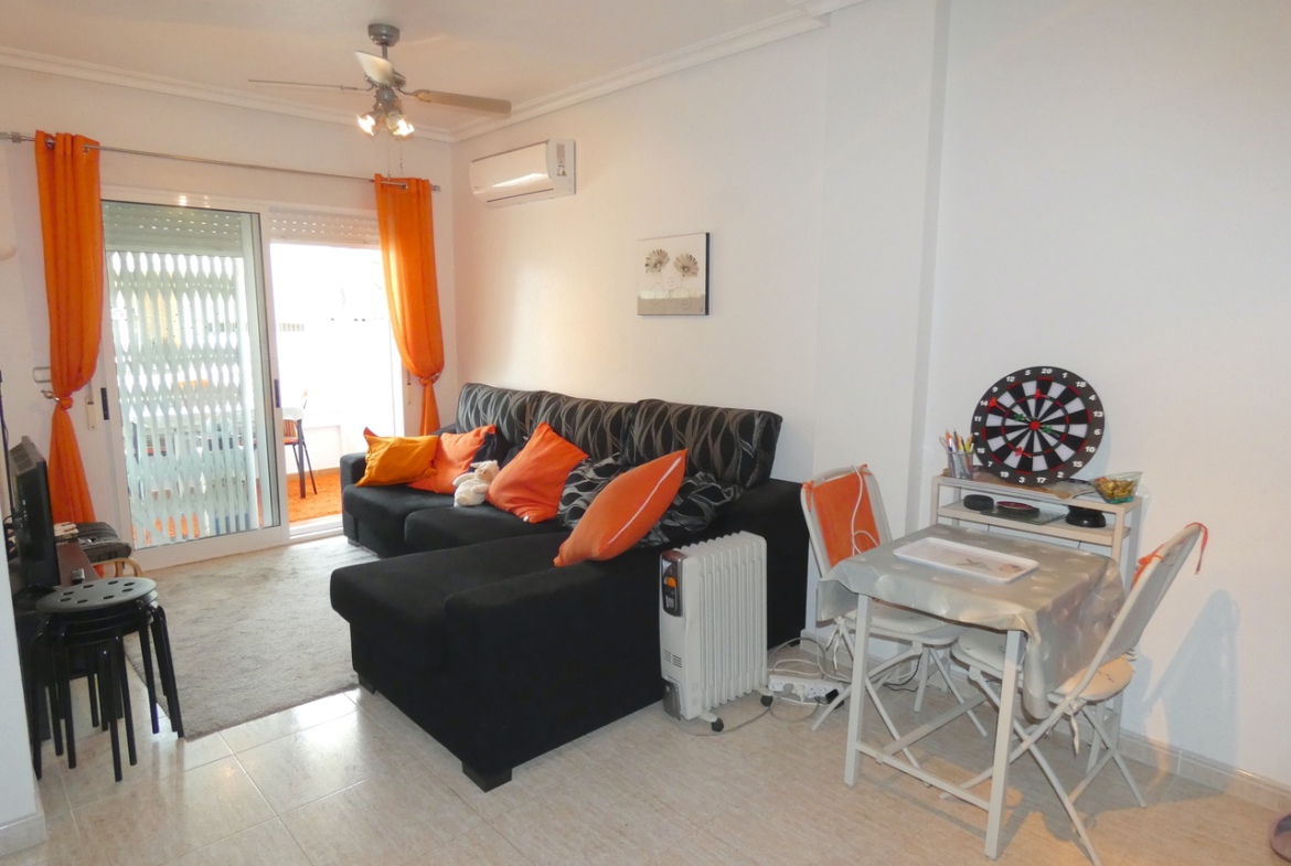 This spacious ground-floor 1-bedroom apartment is set within a fantastic, well-maintained complex with a communal swimming pool, situated in a tranquil area of Almoradí with views over the surrounding mountains and open countryside, yet still within walking distance to all local amenities. Supermarkets, the medical centre, bars, restaurants and local shops are all just moments away, offering the perfect balance between peaceful living and everyday convenience.The apartment features a bright open-plan living and kitchen area, ideal for modern living. Just off the kitchen, there is a useful interior patio, perfect for storage or utility use.Both the living room and the generously sized bedroom offer direct access to the balcony, which is fitted with retractable glass curtains, allowing the space to be enjoyed all year round as an additional living or dining area.This is a large one-bedroom apartment, fitted with new air-conditioning units in both the living room and bedroom for year-round comfort. Security grills are already installed, providing added peace of mind.Conveniently located, the property is just a 35-minute drive to the airport and 15 minutes to the coast, making it an excellent choice for permanent living, holidays or investment.Don’t miss out on this fantastic opportunity to own a quality apartment in a peaceful yet central location in Almoradí.