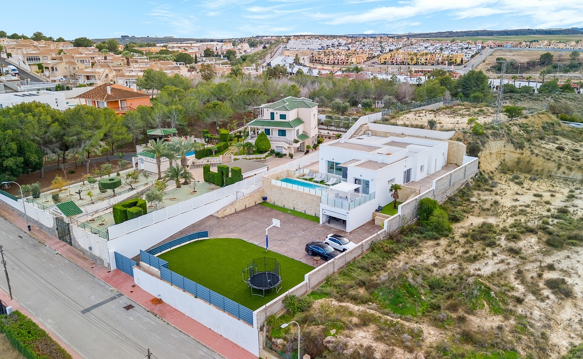 Modern Detached Villa in Lomas De Juliana, Algorfa – Almoradi Discover the perfect blend of luxury and comfort in this fantastic modern 4-bedroom, 3-bathroom detached villa located in the prestigious residential area of Lomas De Juliana. Just a stone’s throw away from the luxurious 5-star La Finca Golf Resort, this property offers an enviable lifestyle in one of the most sought-after locations, often referred to as the Beverly Hills of the Vega Baja.Constructed in 2019, this villa sits on a substantial yet manageable plot of 1634 sqm, providing ample outdoor living space. Enjoy sun-soaked days by the private swimming pool or entertain guests in the outdoor dining area. The spacious driveway leads you to a generously sized lounge and a larger than average fully fitted kitchen, perfect for culinary enthusiasts. With living and sleeping areas all on one level, convenience is at your fingertips.The current owner has also updated the property wih the latest technology and so it is a Smart Home that be controlled a the touch of the button from your mobile phone.The villa features a large master bedroom with a dressing area and en-suite bathroom, along with two additional guest bedrooms served by a family bathroom. A separate utility room and storage space add to the practicality of this home. Step outside to a spacious sun terrace that boasts stunning views over the Vega Baja, or fire up the large outdoor kitchen and barbeque area for unforgettable gatherings.Situated within walking distance of the local tennis club and just a quick drive to Algorfa village, this property combines tranquility with accessibility. Plus, the beautiful coastline is only 20 minutes away, making it an ideal retreat for sun-seekers and golf lovers alike. Don’t miss out on this incredible opportunity to own a piece of paradise!