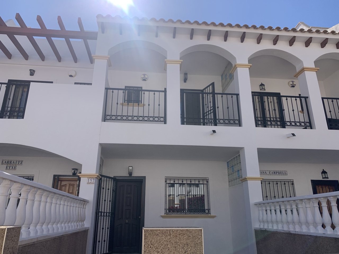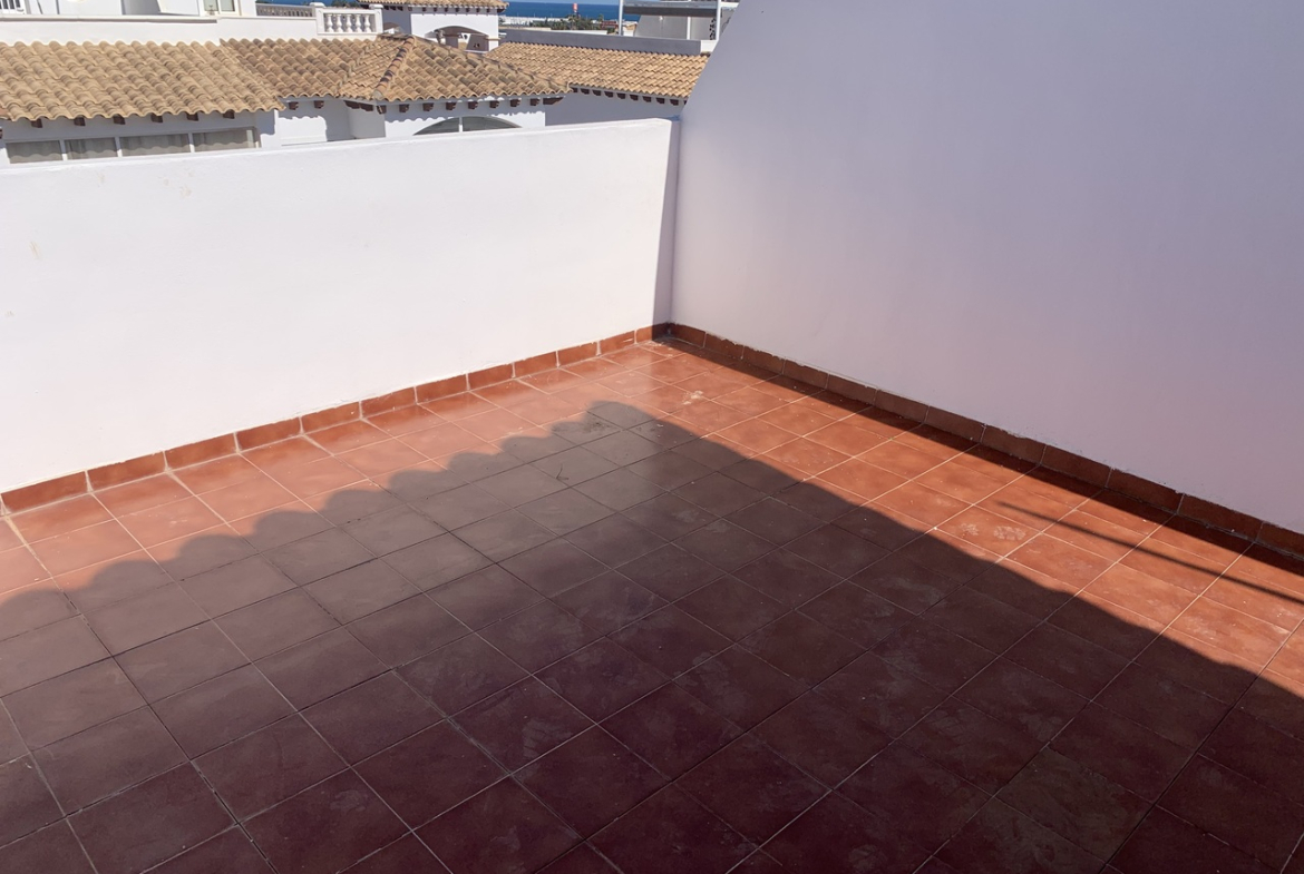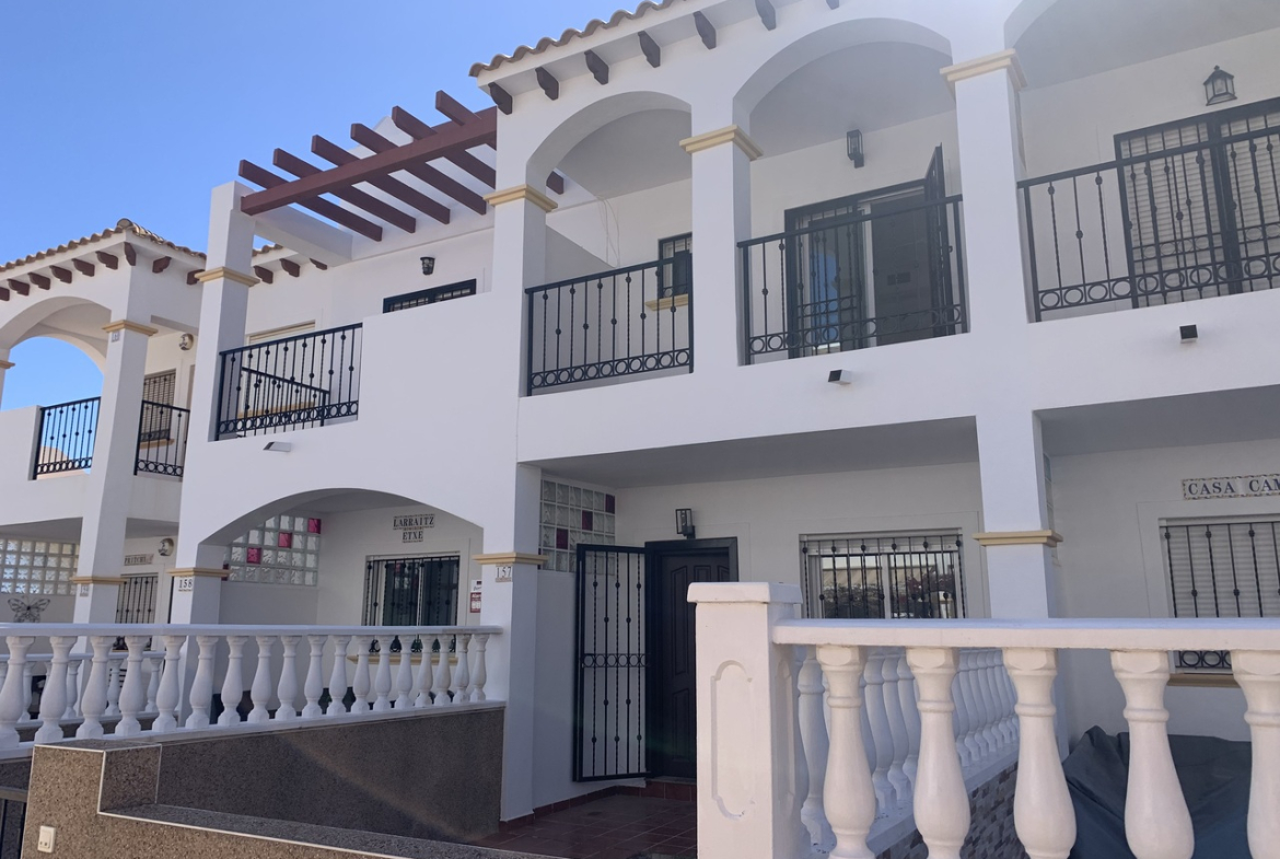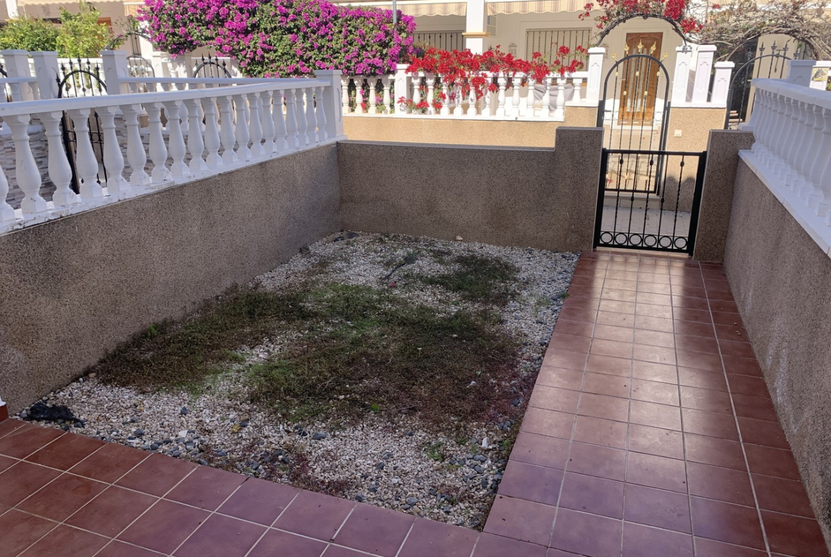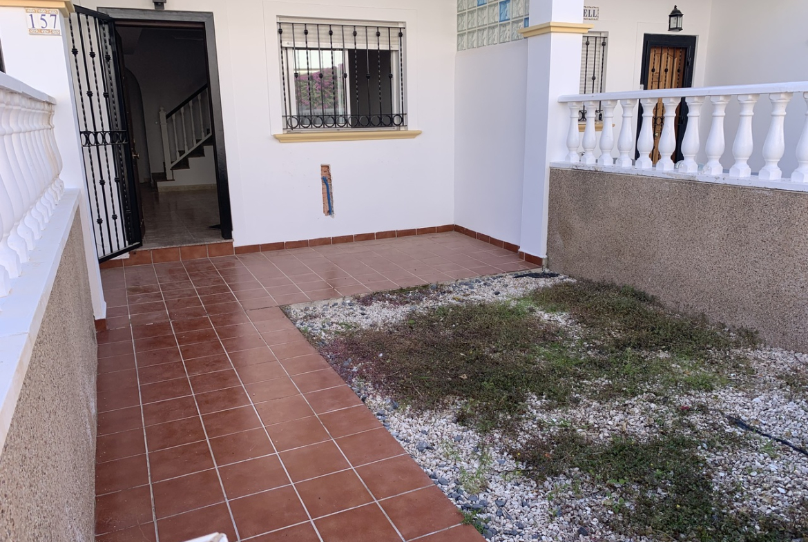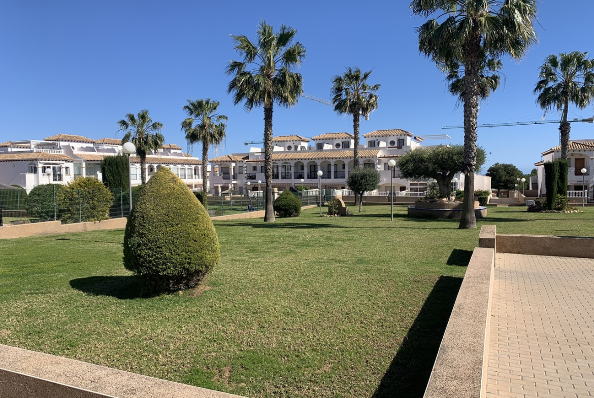 Stunning 2 Bedroom Townhouse in La Cinuelica R15, Punta PrimaDiscover the charm of this stunning 2 bedroom townhouse located in the desirable La Cinuelica R15, Punta Prima. This property boasts a spacious front garden, perfect for outdoor relaxation and entertaining friends and family. The gated secure complex offers peace of mind, complemented by beautiful communal gardens and two inviting community pools, ideal for those warm summer days.Step inside to find an open-plan living and dining area, featuring a fitted ceiling fan for added comfort. The generously-sized double bedrooms come with fitted wardrobes, providing ample storage space. The main bathroom is well-equipped with a shower, bath, bidet, and sink, ensuring convenience for all residents. Enjoy morning coffee on the front balcony accessible from the main bedroom or soak up the sun on the large solarium with stunning sea views.This townhouse is just a stone’s throw away from beautiful beaches, vibrant bars, restaurants, and local shops, making it an ideal location for those who love the coastal lifestyle. While the property requires a new kitchen to personalise it to your taste, it presents a fantastic opportunity to create your dream home in a sought-after area. With reasonable community fees of just 500 Euros per year and an additional Suma of 250 Euros annually, this is a chance not to be missed.Schedule a viewing today and start envisioning your new life in the picturesque Punta Prima!