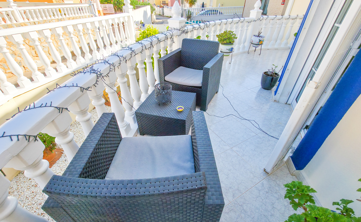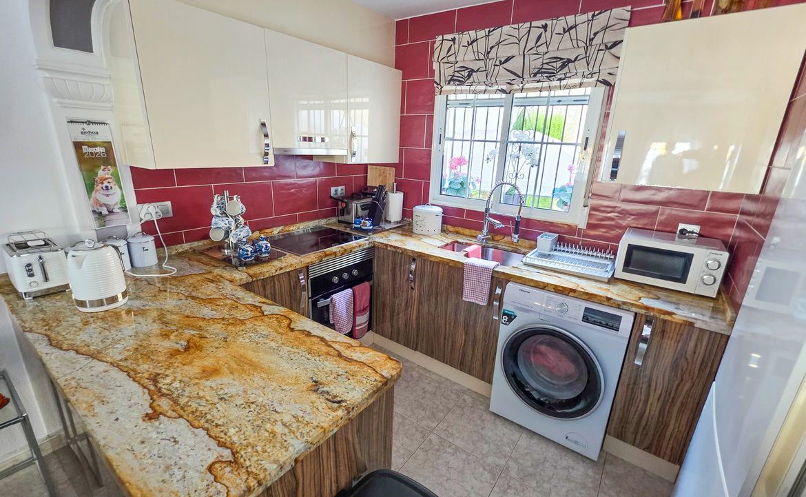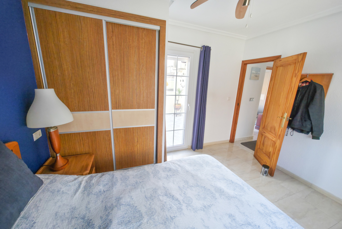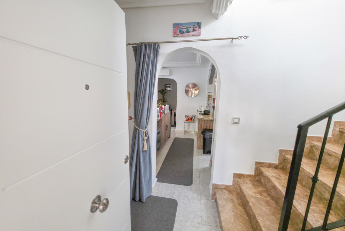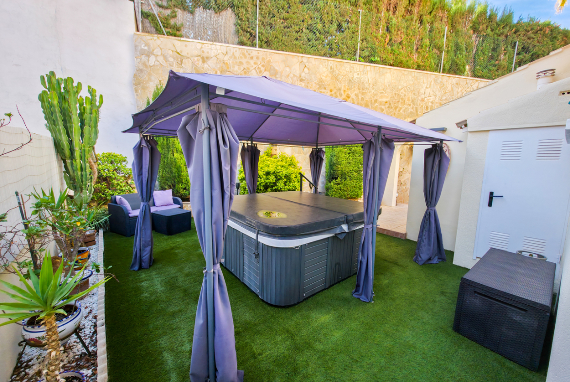 We are delighted to introduce you to this stunning detached villa located in El Galan, on the outskirts of Villamartin. This 3-bedroom, 2-bathroom villa is offered in exceptional condition and has air conditioning fitted throughout the home. There is a large selection of bars and restaurants including a 24-hour supermarket within walking distance from the property and within a 5-minute drive you can find the ever-popular Villamartin Plaza, La Fuente Commercial Centre and a choice of 3 superb Golf Courses.On entering the property into the bright hallway, you are greeted by the luxurious and spacious lounge with access out onto the front terrace, an open plan modern kitchen complete with marble worktops and a large bright dining room. Also on this level is a double bedroom with fitted wardrobes, a modern family bathroom with walk in shower and a storage cupboard. Moving upstairs there is a modern family bathroom and a further 2 double bedrooms with fitted wardrobes, both with separate access to the balcony area and rooftop solarium, where you can sunbathe all day long. The villa is offered part furnished (subject to offer).Outside, there is a huge private patio area with plenty of space for outside dining and entertaining friends and family in the glorious Spanish sun!!! Moving through the archway you arrive in the villa´s very own ‘Secret Garden’ complete with Jacuzzi hot tub, pergola and seating area, laid with artificial grass, providing the perfect ‘chill out’ zone to relax and sunbathe with a glass of wine or two. You have plenty of scope should you want to install your own private pool. There is also a storage room of 6m2 that could make an ideal workshop area, a covered driveway and wrap-around garden to the front of the villa.The current owners have spared no expense in maintaining this stunning home and we anticipate interest to be high so to avoid any disappointment, please contact us for more information, request a video or book your viewing.