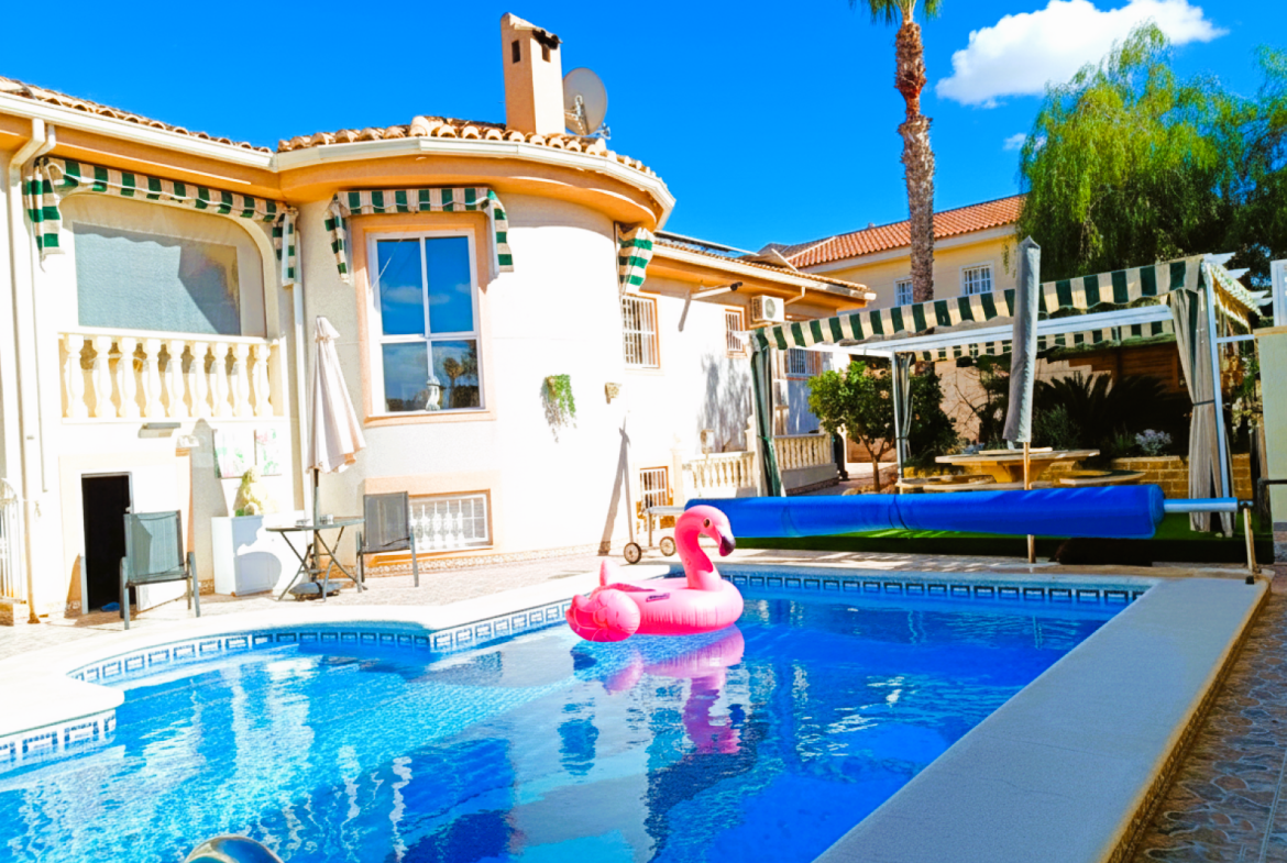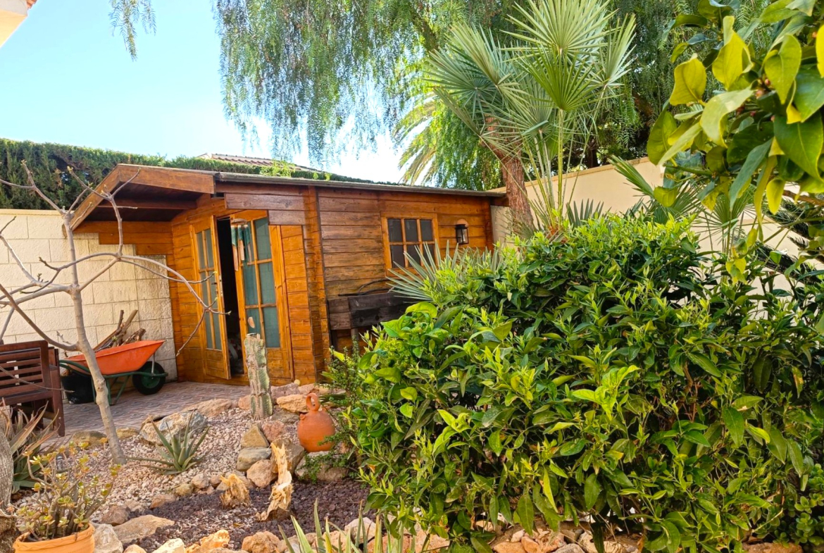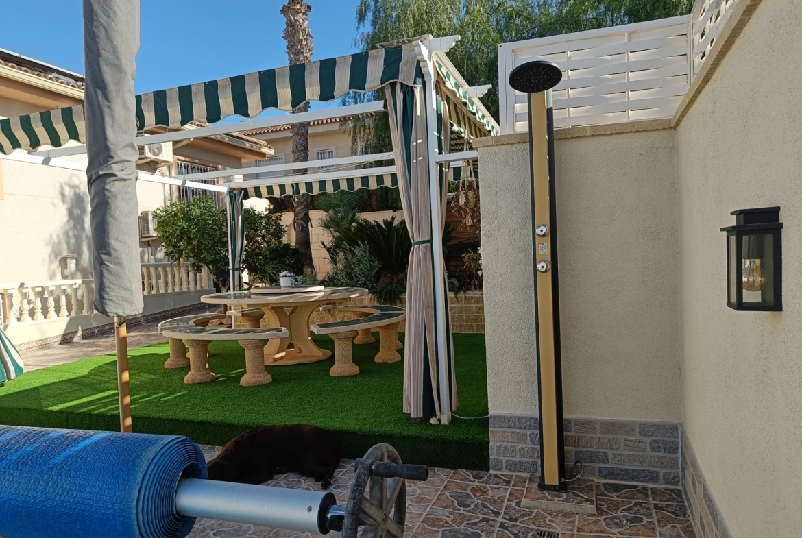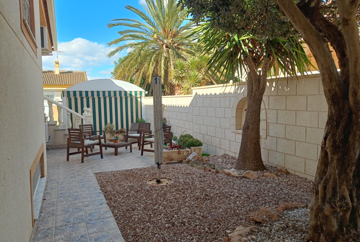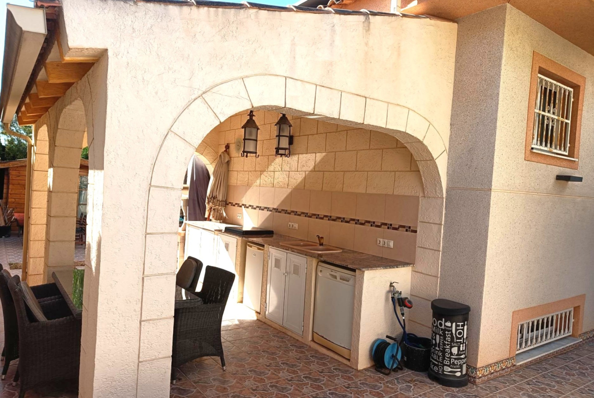 Benijofar 3 bed 2 bath Detached Villa for sale with Private swimming pool in private secluded gardens with lots of mature plants and trees with auto irrigation system, with al fresco dining/BBQ area and stunning views to Marquesa area of Quesada.