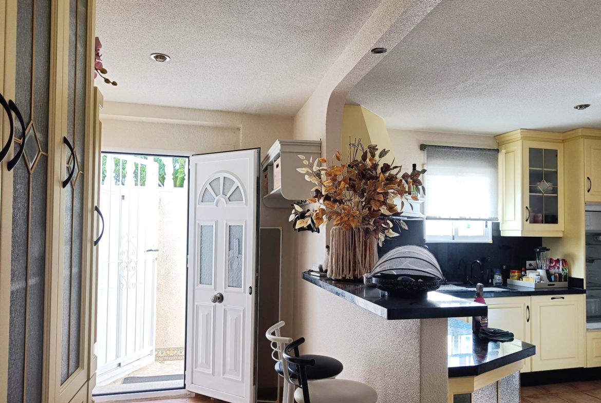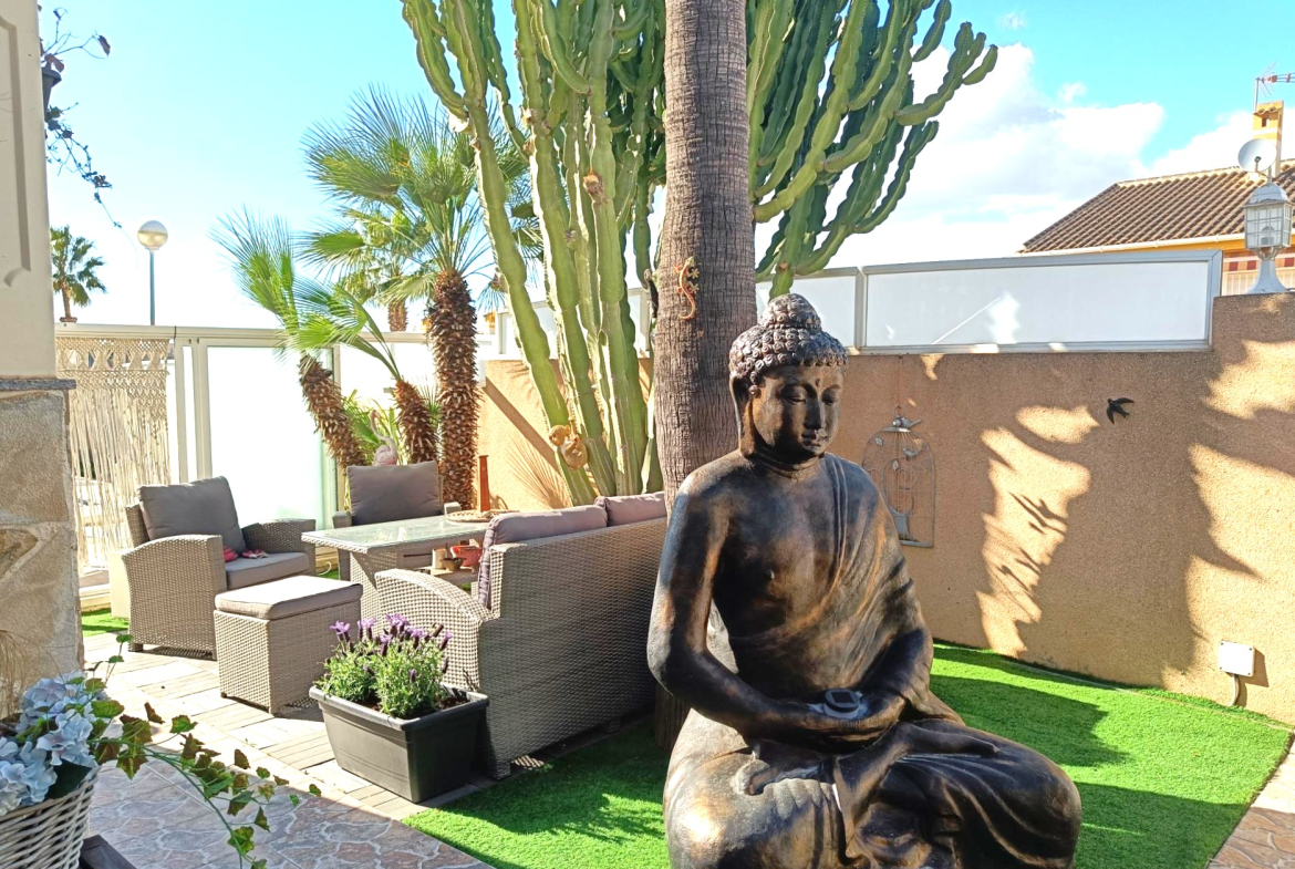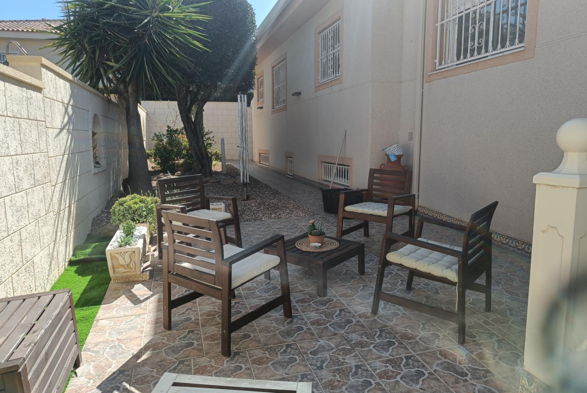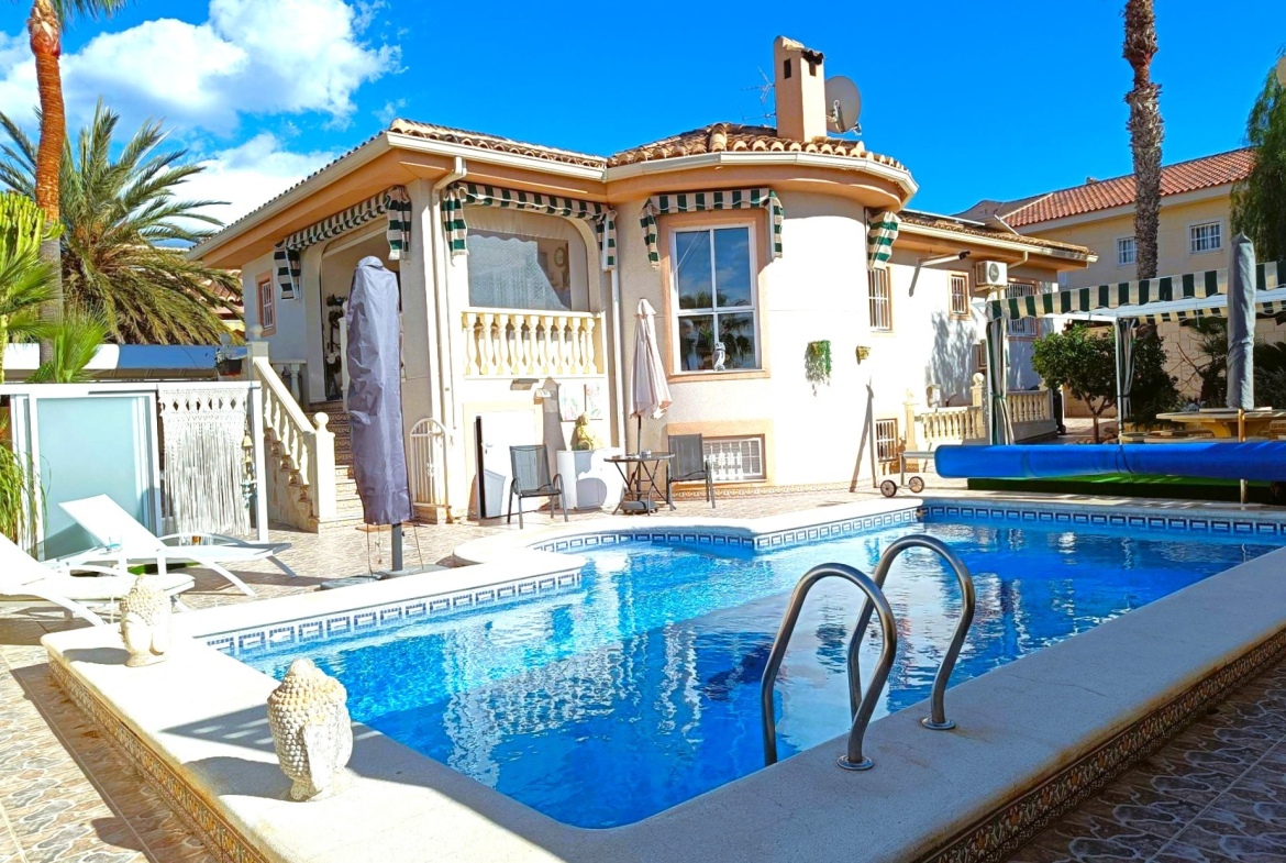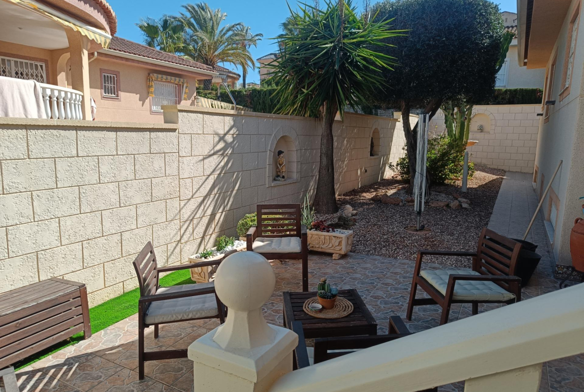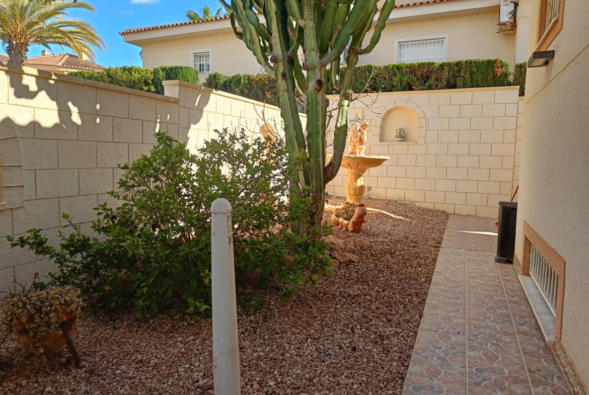 Benijofar 3 bed 2 bath Detached Villa for sale with Private swimming pool in private secluded gardens with lots of mature plants and trees with auto irrigation system, with al fresco dining/BBQ area and stunning views to Marquesa area of Quesada.