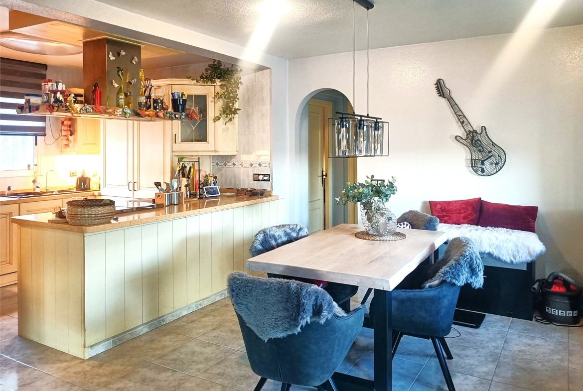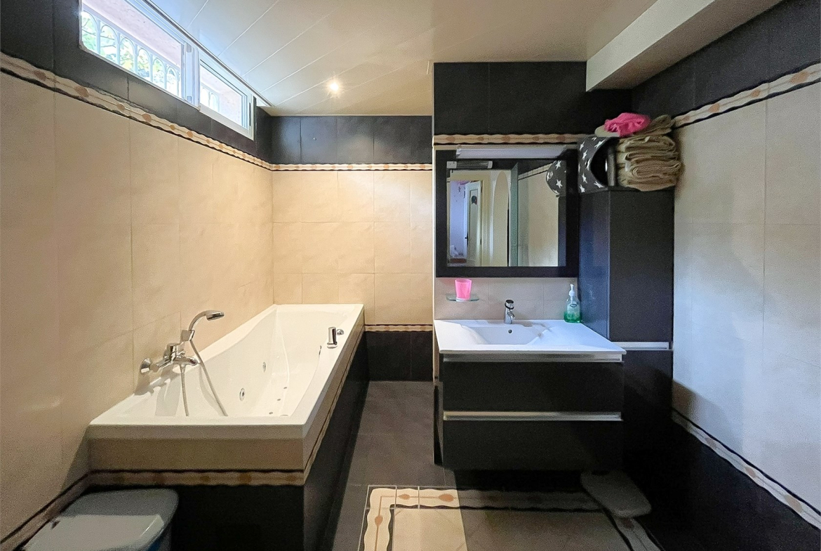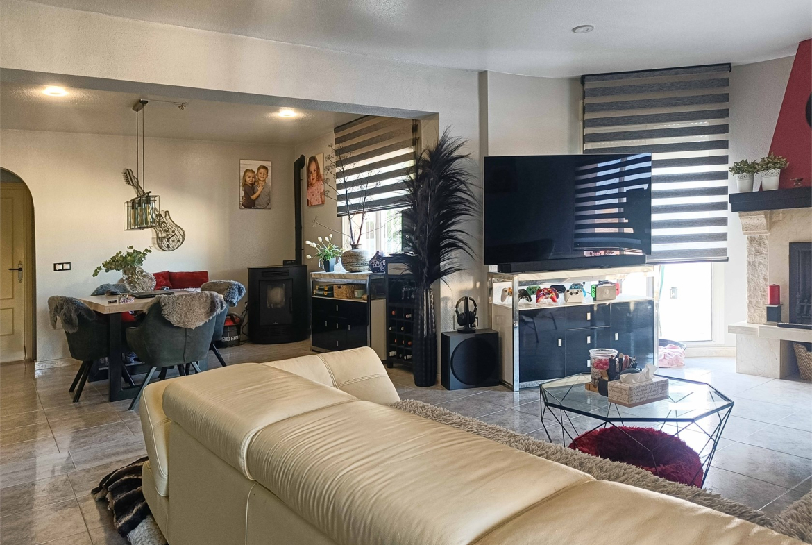 The upper floor is the heart of the home, featuring a spacious living room and lounge, a newly fitted kitchen, and a cozy atmosphere enhanced by a fireplace, pellet heating, and underfloor heating—which more than heats the whole house in winter. Practical features include solar panels for efficiency. The villa also boasts a vast basement, designed to impress with numerous possibilities for use.