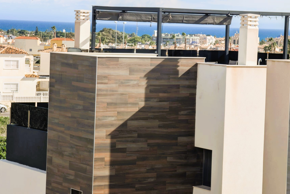 Amanecer Luxury Villa 4 beds 4 baths for sale in Lomas de Cabo Roig with private pool, underbuild and roof top solarium with sea views.Located within this secure gated complex close to the commercial centre for amenities and the bus for the blue flag beaches of Orihuela Costa.