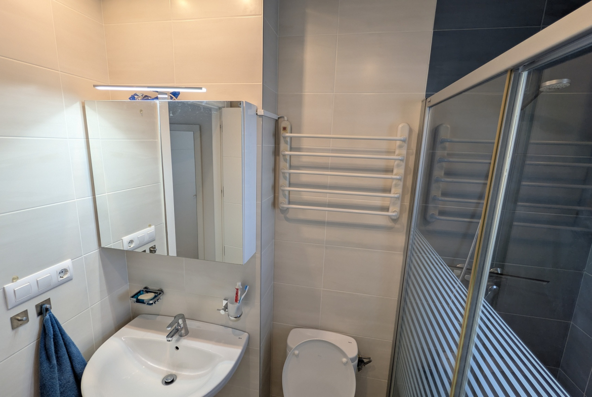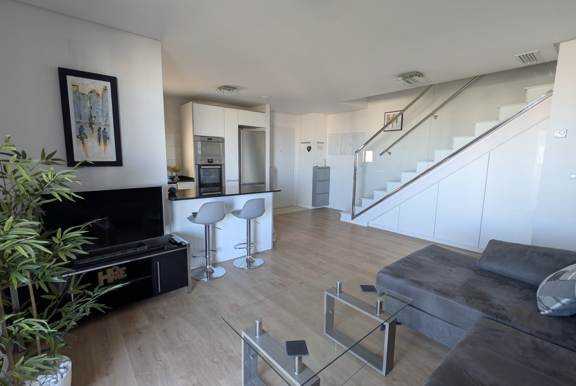 Discover unparalleled luxury and coastal living in this fantastic, top-floor penthouse located within the prestigious, gated community of Altos del Mediterraneo in Los Dolses, Villamartin. This stylish and spacious property offers 78 sqm of living space, complemented by a 16 sqm balcony featuring bi-fold glass curtains for year-round enjoyment of the stunning open sea views, and a magnificent 45 sqm private rooftop solarium with similar vistas. The apartment features two generously sized bedrooms with built-in wardrobes, including a master suite with a private en-suite bathroom.