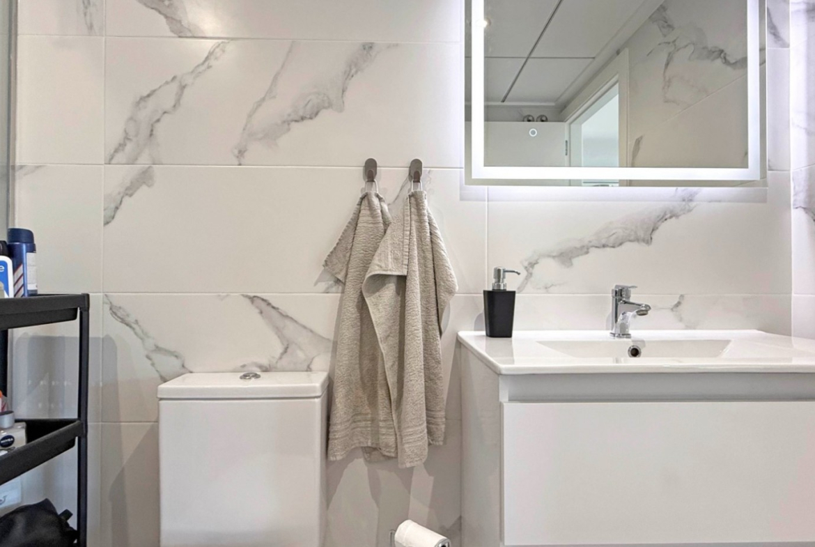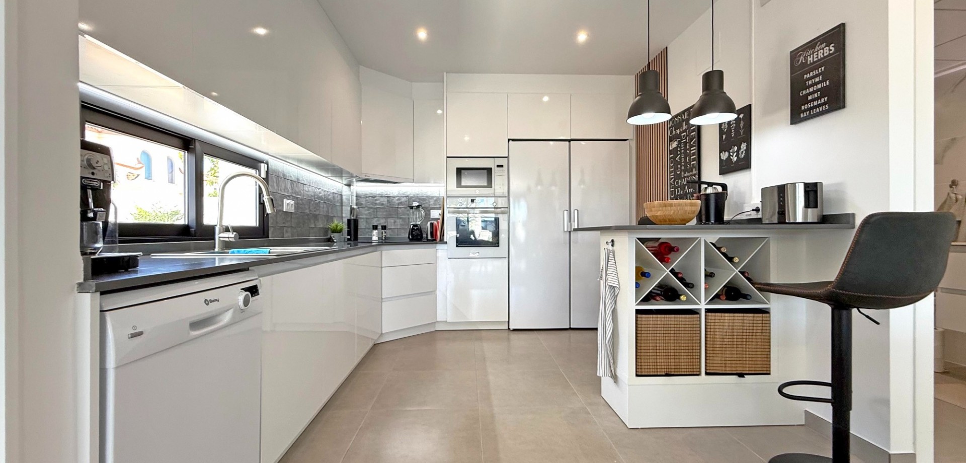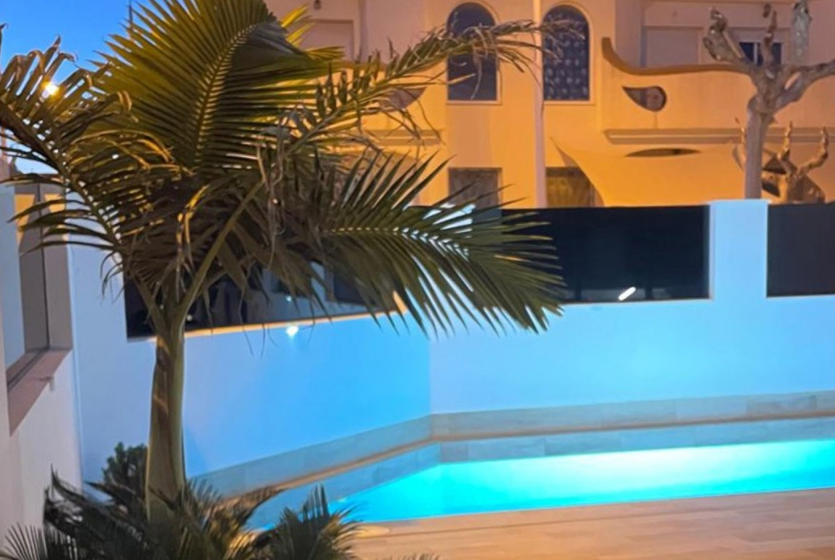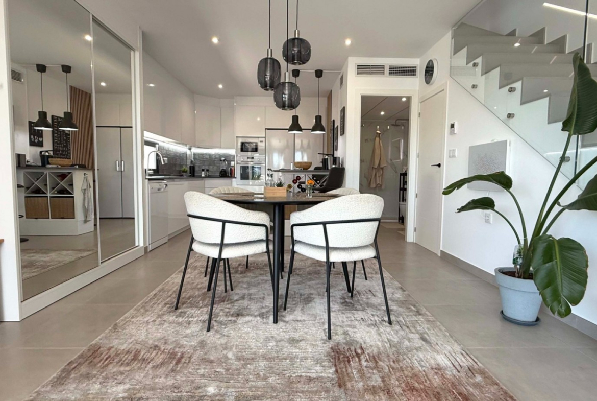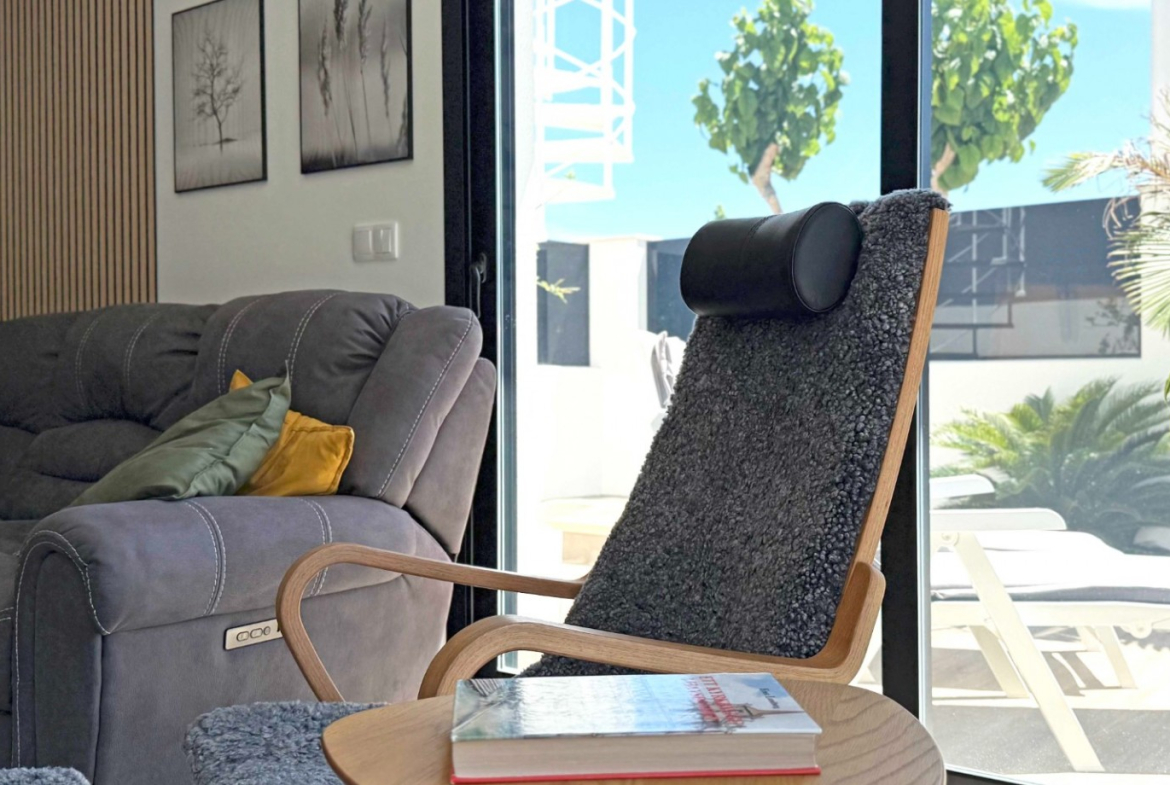 The villa boasts a bright and extended living room with direct access to the sun-drenched outdoor areas. A private balcony and a spacious roof terrace with a fully equipped outdoor kitchen, lighting, and a sleek pergola offer the perfect setting for entertaining or relaxing in the Spanish sun.