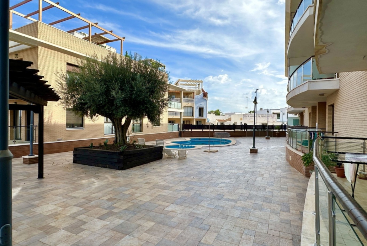 Spacious ground-floor apartment located just 1.1 km from the beach in the charming coastal town of Santiago de la Ribera.The property offers 3 bedrooms, 2 bathrooms, and includes a private garage space in the price.