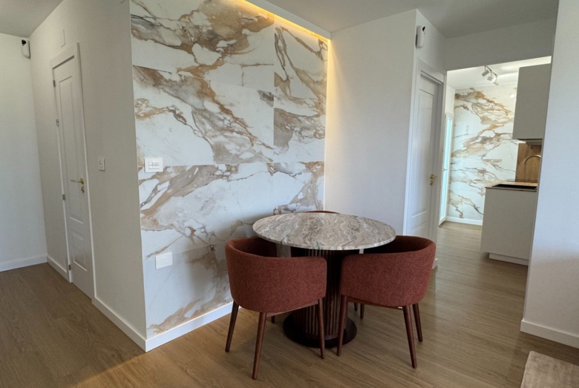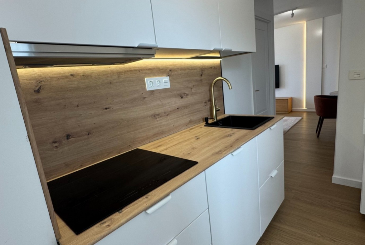 The interior features modern designer furniture, natural stone elements and large-format porcelain tiles. The fully equipped kitchen includes an induction hob and quality appliances. Comfort is ensured with inverter air conditioning with WiFi control, a programmable boiler and good insulation. The apartment is sold fully furnished and ready for immediate use.