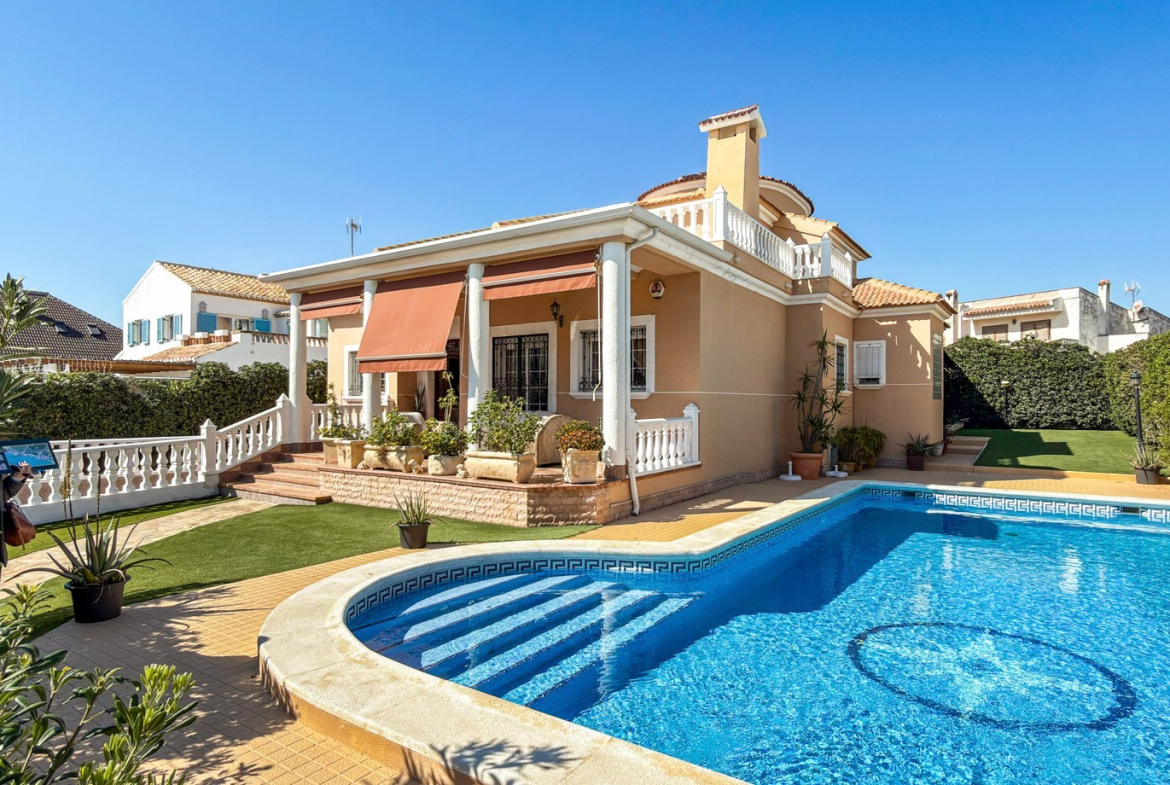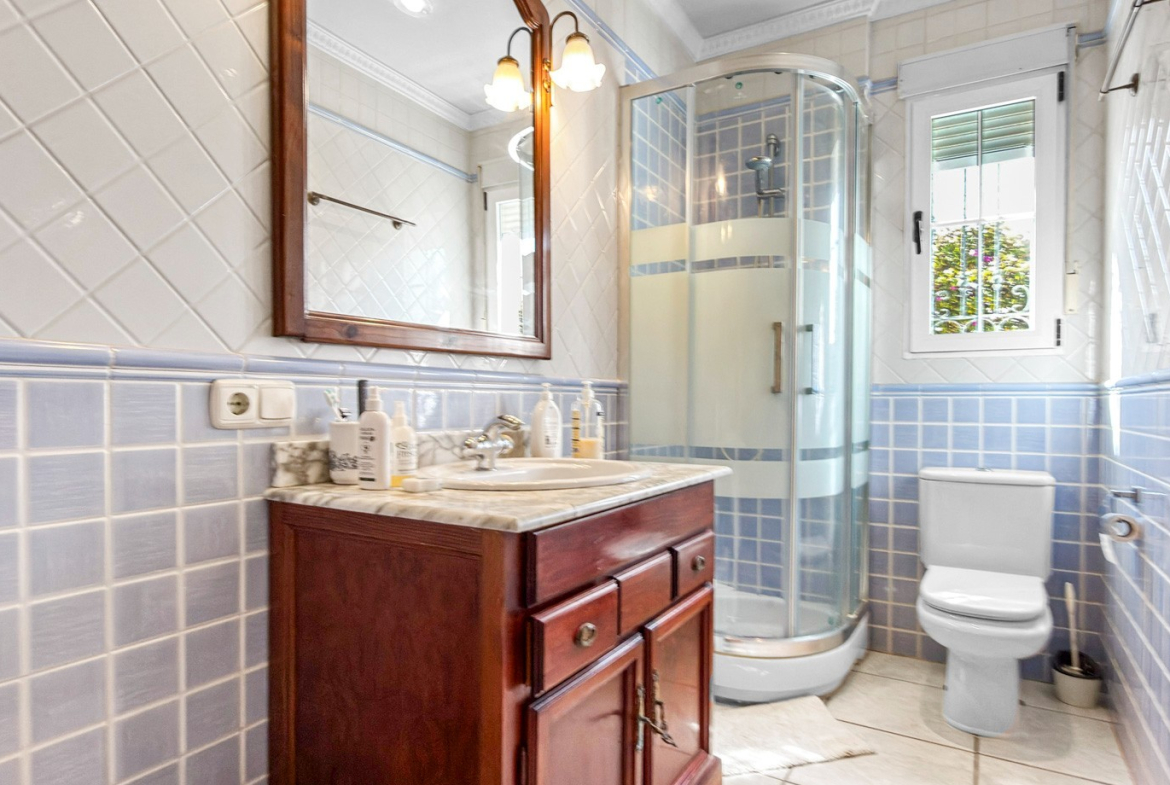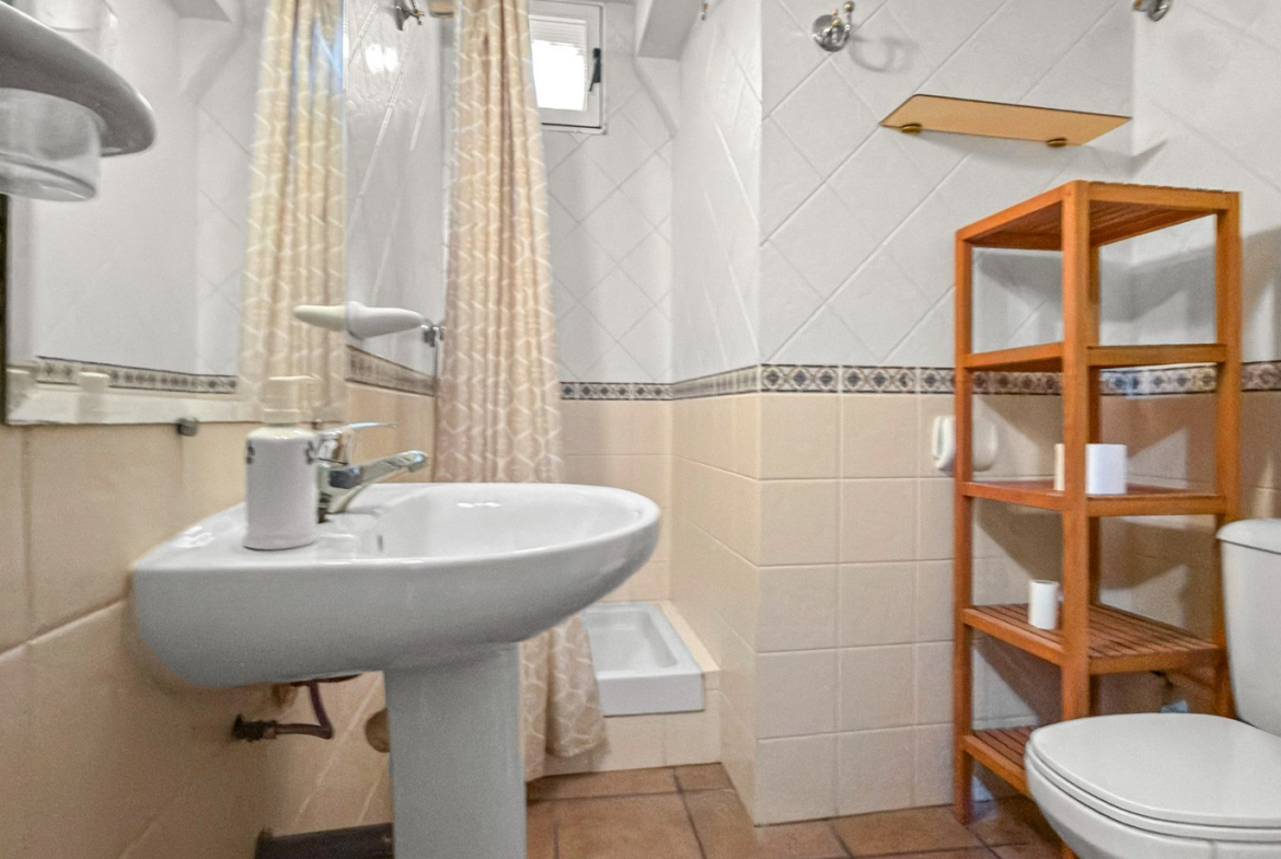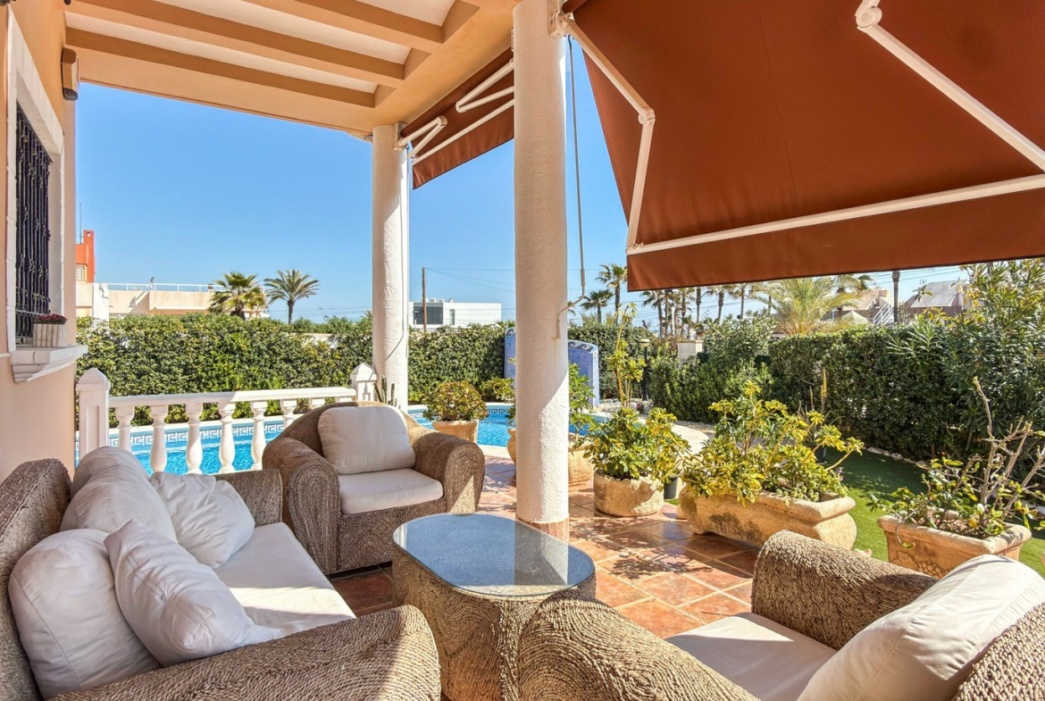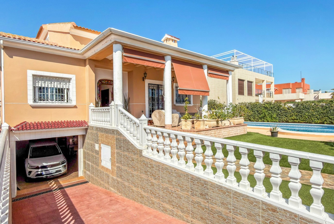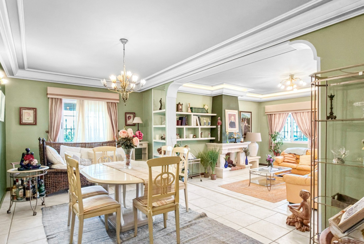 The outdoor areas truly elevate this property. A stunning private swimming pool is surrounded by a lush, landscaped garden, offering a peaceful and private retreat under the Mediterranean sun. A covered porch and pergola with a built-in barbecue create the perfect setting for unforgettable moments with family and friends.