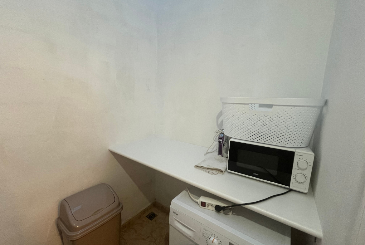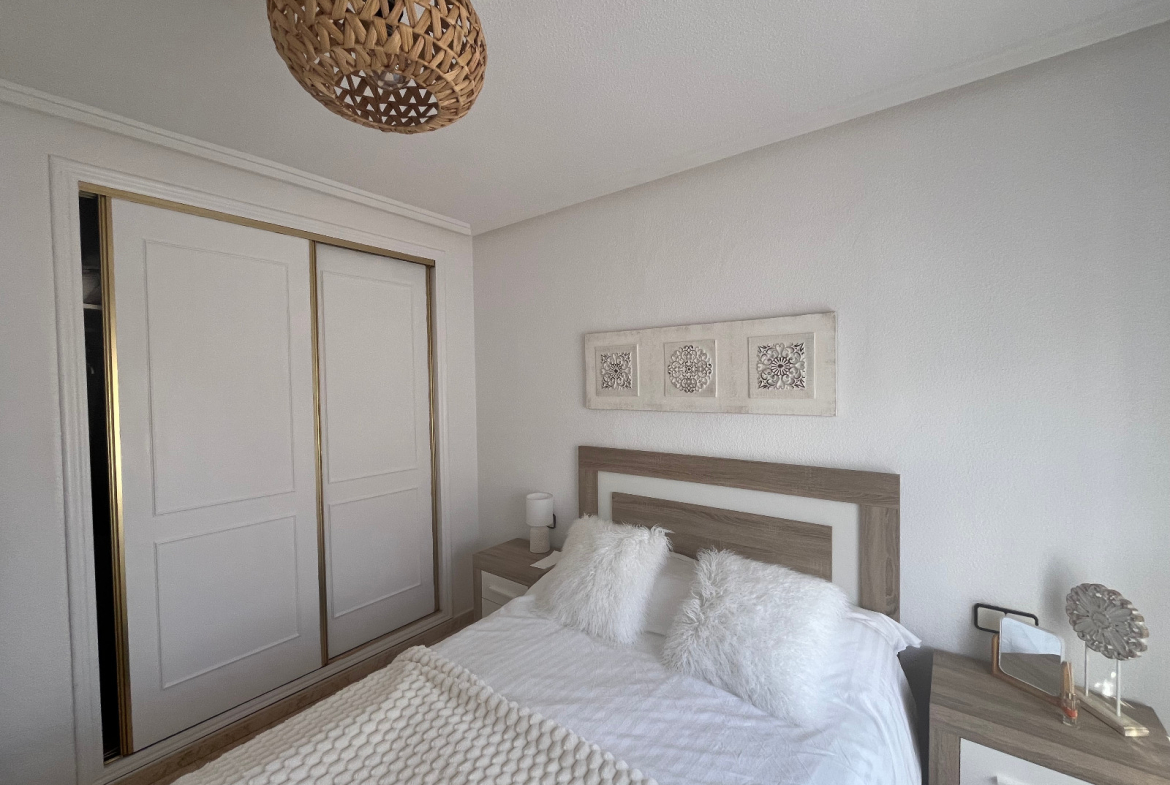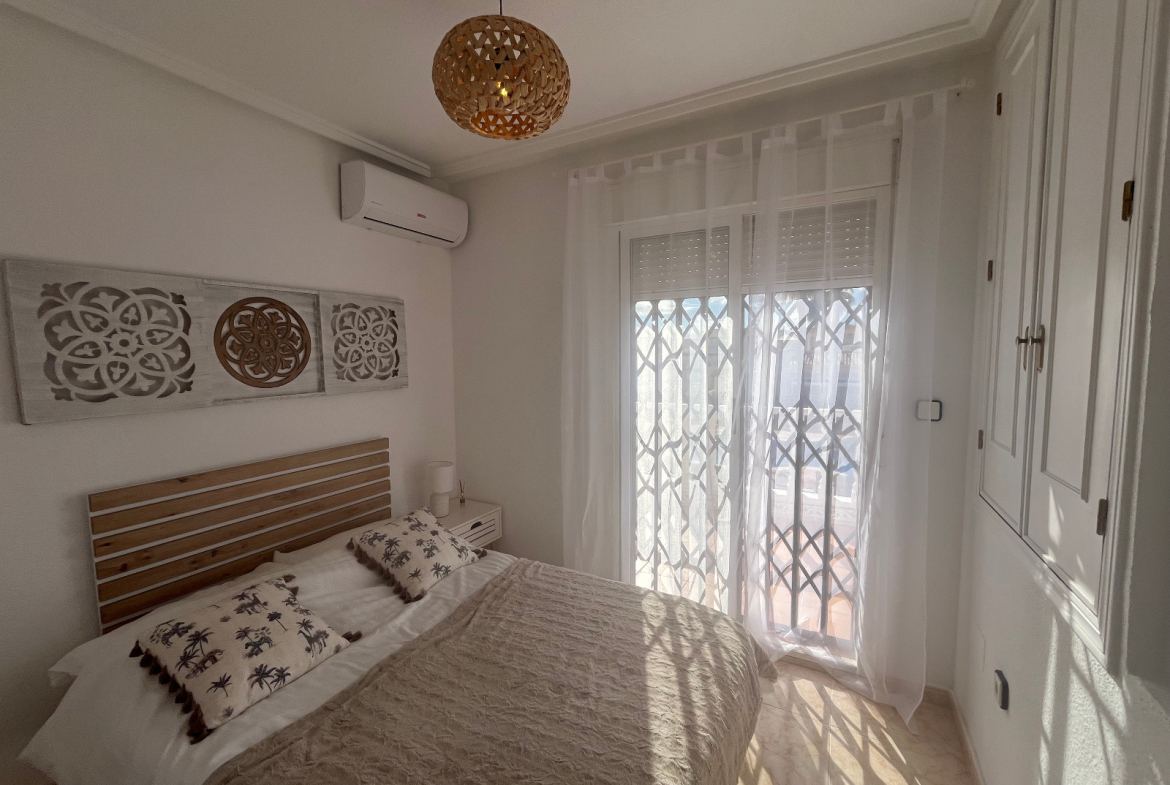 Internal stairs lead to the upper level, where you will find the main bedroom, featuring fitted wardrobes, newly fitted hot and cold A/C, and access to a private balcony with lovely views over the communal swimming pool. This floor also includes a shower room and an additional rear door that opens directly onto the private solarium, ideal for sunbathing, relaxing, or enjoying the Mediterranean climate.