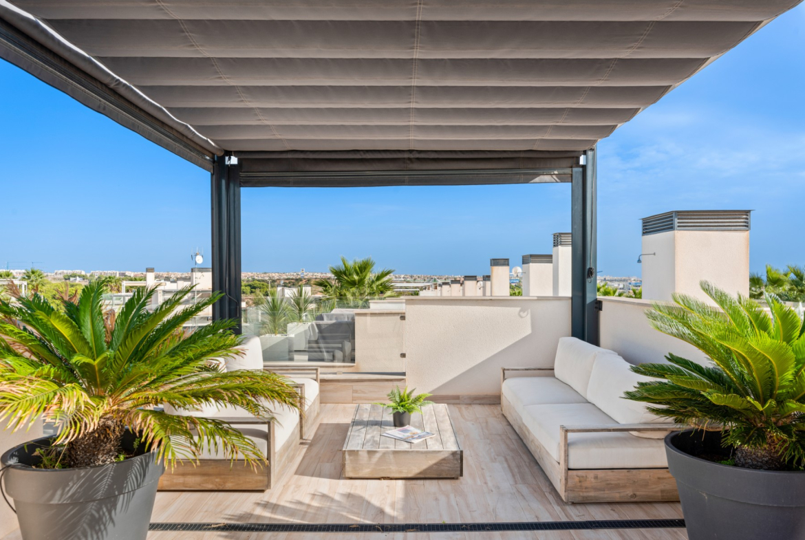 The house has a large outdoor area on the ground floor with sunbeds, sofa groups, dining area and lounge. Perfect property for people who want that little something extra. There is an outdoor kitchen with a sink, grill and space for a large dining table, which is often a meeting point for late evenings with good food. There is also a patch of garden which is perfect for the little ones as a playground. (artificial grass)