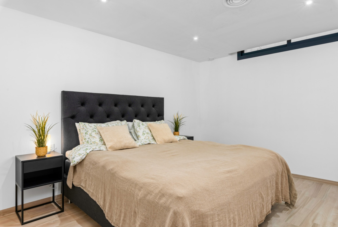 There are a total of 4 bedrooms with space for double beds and associated bathrooms. There is also a room in the basement today that can be used as a bedroom. This is used as a warehouse/storage as of today.