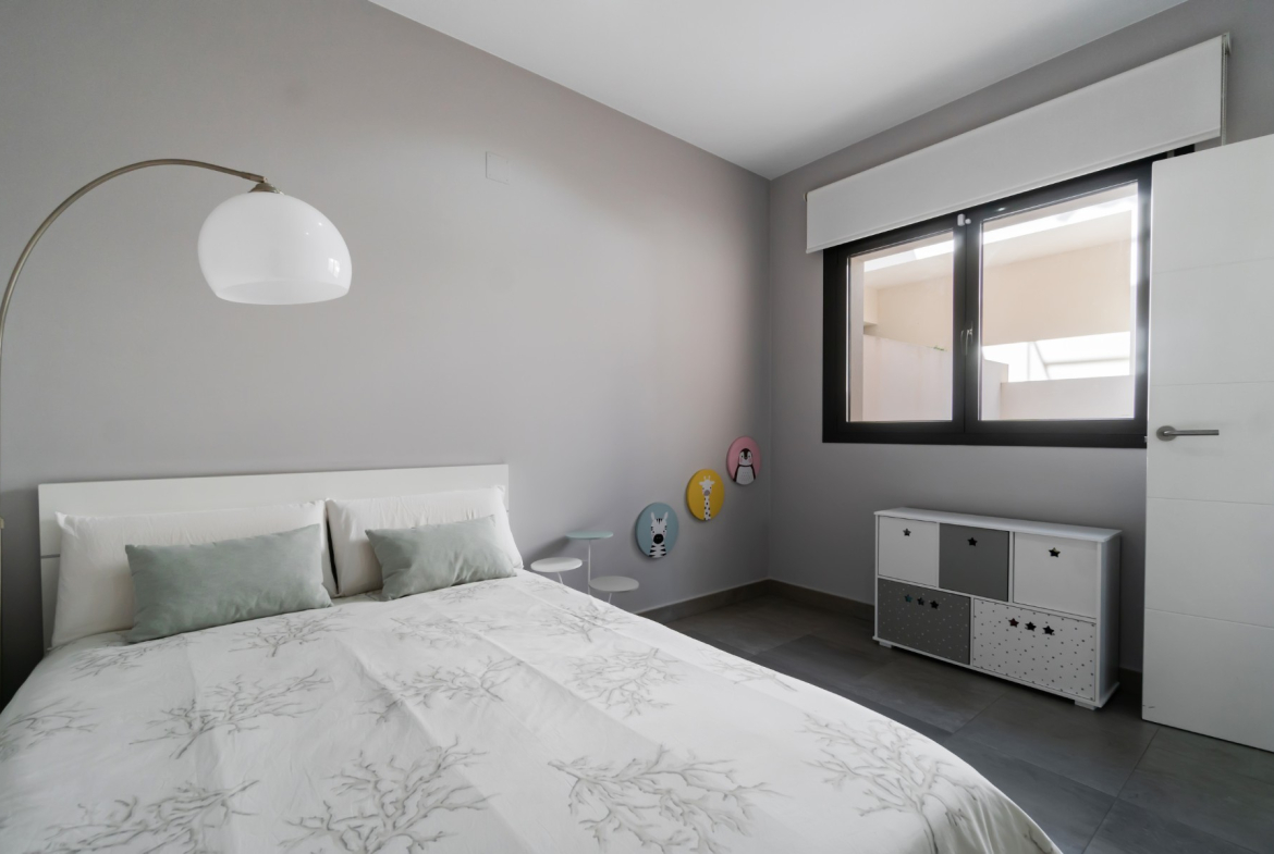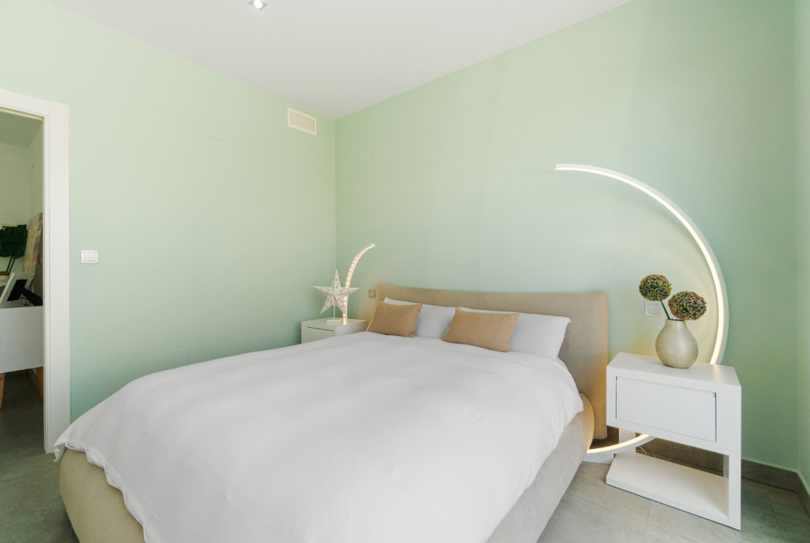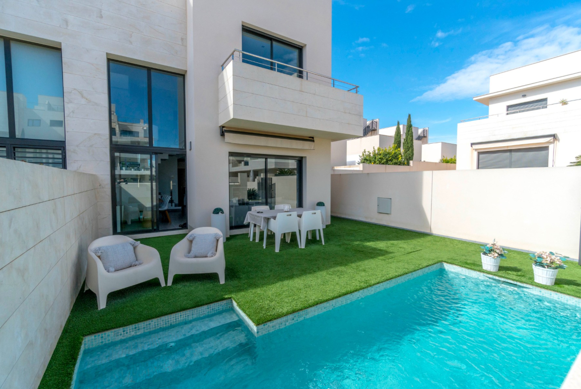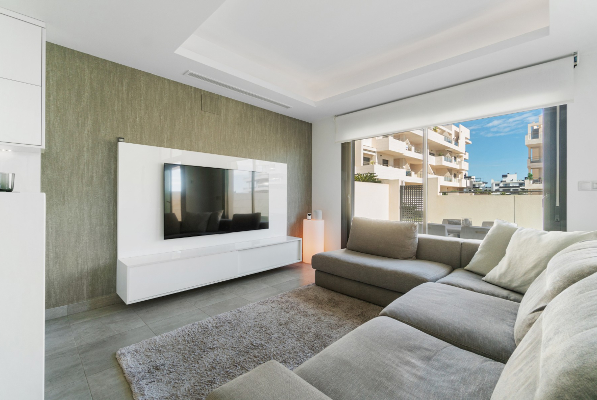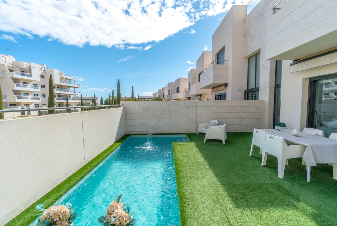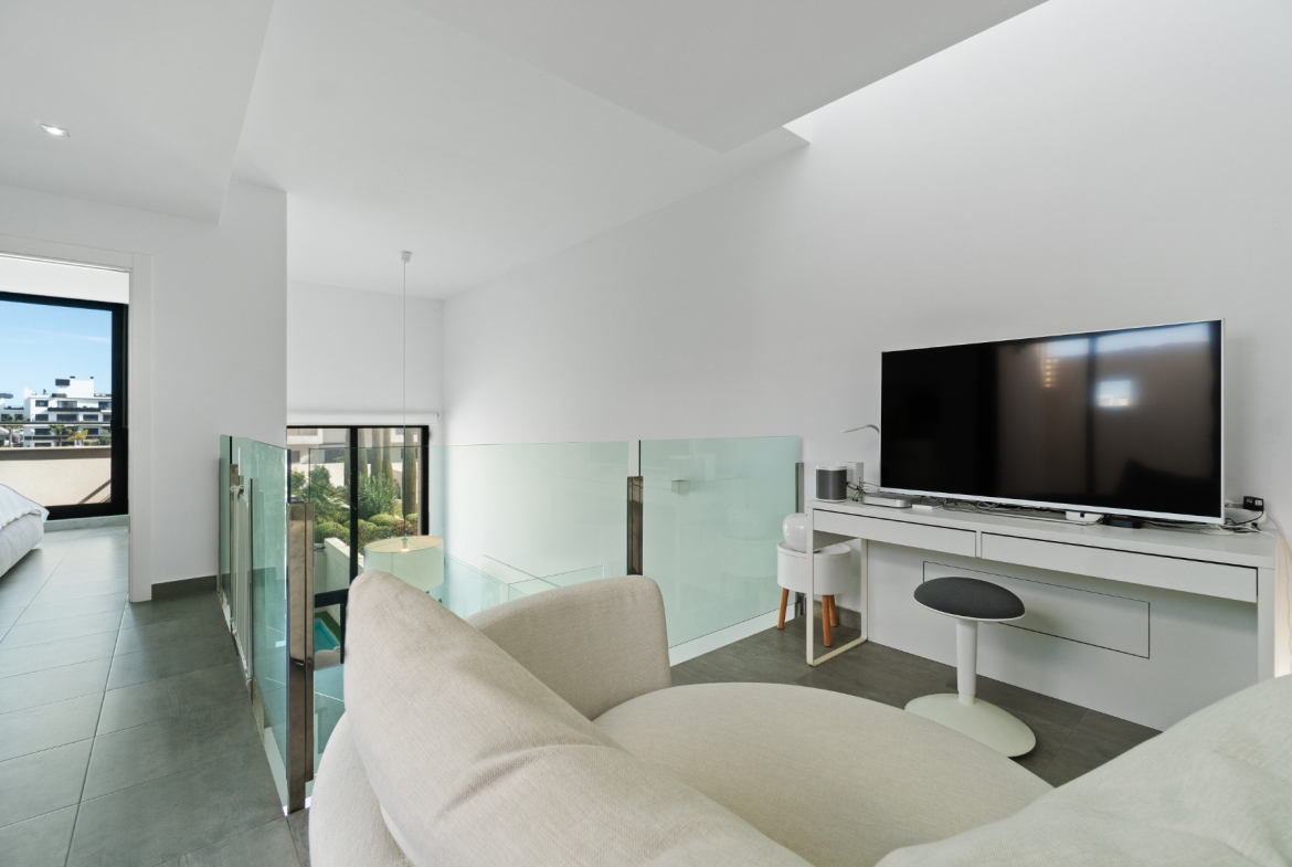 Do you want a fantastically beautiful villa in an attractive area? Then this one’s for you! This villa has 3 good sized bedrooms with built-in wardrobes, 2 bathrooms with a nice and stylish finish, large living room with double height ceilings and an elegant kitchen with a lush island! The property has many upgrades, so this is not a standard delivery from the developer. Here you will find, among other things, a pop-up socket in the kitchen island, light with hand sensor above the kitchen bench, marble shelves for shampoo etc in the showers, underfloor heating in the bathroom and in the living room, waterfalls in the pool and, in general, a very high standard! Here it comes with furniture from Procomobel, white goods from Siemens and Bosch, underground parking and a great view from the private roof terrace over a beautifully landscaped common area with green areas and heated pool!