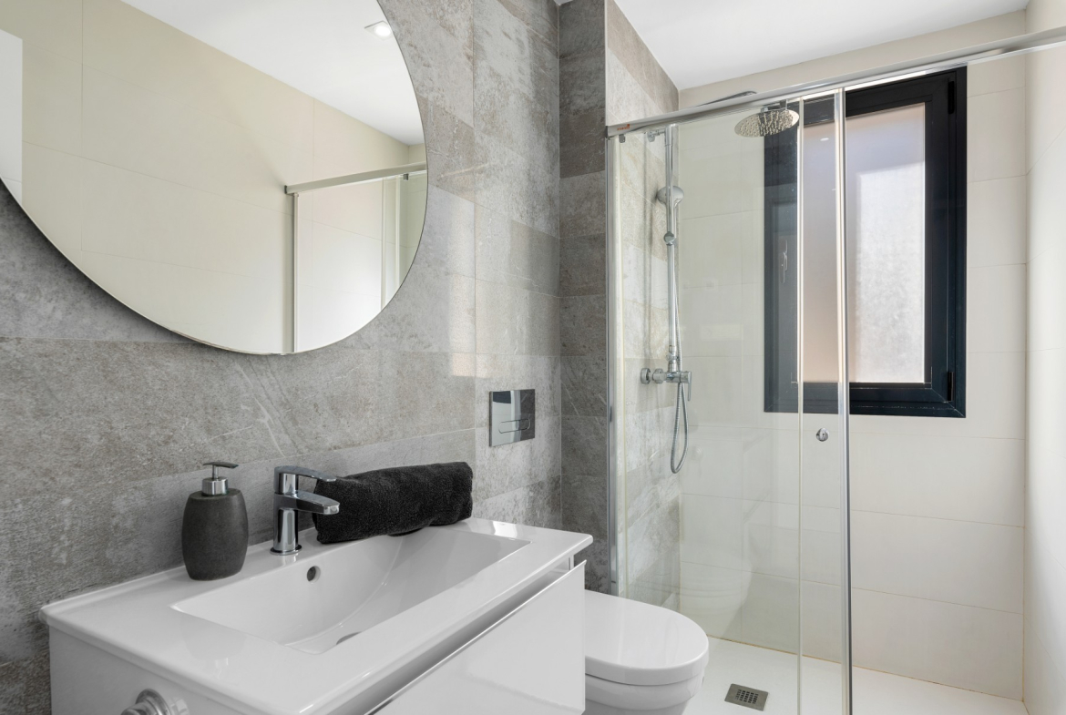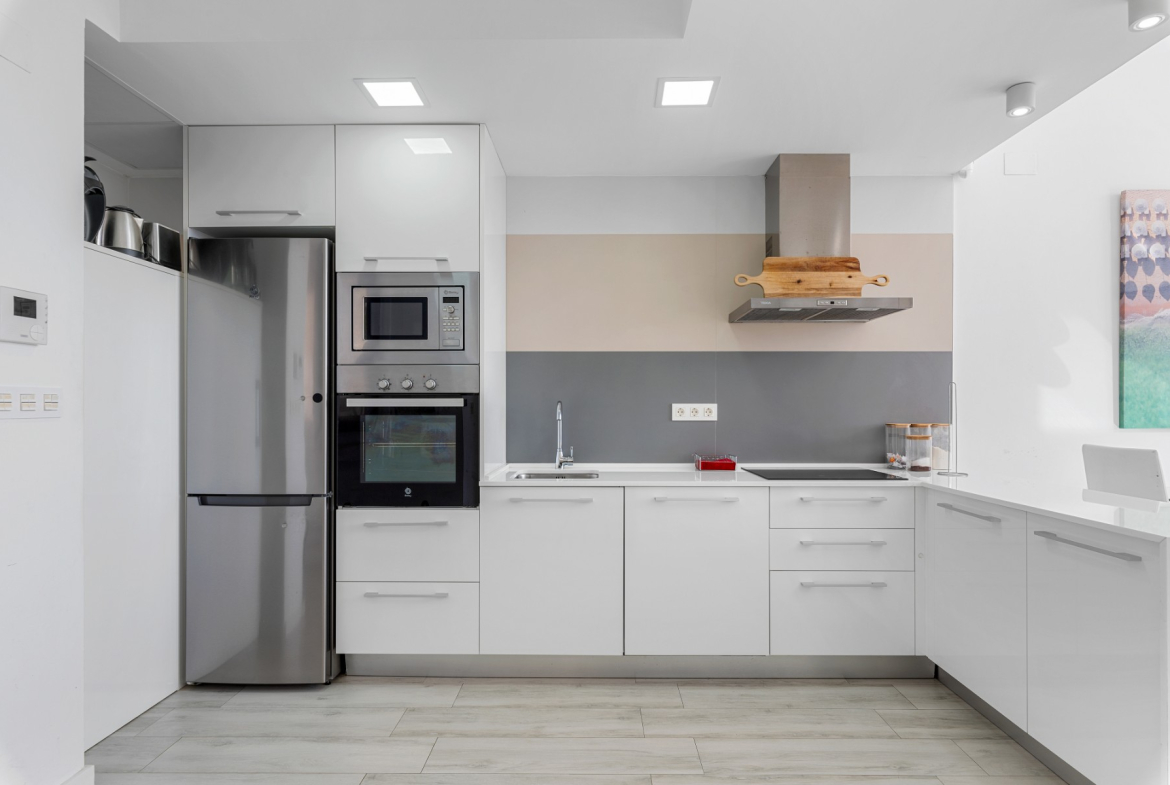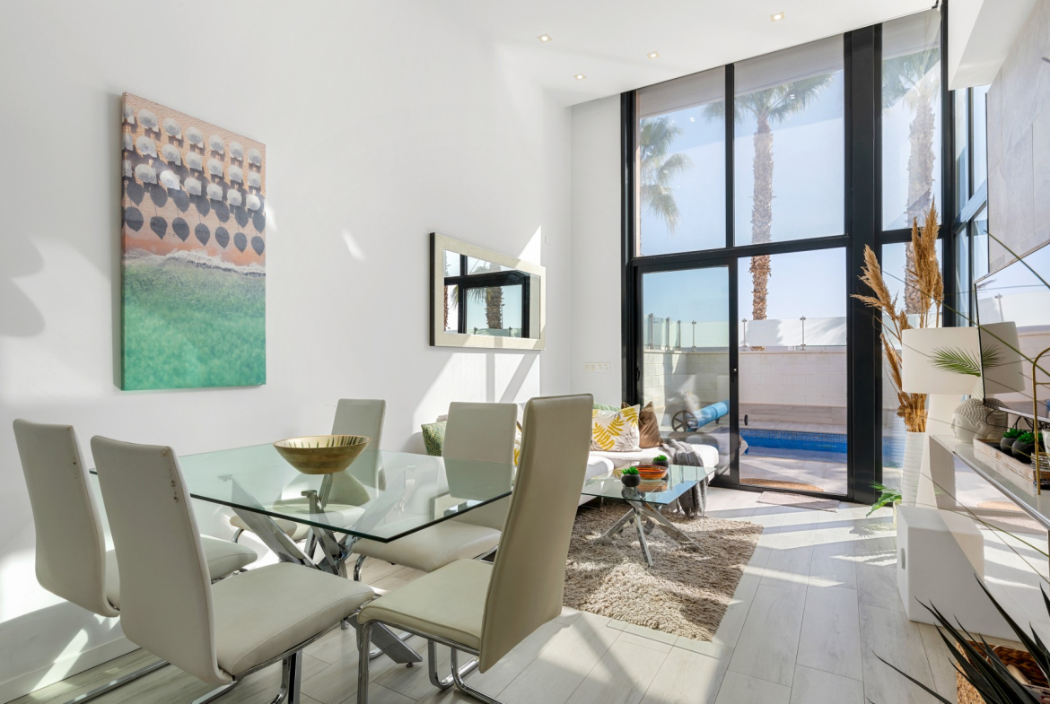 The villa features three generously sized bedrooms, perfect for accommodating family and guests alike with underfloor heating in the bathrooms, and ducted air-conditioning throughout. Entertaining is a delight with the villa’s open-plan living and dining areas with double height ceiling, seamlessly flowing into the modern kitchen equipped with high-end appliances. Large windows and sliding doors invite the Mediterranean sunshine indoors, creating a bright and inviting atmosphere.