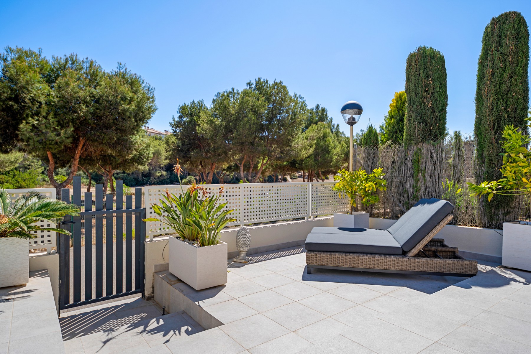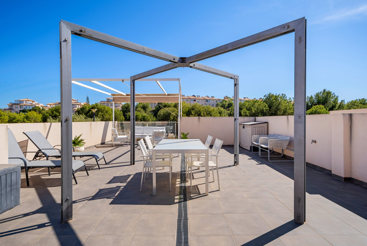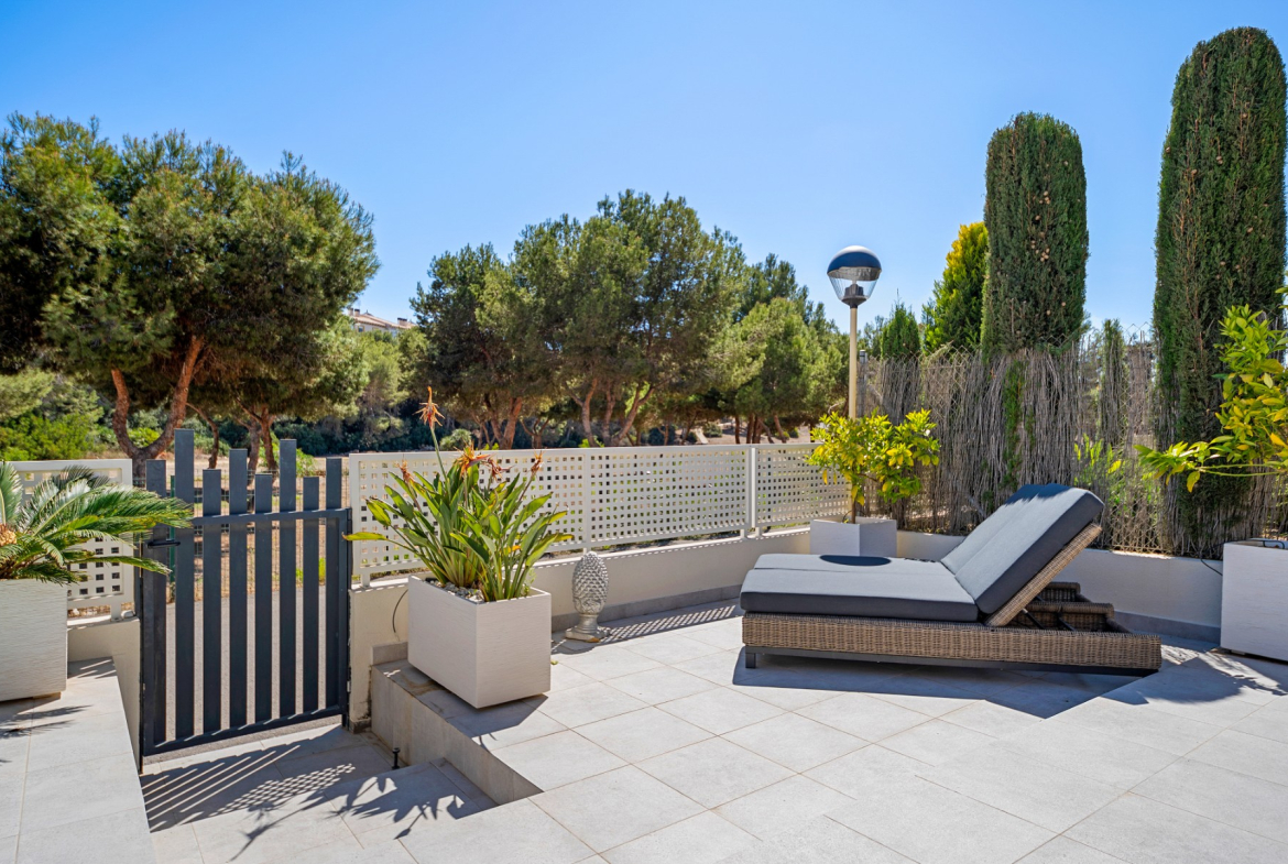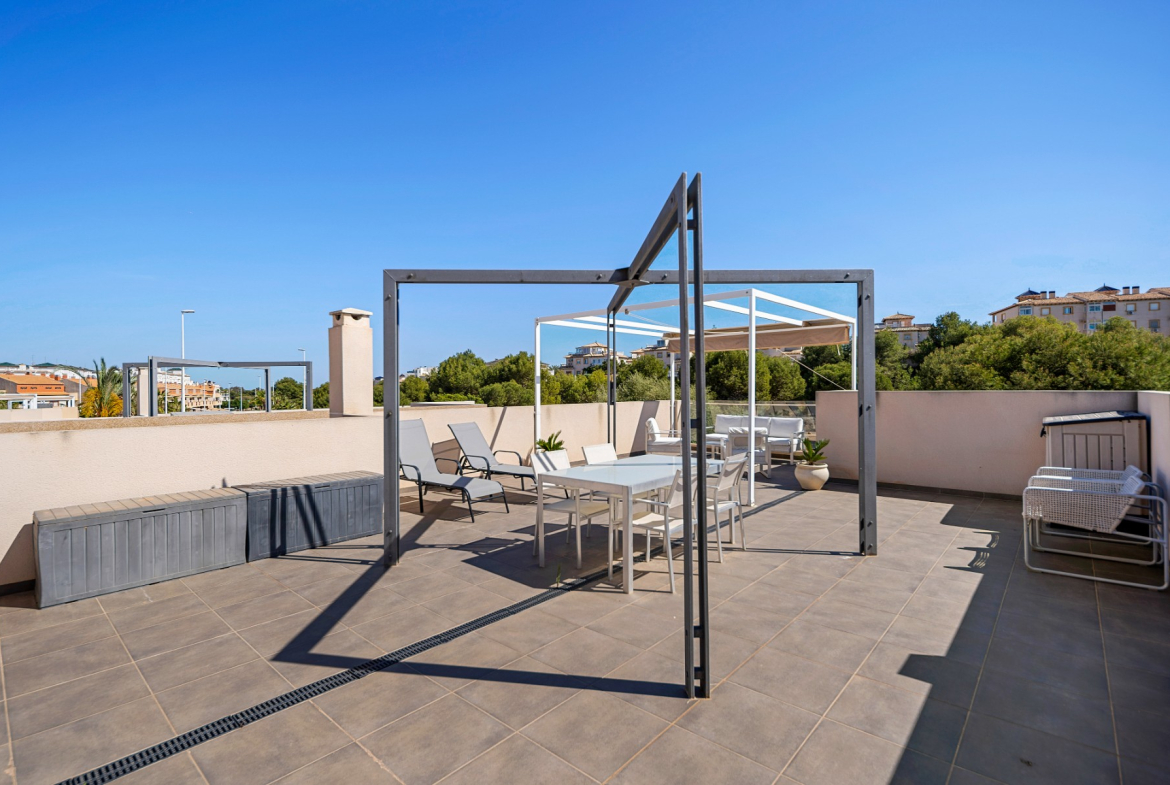 The highlight of this villa is the private solarium, perfect for soaking up the sun and enjoying panoramic views of the surrounding area. You can also find a pristine private swimming pool, an oasis for relaxation and entertainment. The villa is surrounded by 153m² of meticulously maintained space, offering ample room for outdoor dining, gardening, or simply unwinding in the Mediterranean climate.